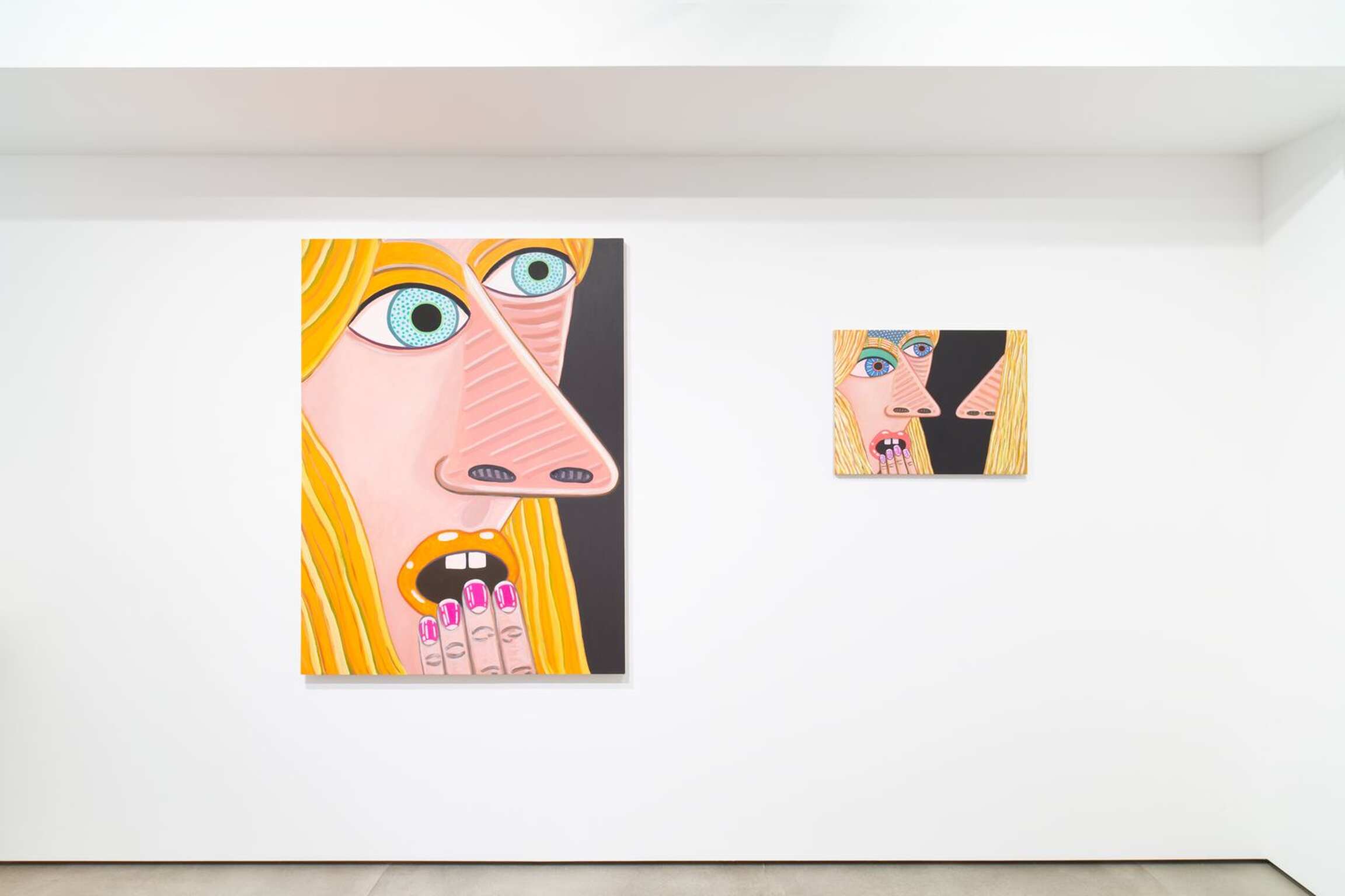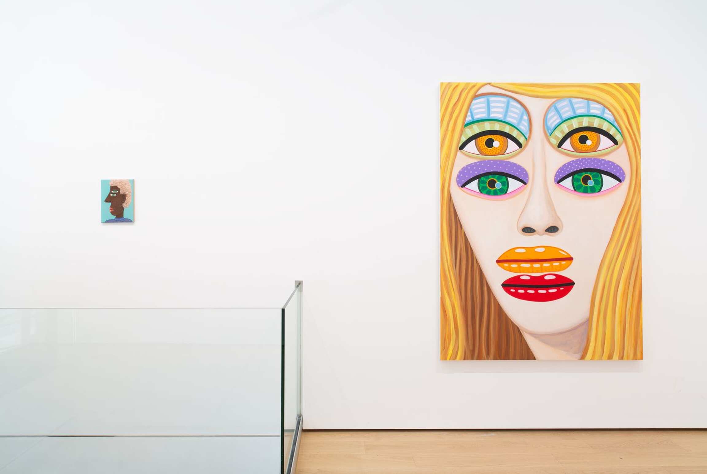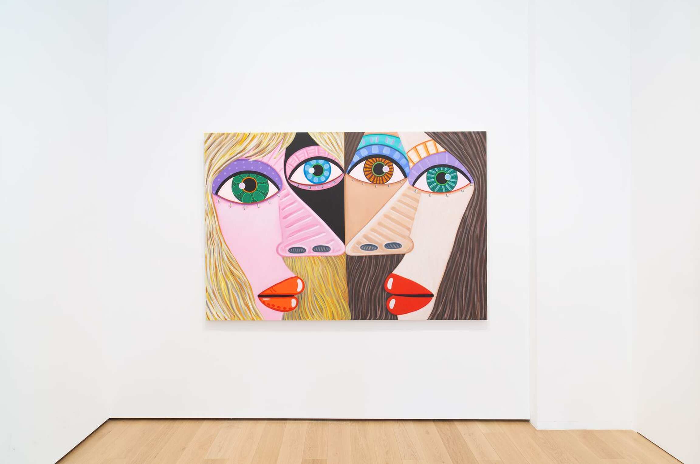 Au-delà des références évidentes, il apparait vite très clairement qu’ici, l’enjeu est l’exploration de la composition et de la couleur, les traits des visages servant de points d’ancrage ou de signifiants destinés à attirer l’attention du spectateur. Les éléments figuratifs ne sont que des instruments permettant d’explorer de manière plus formelle et abstraite ce qui constitue une peinture. Là où l’œil serait d’abord tenté de prendre Close Quarters pour une image en miroir, une observation plus attentive révèle une séquence de figures bien plus complexe, où une couleur ou une ligne ne répond pas exactement à l’autre, où le nombre de visages réellement représentés n’est pas si facile à déterminer. La symétrie est si fortement décalée qu’elle produit une sorte de vibration qui pourrait même s’avérer visuellement perturbante ou déstabilisante pour certains. Parfois, un visage compte des yeux ou des bouches en surnombre (Face Paint), ou les deux yeux sont représentés du même côté du visage (Bobbi, Big Scene) ; dans les scènes figurant plusieurs personnages, les carnations des visages servent plus à équilibrer la composition qu’à autre chose, comme on le voit clairement dans Big Scene. Une inspection plus attentive révèlera un large éventail d’effets graphiques et de motifs mis au service de sa quête constante de la composition parfaite, comme ces hachures et ces points souvent utilisés autour des yeux, ou le joli travail au pinceau qui sert à préciser le volume de certains visages (voir Robin, ou le travail délicat des cheveux sur Bobbi). Dans leur globalité, les dix peintures de cette exposition incarnent l’étendue des développements picturaux que Calvin a toujours explorés. Elles sont de formats divers : les deux plus petites, sur lin (Bobbi et Bonny) reprennent le motif classique (ou presque) d’un visage de profil qui se détache sur un fond de couleur uni, comme c’est aussi le cas pour Twilight Glow. Au contraire, les formats plus grands - comme Close Quarters, Big Scene ou Face Paint - créent un effet très resserré : la surface de la toile y est entièrement occupée par d’énormes visages. Les peintures de Calvin ont souvent été qualifiées d’incarnations de la coolitude, alors qu’en vérité leur effet général est plutôt étrange, mélange d’atti-rante bizarrerie et de radicalisme modeste dans lequel couleurs vives et lumineuses et visages géants stylisés entrent en collision pour attirer l’œil. Pour en arriver à ce stade accompli de sa carrière, Calvin n’a cessé de faire avancer la peinture jour après jour.