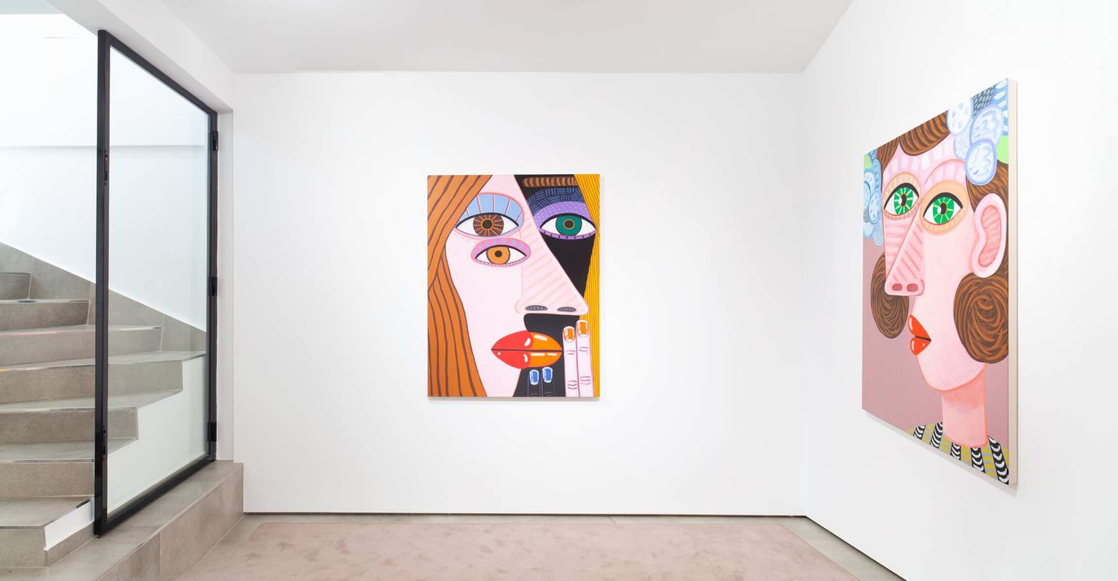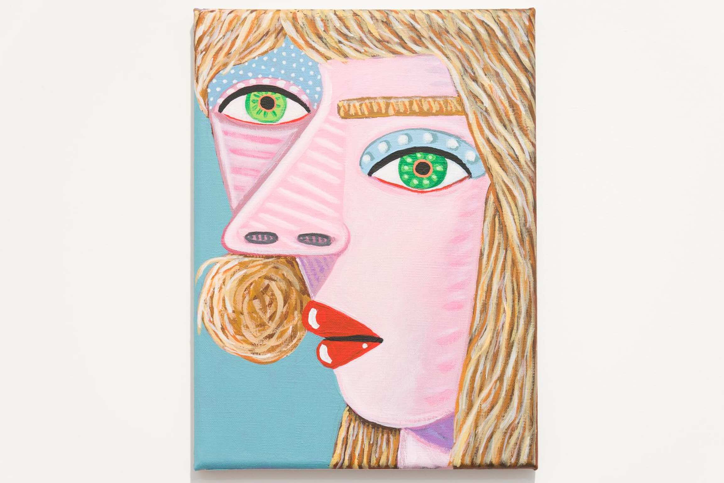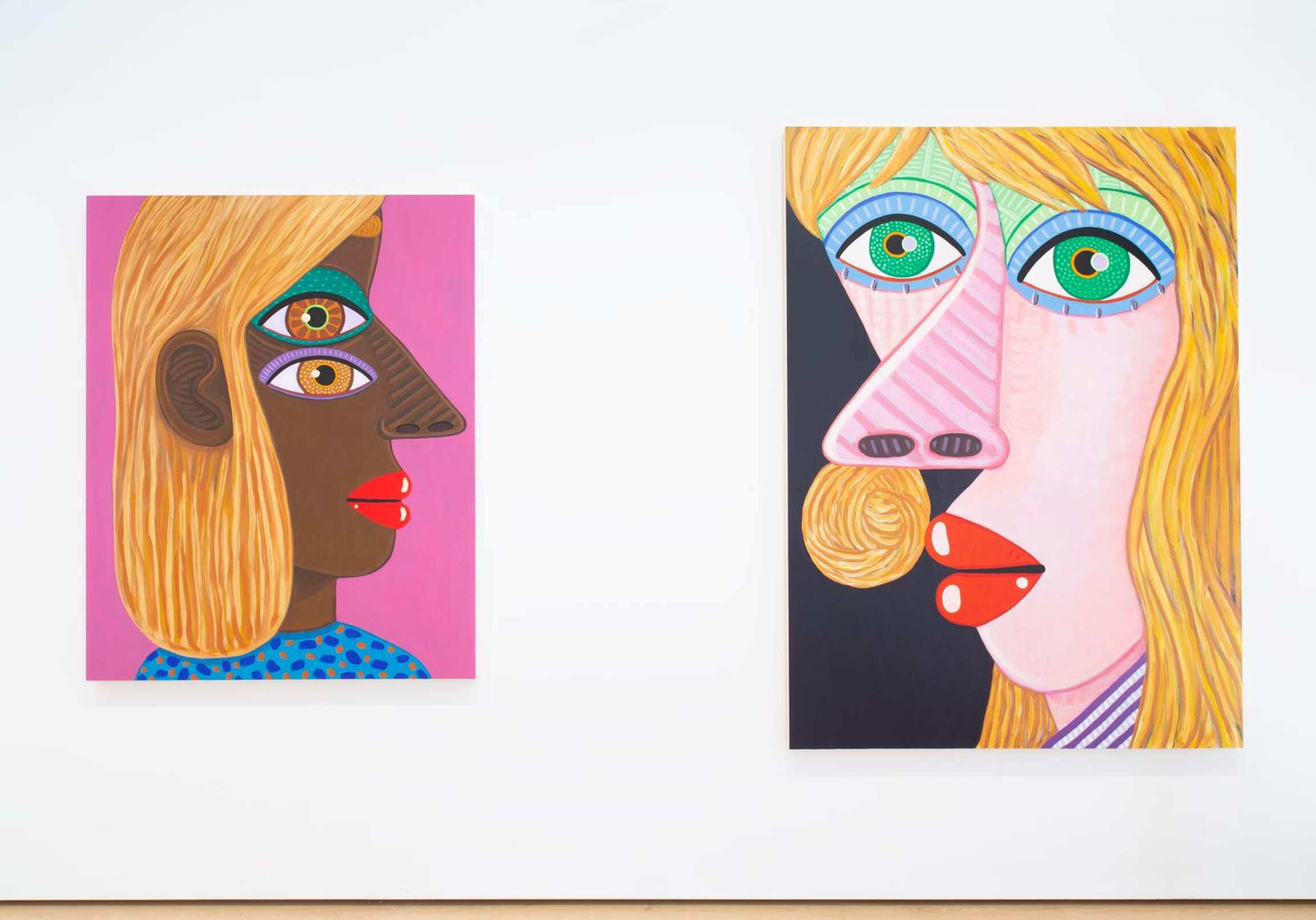 Au-delà des références évidentes, il apparait vite très clairement qu’ici, l’enjeu est l’exploration de la composition et de la couleur, les traits des visages servant de points d’ancrage ou de signifiants destinés à attirer l’attention du spectateur. Les éléments figuratifs ne sont que des instruments permettant d’explorer de manière plus formelle et abstraite ce qui constitue une peinture. Là où l’œil serait d’abord tenté de prendre Close Quarters pour une image en miroir, une observation plus attentive révèle une séquence de figures bien plus complexe, où une couleur ou une ligne ne répond pas exactement à l’autre, où le nombre de visages réellement représentés n’est pas si facile à déterminer. La symétrie est si fortement décalée qu’elle produit une sorte de vibration qui pourrait même s’avérer visuellement perturbante ou déstabilisante pour certains. Parfois, un visage compte des yeux ou des bouches en surnombre (Face Paint), ou les deux yeux sont représentés du même côté du visage (Bobbi, Big Scene) ; dans les scènes figurant plusieurs personnages, les carnations des visages servent plus à équilibrer la composition qu’à autre chose, comme on le voit clairement dans Big Scene. Une inspection plus attentive révèlera un large éventail d’effets graphiques et de motifs mis au service de sa quête constante de la composition parfaite, comme ces hachures et ces points souvent utilisés autour des yeux, ou le joli travail au pinceau qui sert à préciser le volume de certains visages (voir Robin, ou le travail délicat des cheveux sur Bobbi). Dans leur globalité, les dix peintures de cette exposition incarnent l’étendue des développements picturaux que Calvin a toujours explorés. Elles sont de formats divers : les deux plus petites, sur lin (Bobbi et Bonny) reprennent le motif classique (ou presque) d’un visage de profil qui se détache sur un fond de couleur uni, comme c’est aussi le cas pour Twilight Glow. Au contraire, les formats plus grands - comme Close Quarters, Big Scene ou Face Paint - créent un effet très resserré : la surface de la toile y est entièrement occupée par d’énormes visages. Les peintures de Calvin ont souvent été qualifiées d’incarnations de la coolitude, alors qu’en vérité leur effet général est plutôt étrange, mélange d’atti-rante bizarrerie et de radicalisme modeste dans lequel couleurs vives et lumineuses et visages géants stylisés entrent en collision pour attirer l’œil. Pour en arriver à ce stade accompli de sa carrière, Calvin n’a cessé de faire avancer la peinture jour après jour.