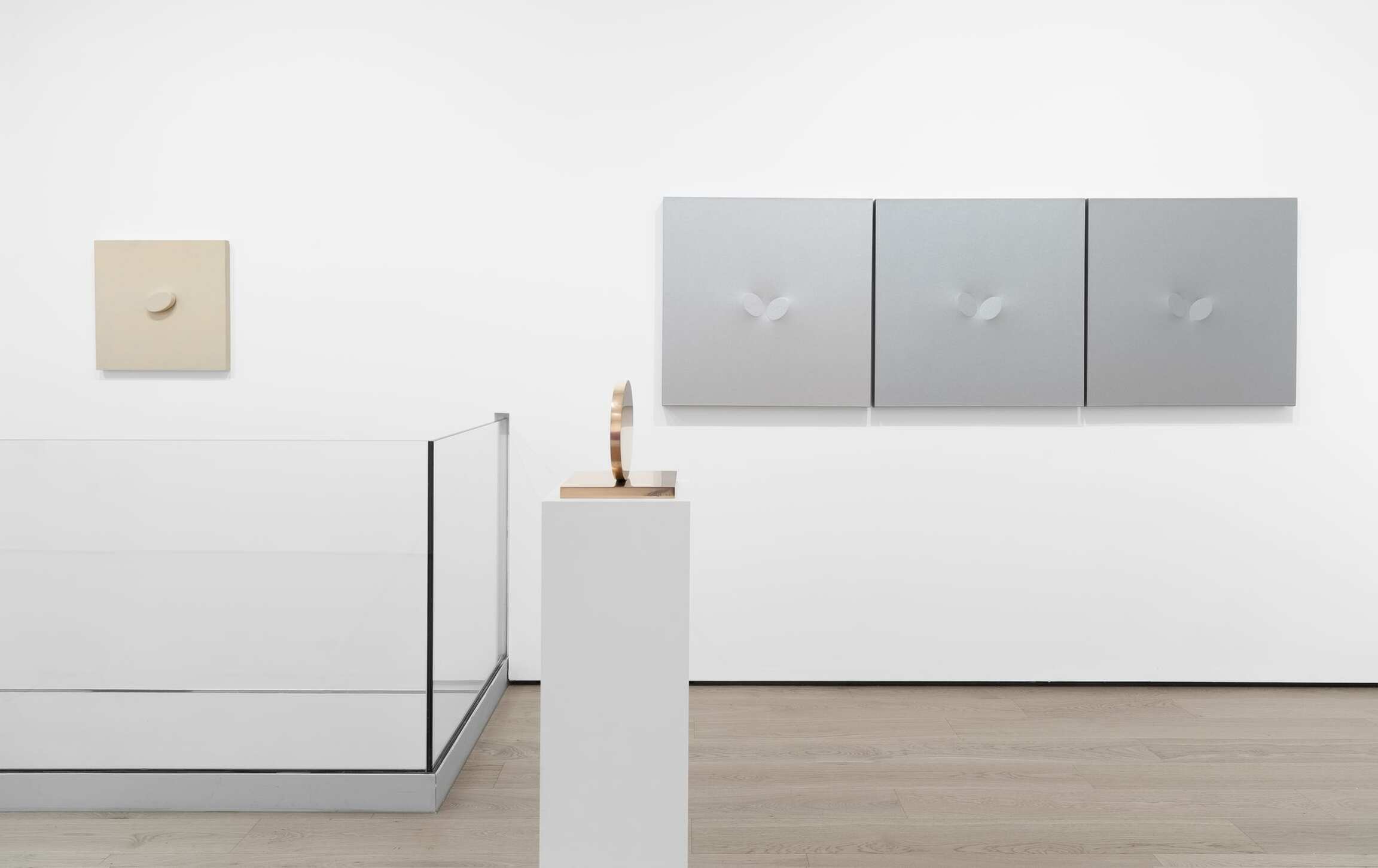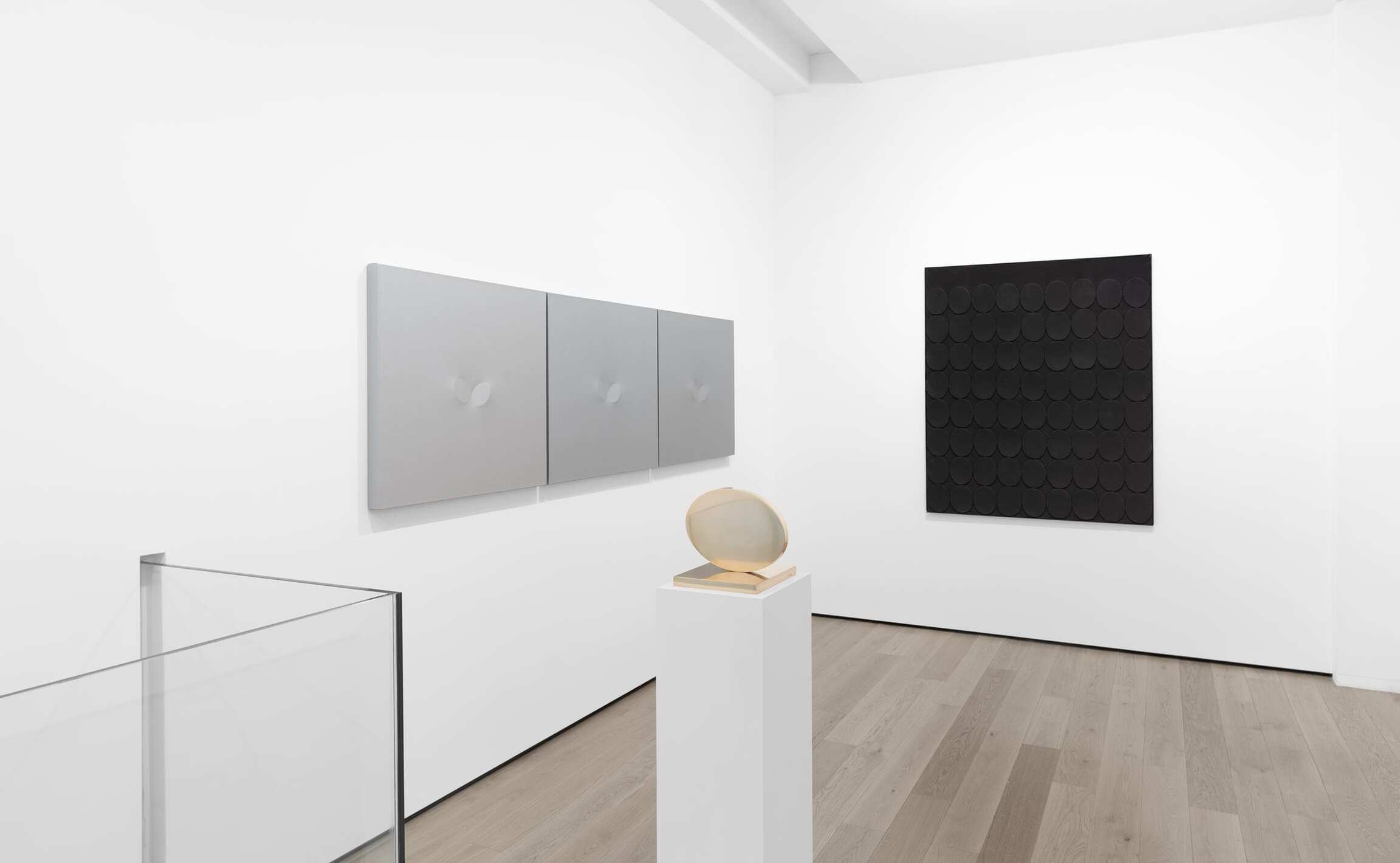 Close to Milanese artists such as Vincenzo Agnetti, Enrico Castellani, Gianni Colombo, and Grazia Varisco, Simeti maintained this minimalist commitment to a form that can be perceived under the surface of the canvas like a fundamental sign pursuing its artistic radicalness. He never departed from the aesthetic direction he chose. The only variations over the years would be the size of the ovals, their number, and their rhythm, as Simeti continued his ongoing exploration of the perpetually changing effects of light on the surface of the canvas (Polittico colorato, 2006; 6 ovali argento, 2018).