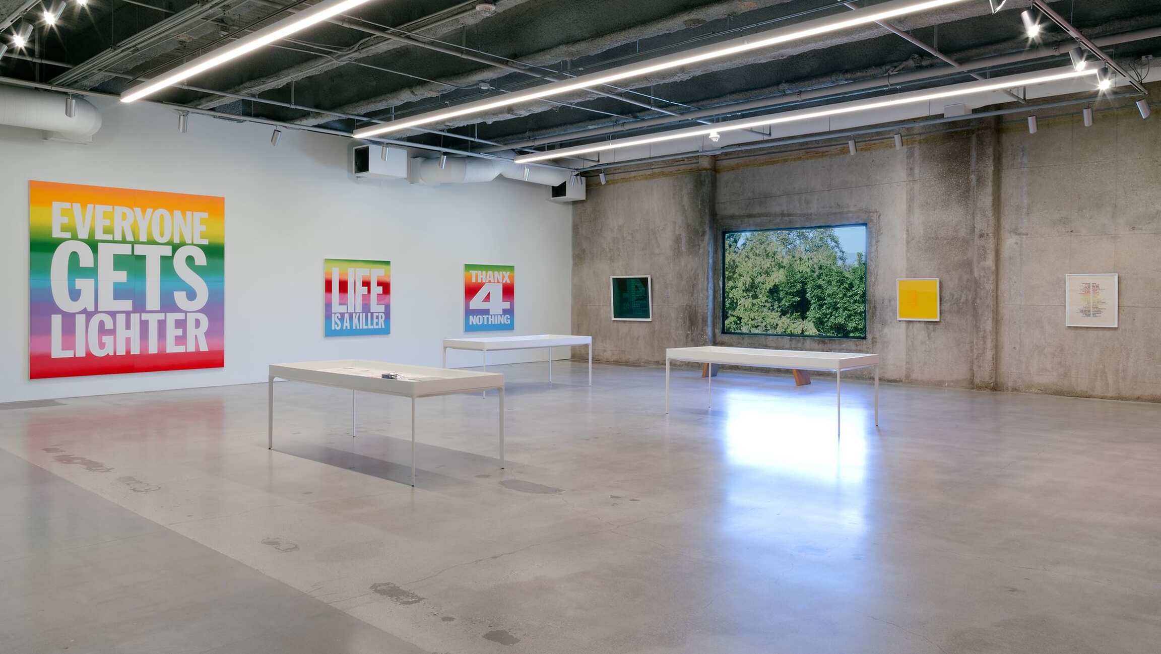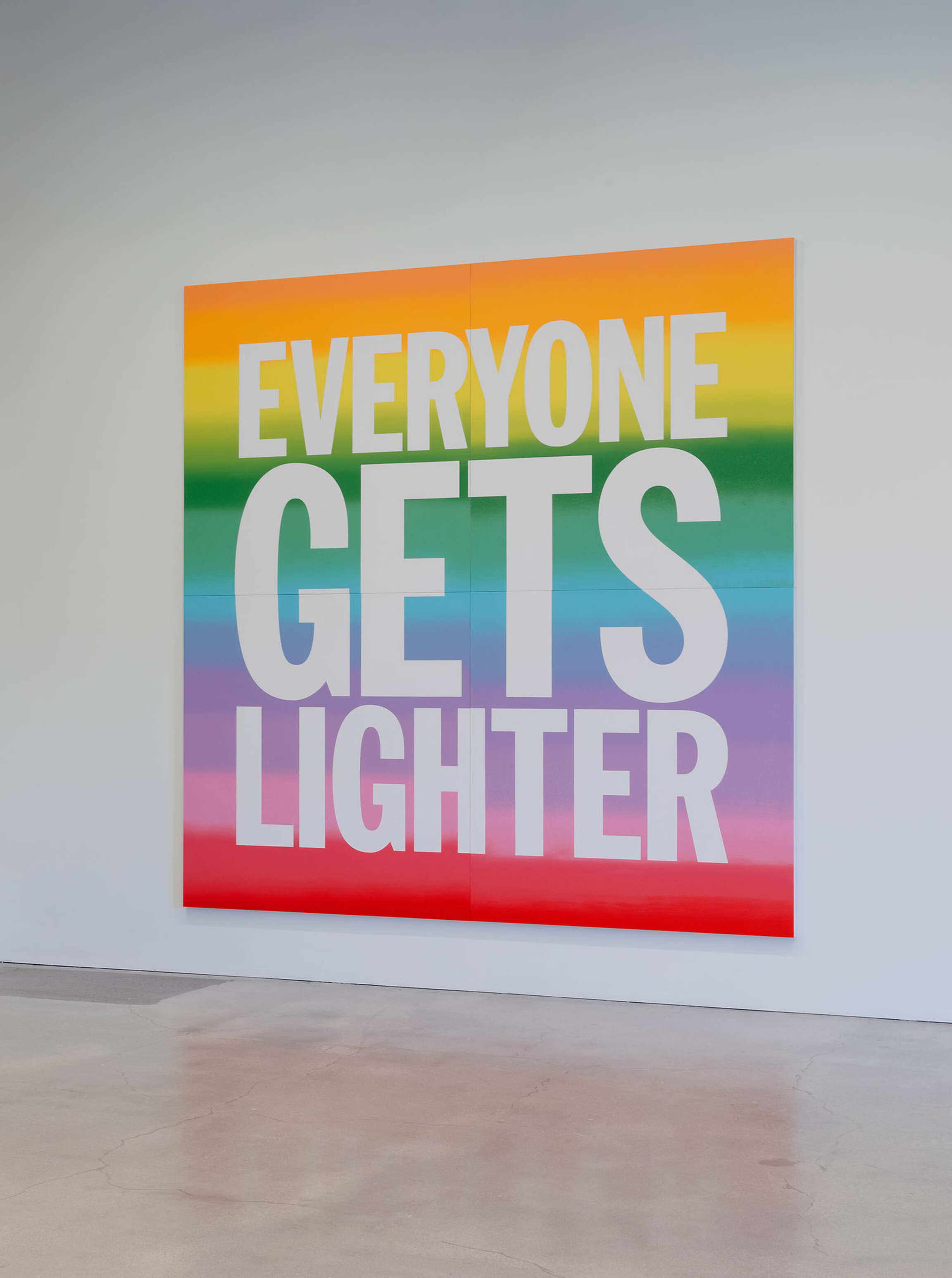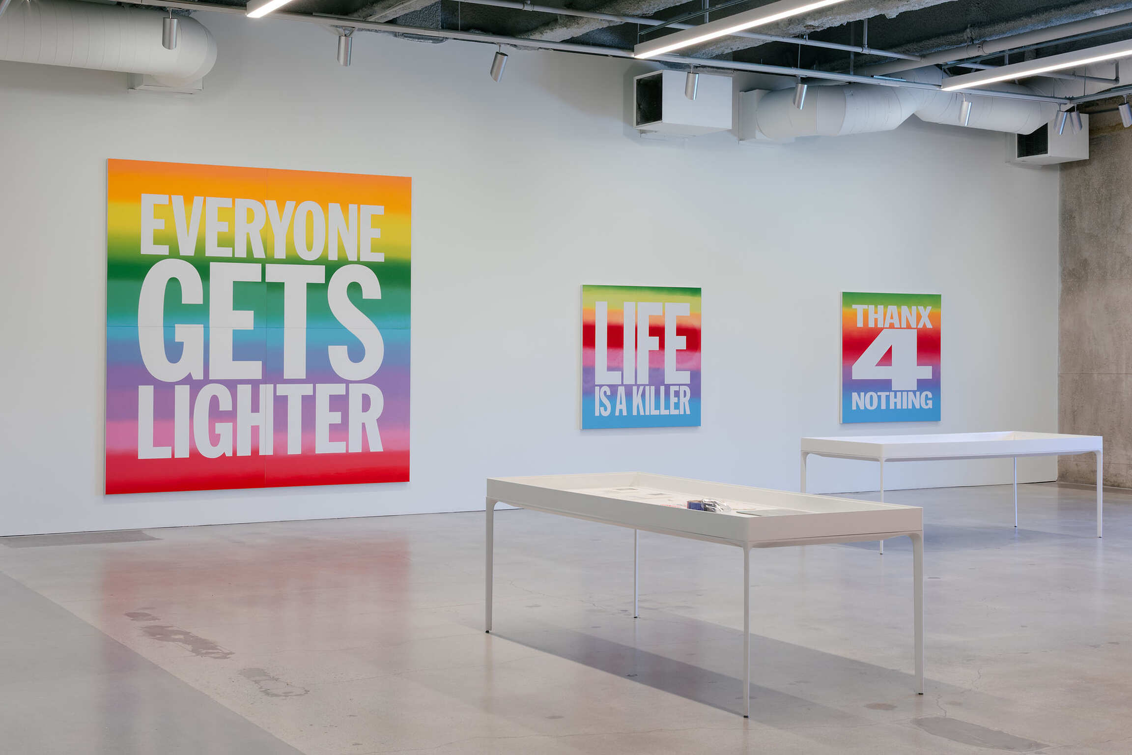 Less known is Giorno’s painting practice, born from the same impulse to reach people within and beyond the museum. With language as his medium, he brought his ear for a sharp phrase into the art world, infusing it with a mix of gravity and levity. The works gathered here—text paintings, early prints, and rainbow canvases—form their own collective poem. They distill Giorno’s worldview: the delights of New York street life, Buddhist thought, and the raw immediacy of language. Like koans, they invite viewers to finish the thought, to carry the fragments into their own lives. As Giorno wrote in one of his final poems, “Thanx 4 Nothing” (2007): “Thanks for allowing me to be a poet / a noble effort, doomed, but the only choice.”