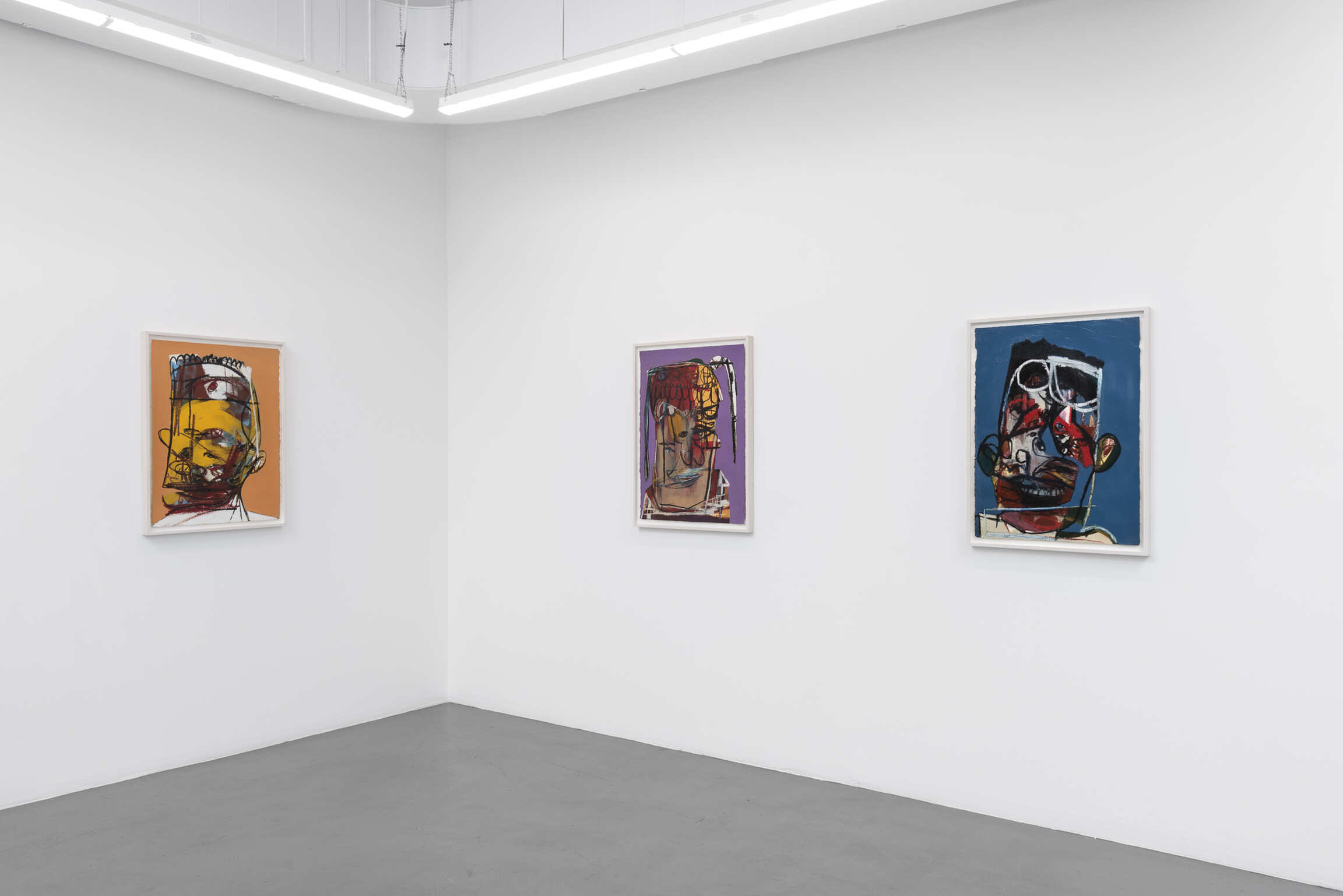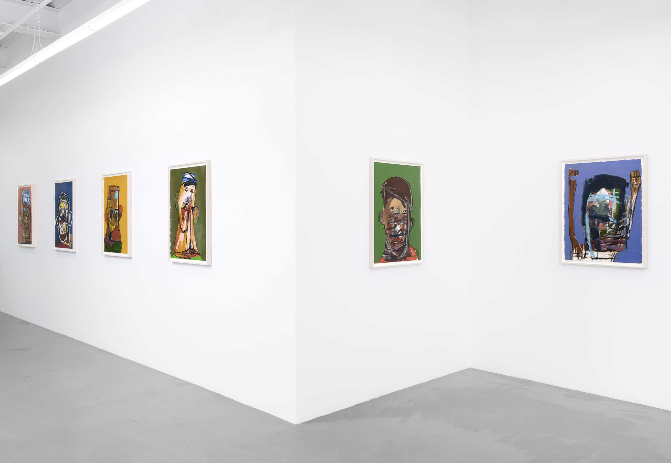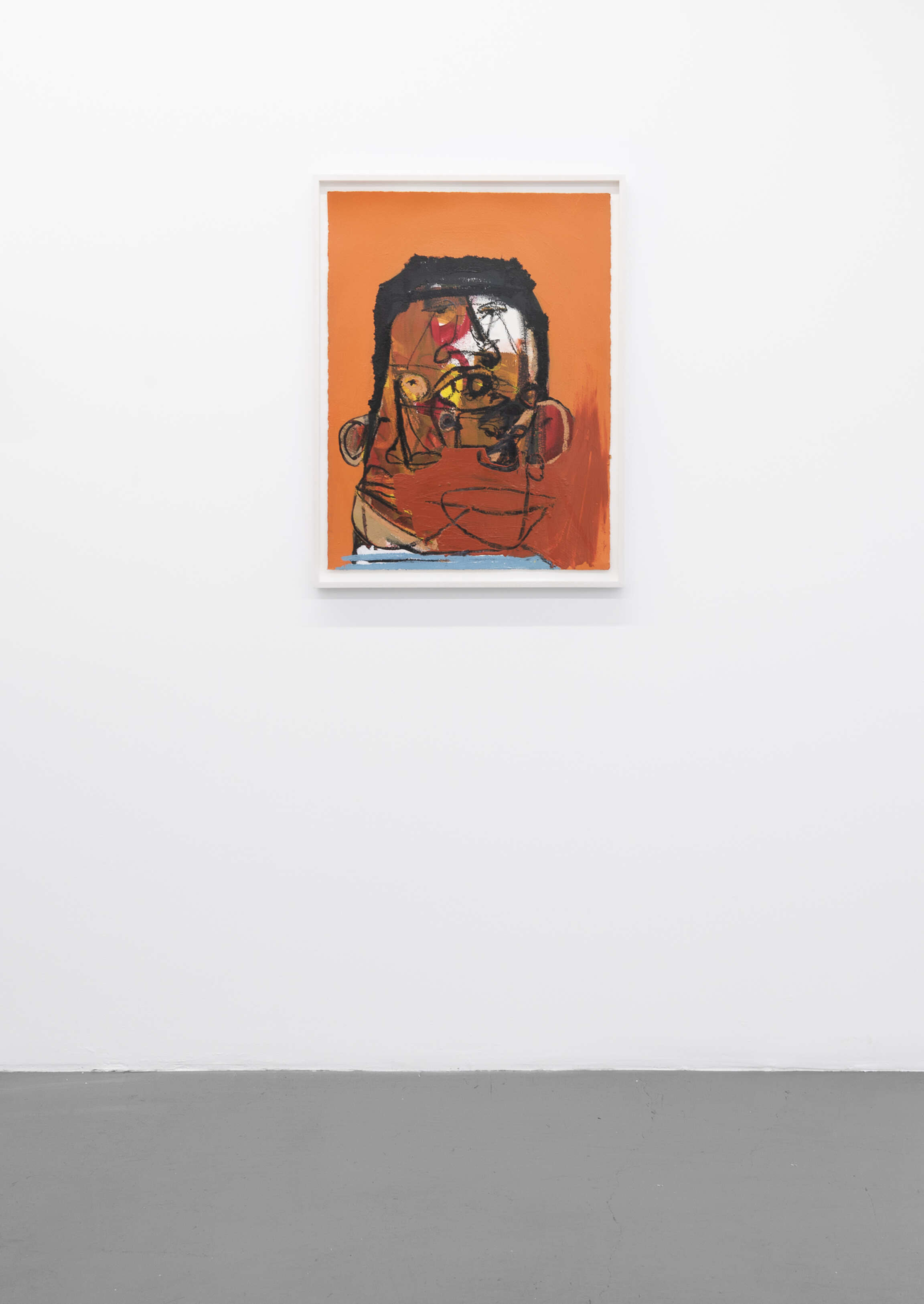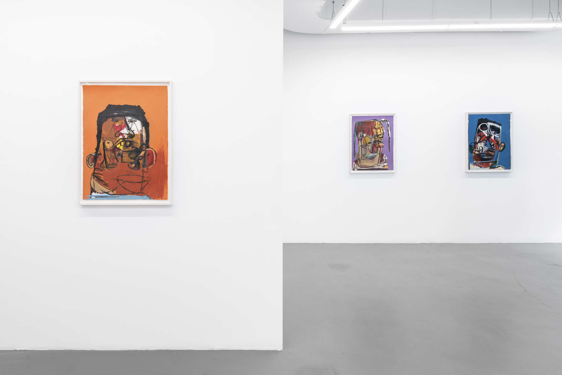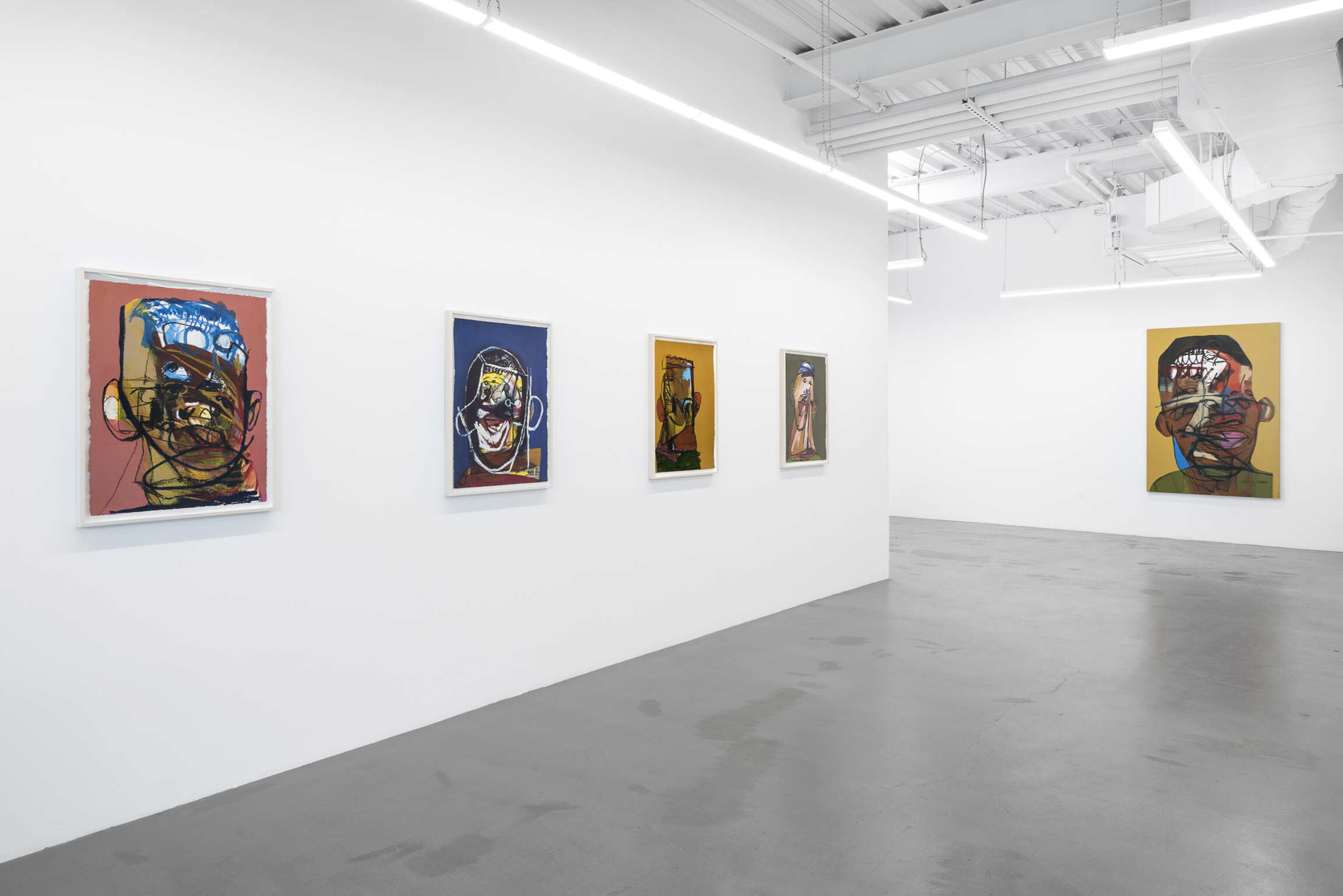 Tramaine listens to contemporary gospel or jazz while she works, inscribing the energy and power of the music onto her canvases. Swift, repetitive gestures for a rounded hairline, a set of braids or a pair of lips lend their surfaces a frenetic visual rhythm. Many of these faces have multiple sets of the same features: in Jesus knows it’s me (all works 2021), for instance, the subject has at least eight eyes. In Jesus loves me: Middle Road, the circular gesture that forms a pupil could also be nostrils, studded above and below a pair of full, blushing lips. In each painting, bold lines in paint or oil pastel denote jaw and hairlines, bounding the concatenating shapes within them. The portraits are studies of what the artist calls the American Black Face, their features exaggerated to better capture the expressive soul of Black people.