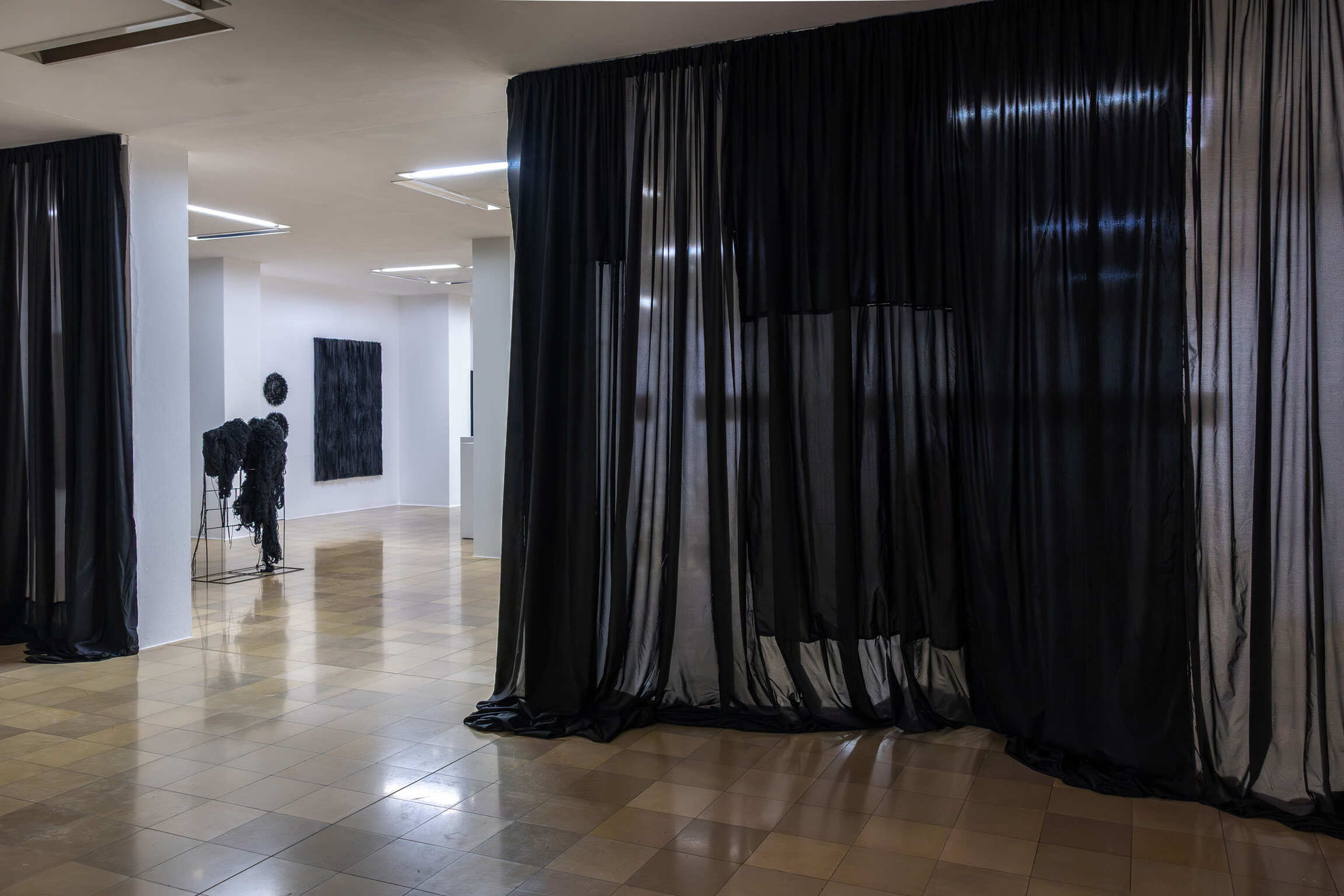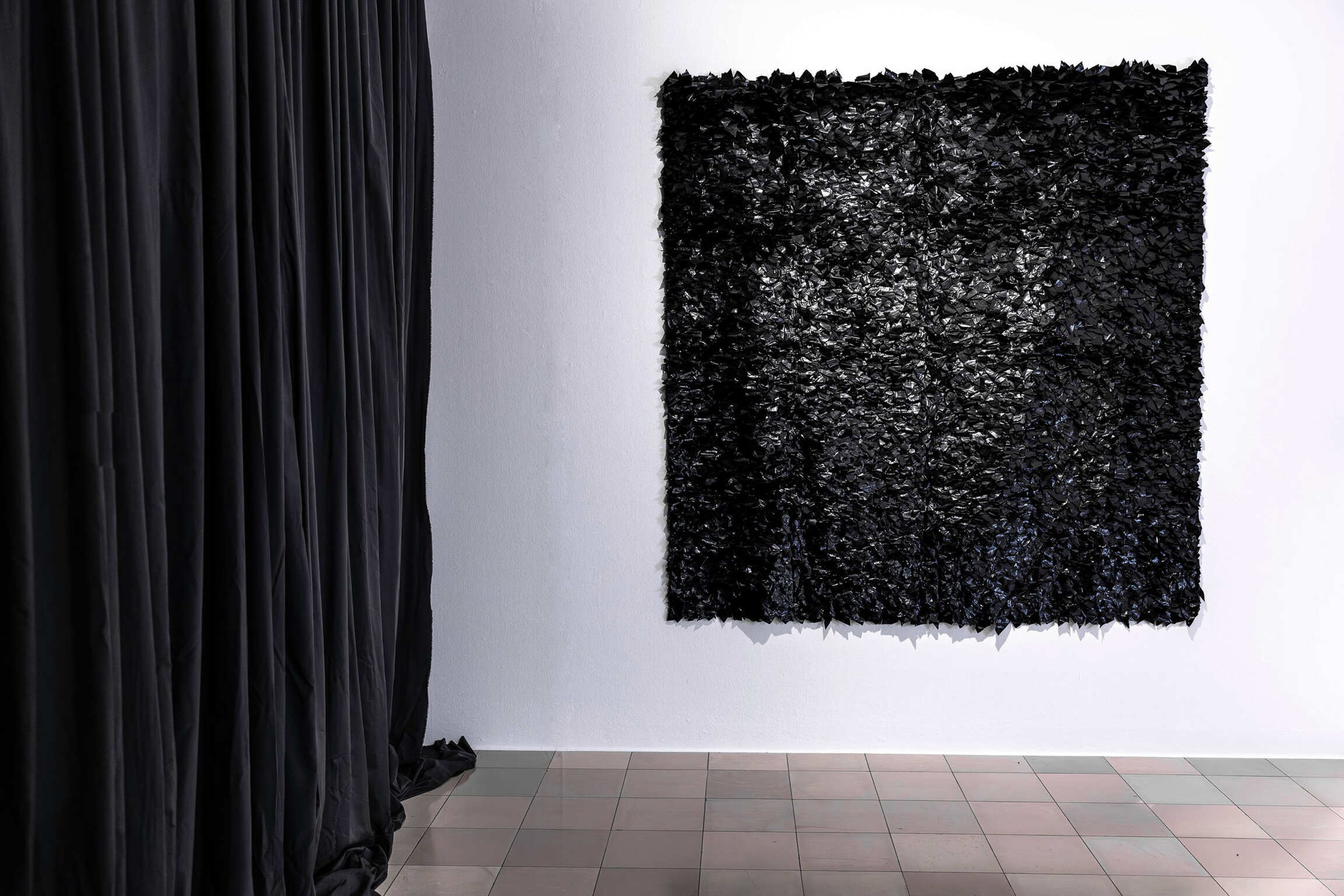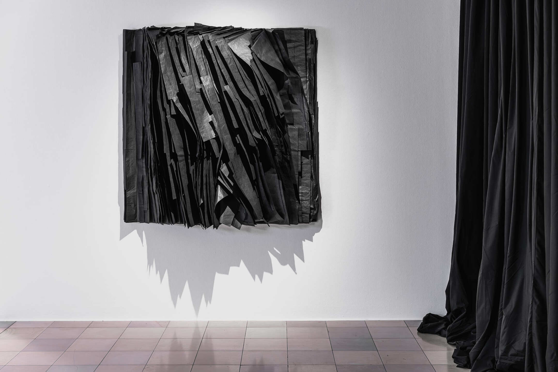 Joël Andrianomearisoa originates from Malagasy multiculturalism, which exists at the interface between Africa and Asia and is linked to Europe through colonial history. In the service of his emotional explorations, he freely uses mixed references, uniquely combining the coldness of industrial minimalism with the warmth of strong personal narratives that transcend time and people. Steeped in complex emotional experiences, his works produce delicate and tense creations that reflect the breath of our lives and express his ongoing explorations of the materiality of emotions. Andrianomearisoa’s approach to poetry and architecture allows him to explore his own unique path, creating a new architectural layout within the exhibition space. Special textiles and weaves, as well as his use of specially dyed and manufactured papers, play a major role, exploring materiality, haptics, and oversized dimensions as essential criteria. In this way, the artist succeeds in transforming spaces in his own way and imbuing them with emotional energy.
