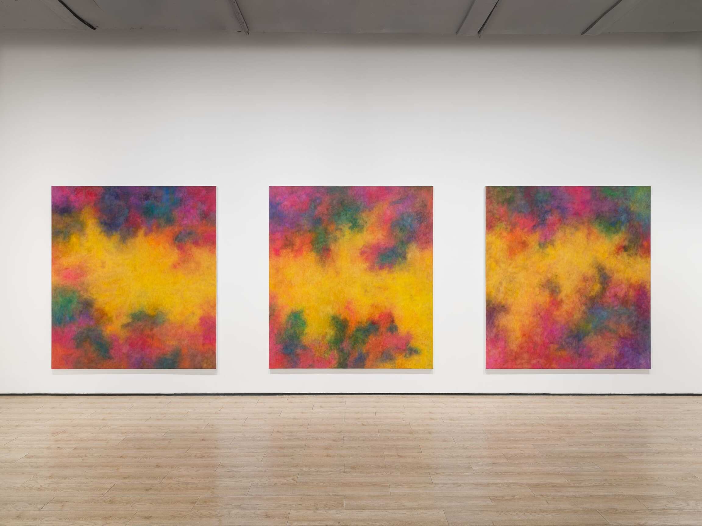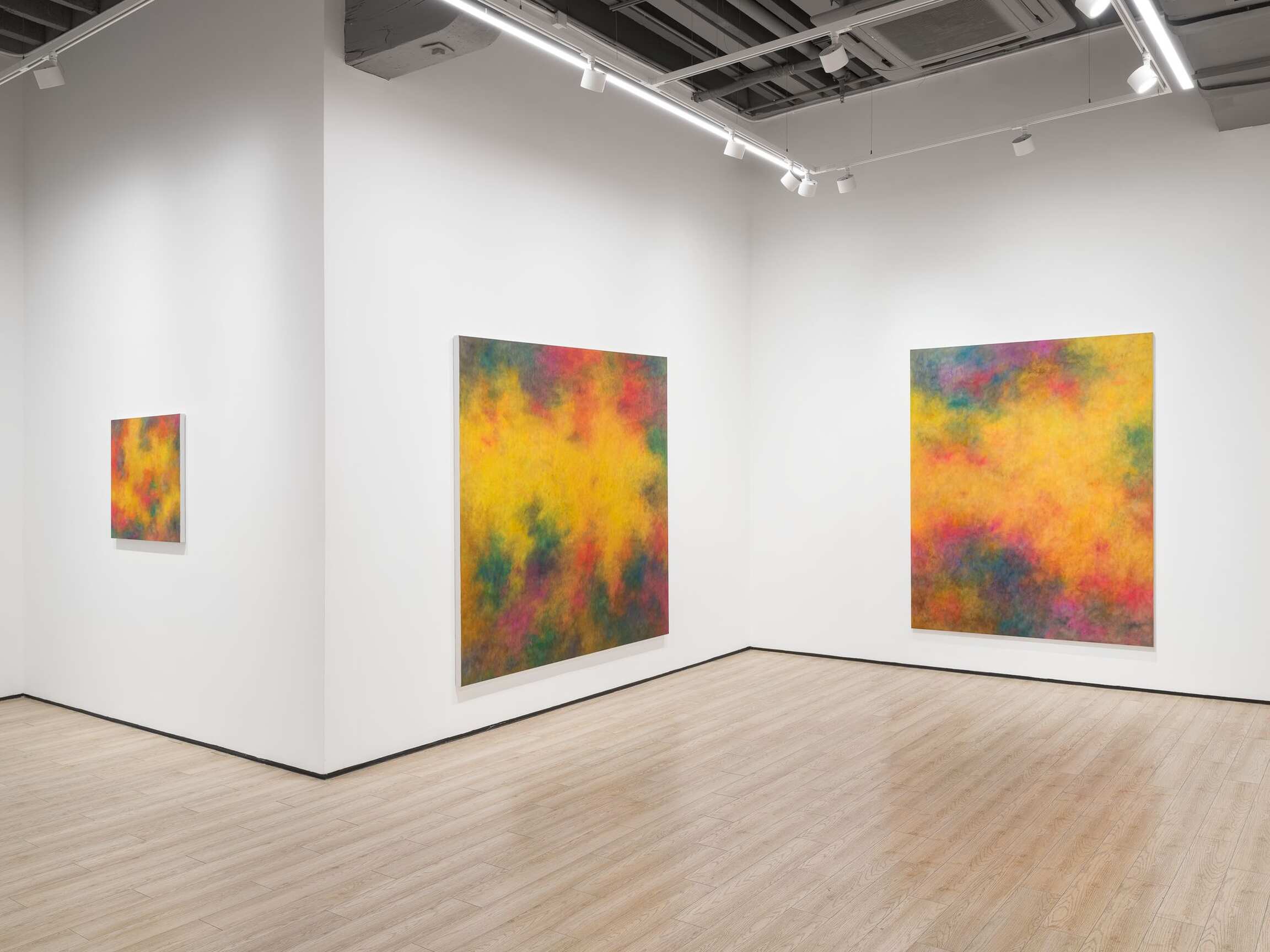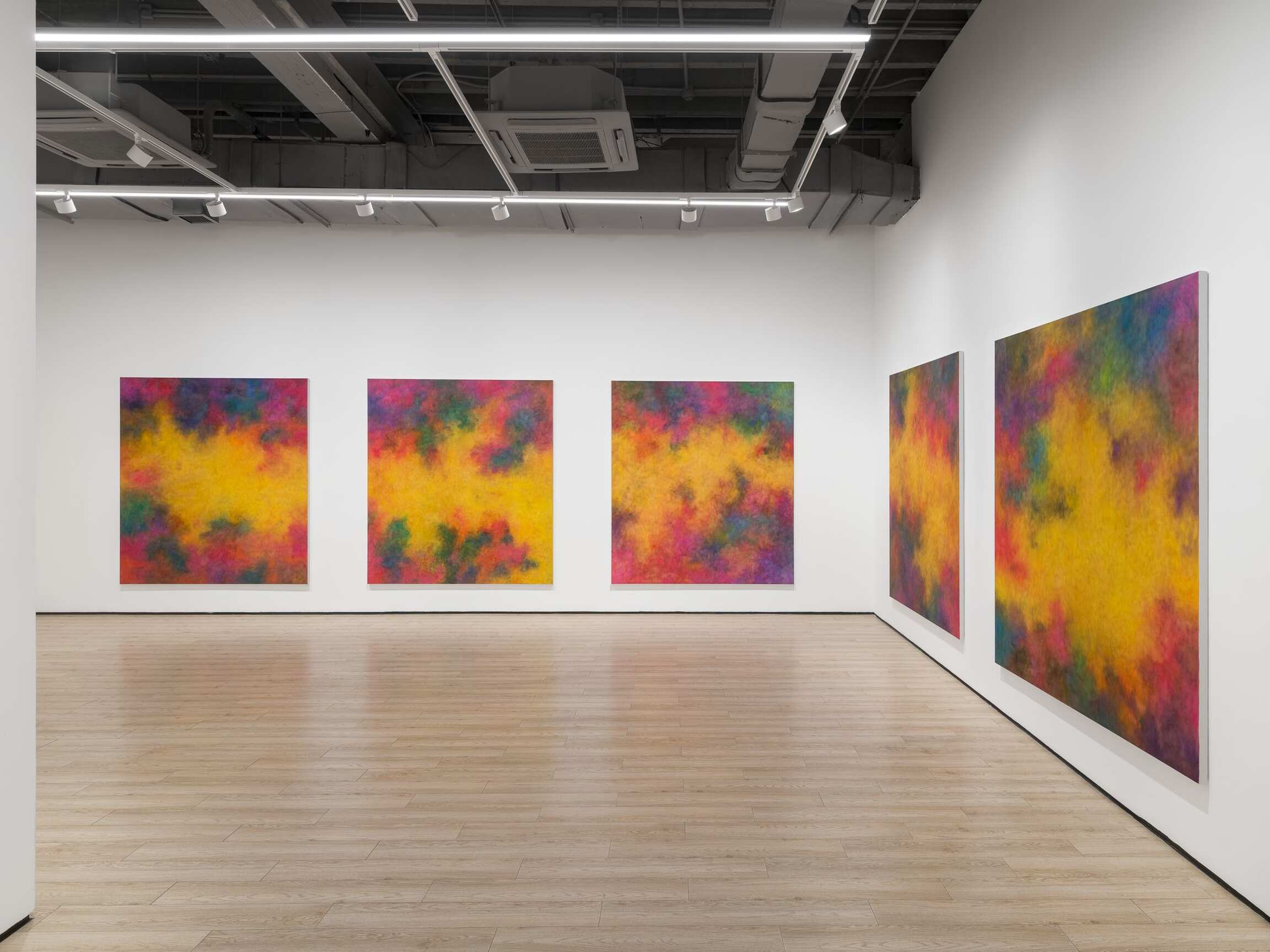 In 'Vetiver (Shanghai)', his cloud-like formations take on a newly latent form akin to colored fumes. Diffused patches of pyrotechnic yellows burst through the canvas like smoke flowers in the midst of an auspicious firework. Meanwhile, darker shades of blue, purple, orange, and green linger, as if searching for a place to settle. From one canvas to the next, the observer is carried through vaporous movements—successive stages in an endless process of evaporation. What lies behind the painter’s artificial sfumato remains unclear. At once phenomenological and allegorical, Bernadet’s luminous smoke gets in your eyes—it is the kind of haze that makes lovers go blind.