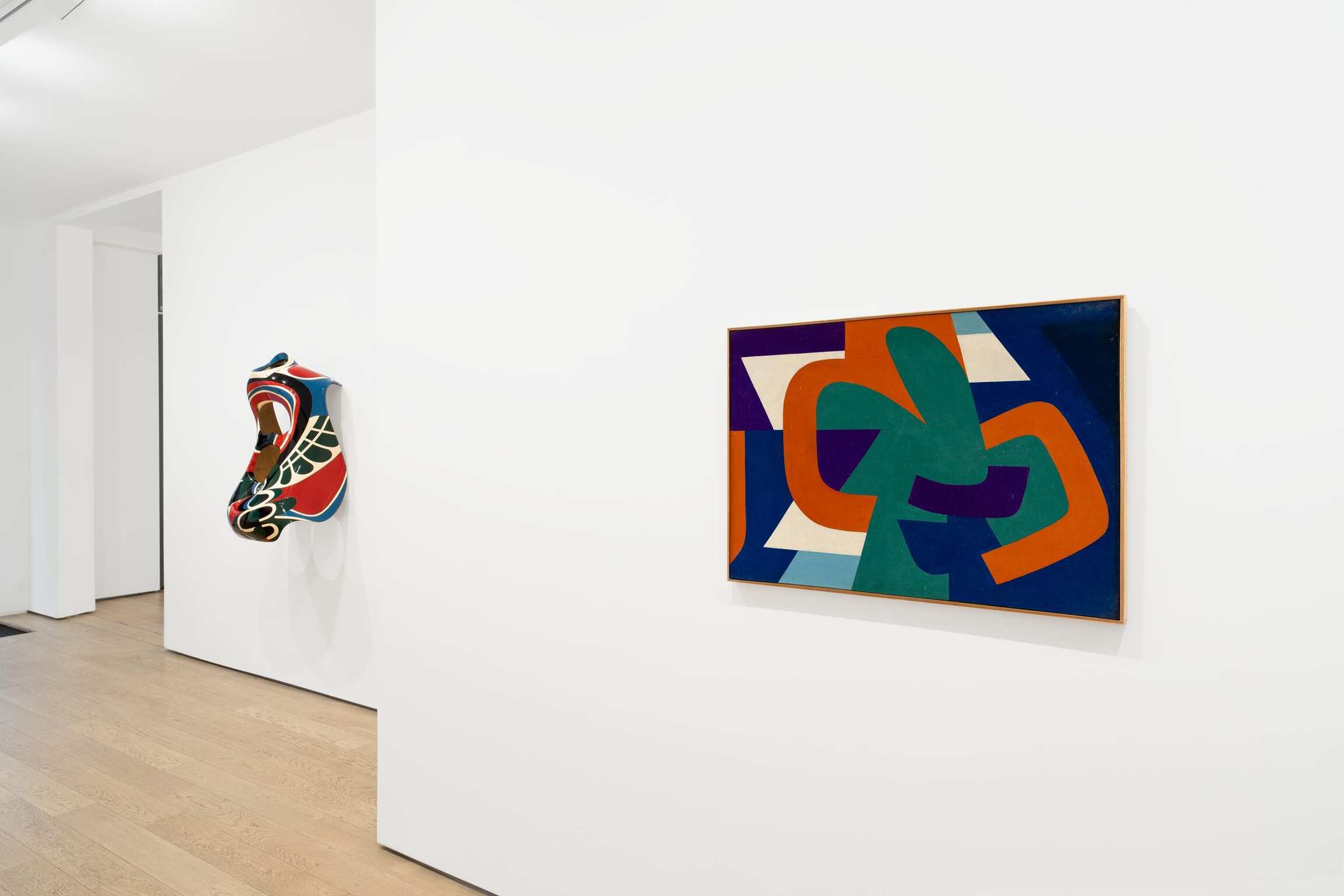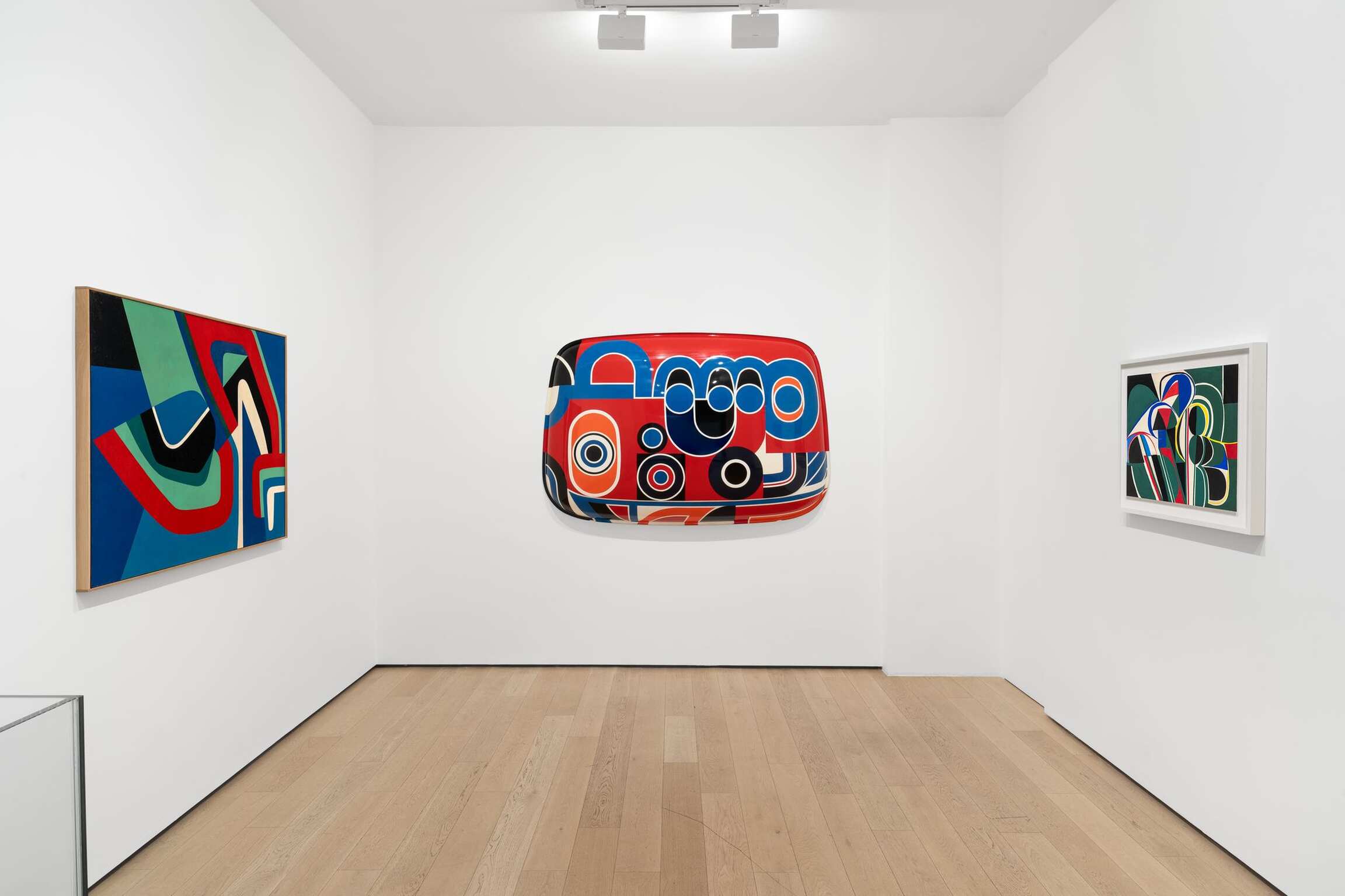La peinture de Jean Dewasne connaît à cette époque une transformation radicale, dont témoigne L’Apothéose de Marat (1951), tableau fondateur. Il adopte désormais une peinture industrielle émaillée (laque, peinture glycérophtalique) appliquée sur des panneaux d’isorel, il homogénéise ses surfaces, accentue les séparations entre les plages géométriques de couleurs vives grâce à l’usage du tire-ligne et du compas, conférant ainsi à ses œuvres une apparence lisse et quasi manufacturée. Dewasne élabore dans le même temps une grammaire plastique très personnelle qu’il enrichira sans relâche au cours des décennies, mêlant hexagones, carrés, demi-cercles, ellipses, motif en damiers, formes concentriques et leurs dérivés.... Cette évolution, qui le démarque vite de ses aînés (Auguste Herbin notamment), connait une étape décisive lorsqu’il élabore ses « Anti-sculptures ». Dewasne a lui-même raconté l’origine de cette invention, inaugurée par le Tombeau d’Anton Webern (1951-1952), acquis par le Centre Pompidou du vivant de l’artiste : «En 1951, j’ai trouvé un arrière de voiture de course d’avant-guerre et la forme m’a intéressé. J’en ai scié la base, je l’ai mise debout et je me suis aperçu que je pouvais peindre l’intérieur et l’extérieur en même temps. […] J’ai travaillé là-dessus et cela a donné la première anti-sculpture1 ». Ce support ready-made, aux surfaces creusées et bombées, animées une géométrique brillante et colorée, annonce les effets visuels de la peinture hard edge américaine.