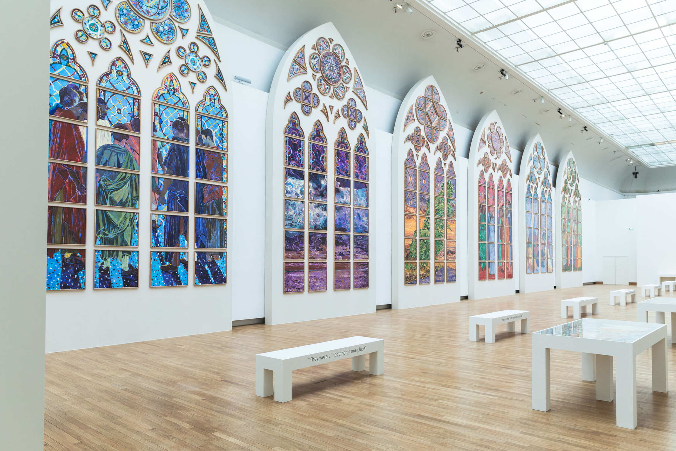 Claire Tabouret wishes to invite the public to accompany her on this adventure and offer them a first glimpse of the life-size models, while the stained glass windows are still being made at the Atelier Simon-Marq. The exhibition’s scenography allows visitors to experience the unique atmosphere of the workshop, so that they can witness this rare moment of work in progress, still in motion.
