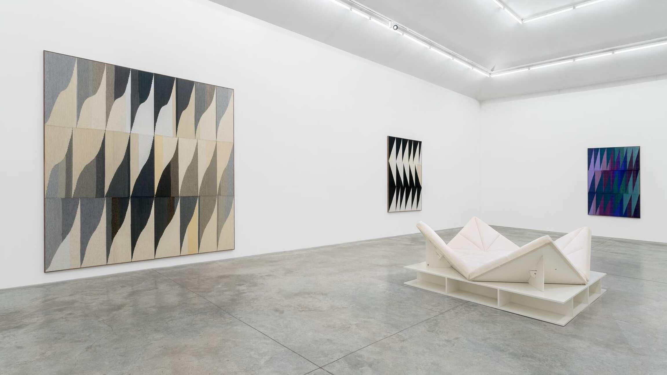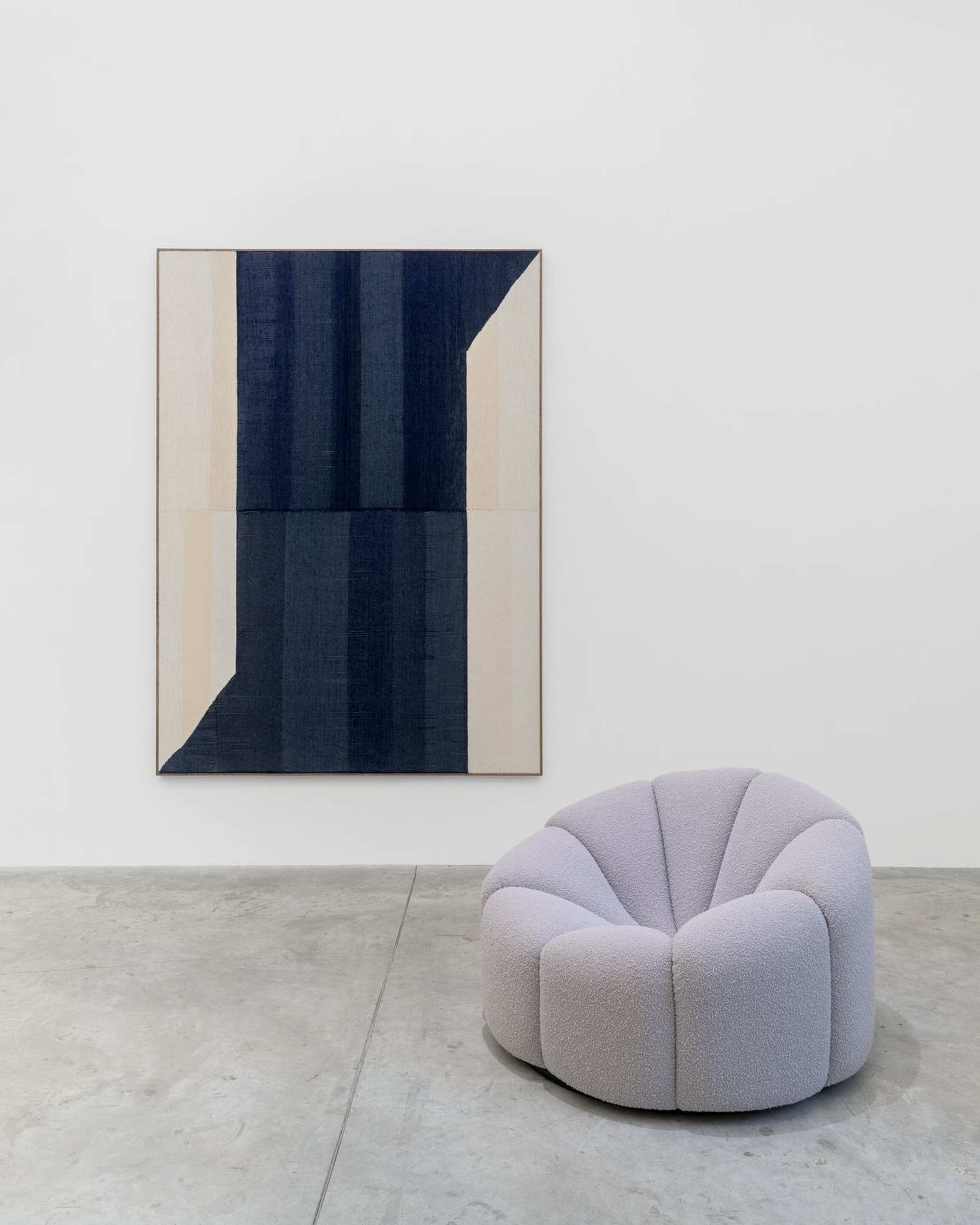 Formé au dessin et à la peinture, l’artiste n’ignore rien des recherches du Bauhaus, ou de l’histoire de l’abstraction géométrique, si il a d’abord été un peintre, le tissage s’est imposé assez “naturellement” dans sa pratique, jusqu’à en occuper tout le champ. Comme d’autres artistes contemporains, notamment l’américaine Andrea Zittel, Brent Wadden revendique un type de production qui pourrait être assimilé à un artisanat d’art et pose la question d’une possible porosité entre art et arts décoratifs, ses grands tissages tendus sur toile évoquant tapisseries et autres tentures regardées comme autant d’hybrides entre oeuvres d’art et éléments de mobilier…
