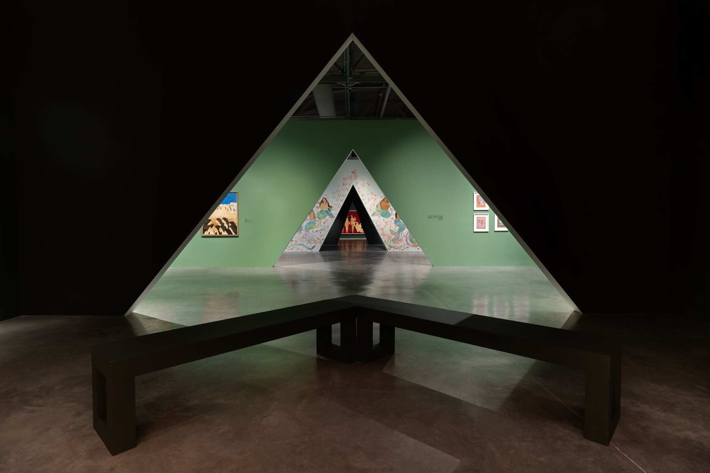 The curatorial layout draws inspiration from the Persian and Mughal 'char-bagh', a quadrilateral garden divided by water channels with a central fountain. These sixteenth- and seventeenth-century landscapes embodied harmony, spirituality, and transcendence. Within 'The Garden', this structure becomes a poetic framework, echoing Schahbaz’s language of multiplicity and transformation. It is important to note that the works were not created to fit this scheme; rather, the 'char-bagh' is a curatorial concept that provides a lens for navigating the artist’s fluid and expansive practice.