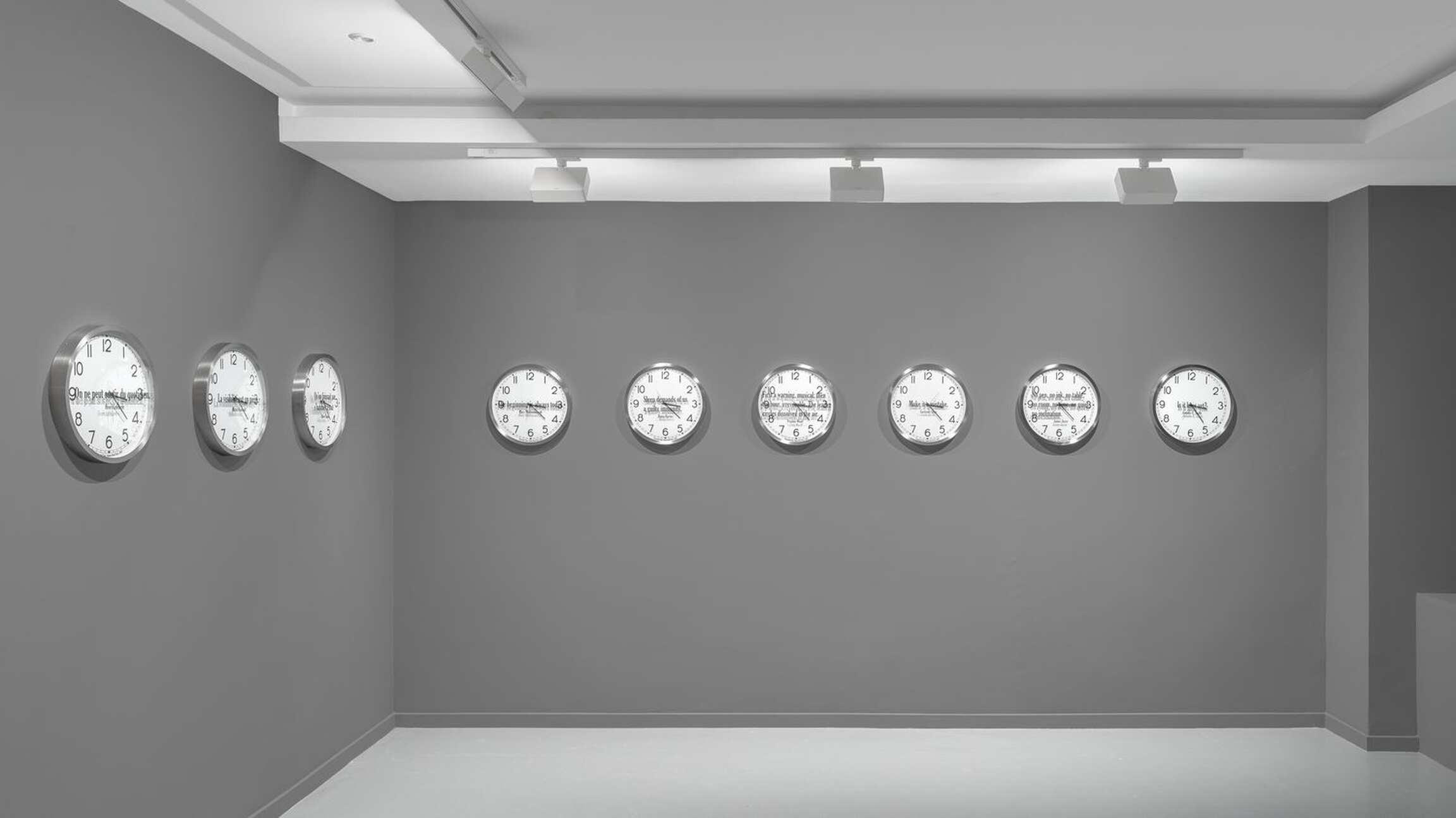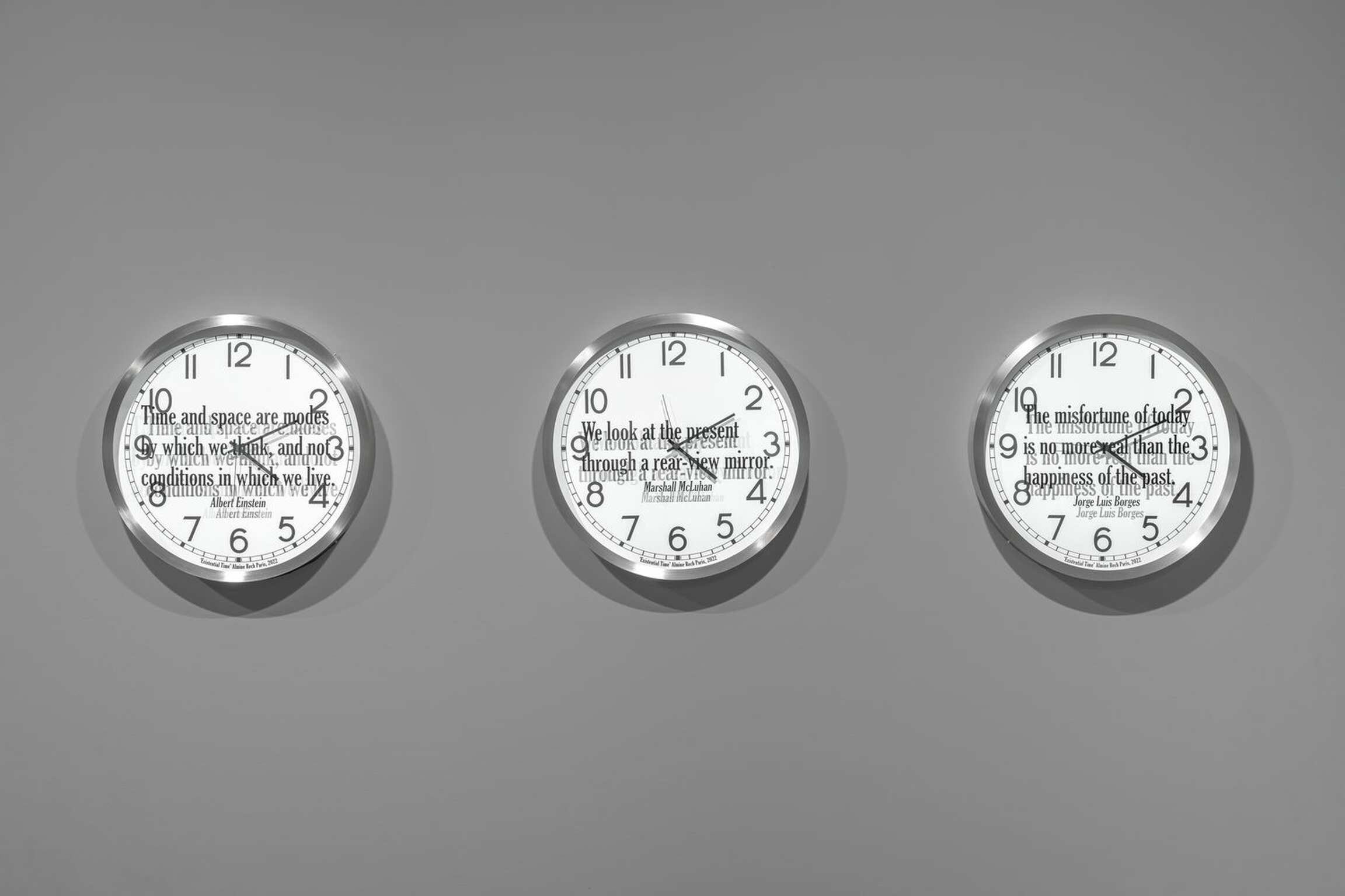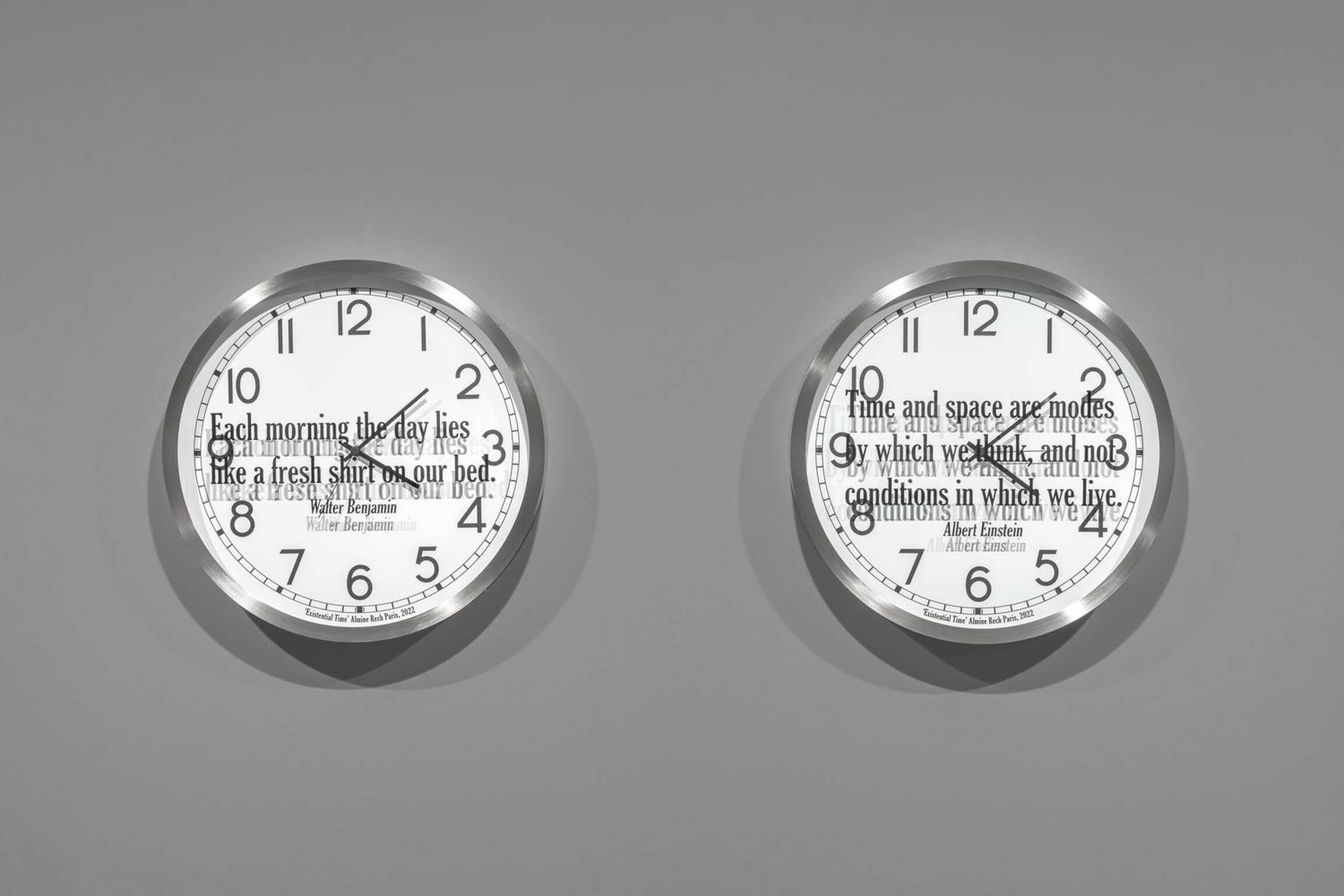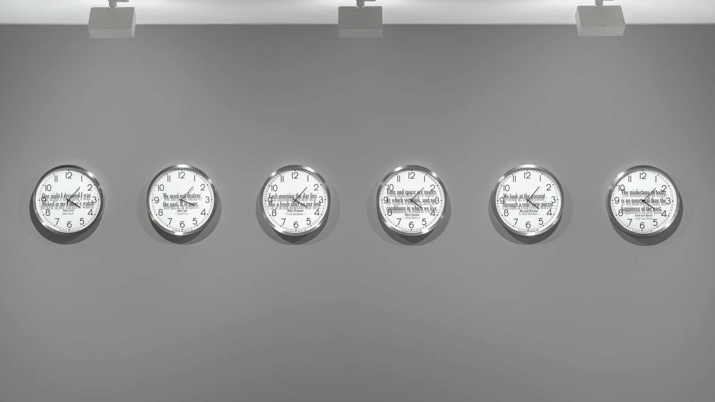 Kosuth’s interest is in the meaning of time as we experience it within the array of contexts life provides. In the sixteen individual works titled ‘Quoted Clocks’, Kosuth’s use of the analog clock referentially anchors the concept of time to its most literal and familiar visual representation, serving as a canny reminder that time is contained in a clock no more than the complex process of making meaning in art is contained in a single object. However precise the mechanism, a clock functions visually as little more than a punctuation mark in need of a sentence, allowing those who look at it, collectively, individually, only a glimpse of a moment that never simply passes. By removing the clock as a fabricated object from its cultural context of functionality and then combining it with quoted language also taken from prior contexts, ‘Quoted Clocks’ further punctuates the insufficiencies, limits, and surpluses of meaning that characterize our perceptions of duration. As an ongoing series of reflections, Kosuth’s Existential Time invites us to reflect on our own lived experience as it flashes by or hangs heavily, leading to questions of consciousness, to what we mean within time.