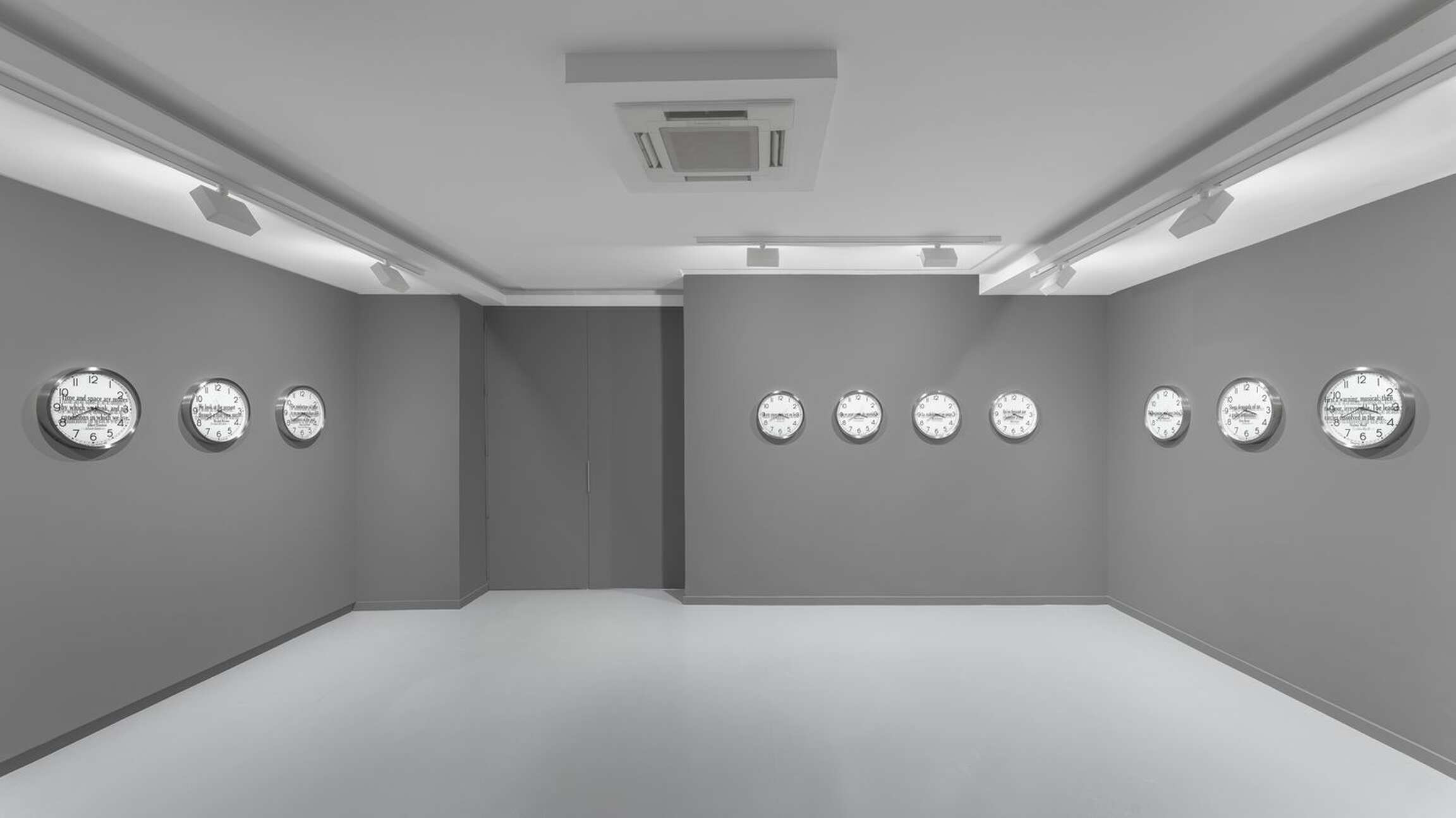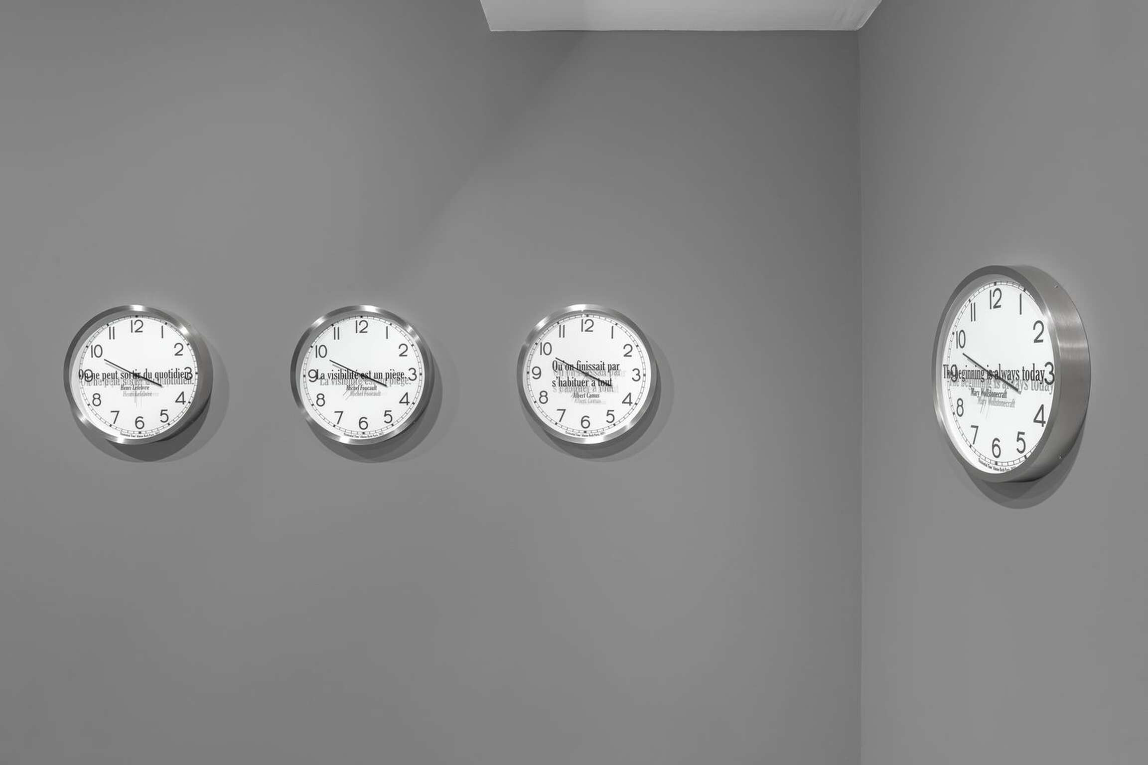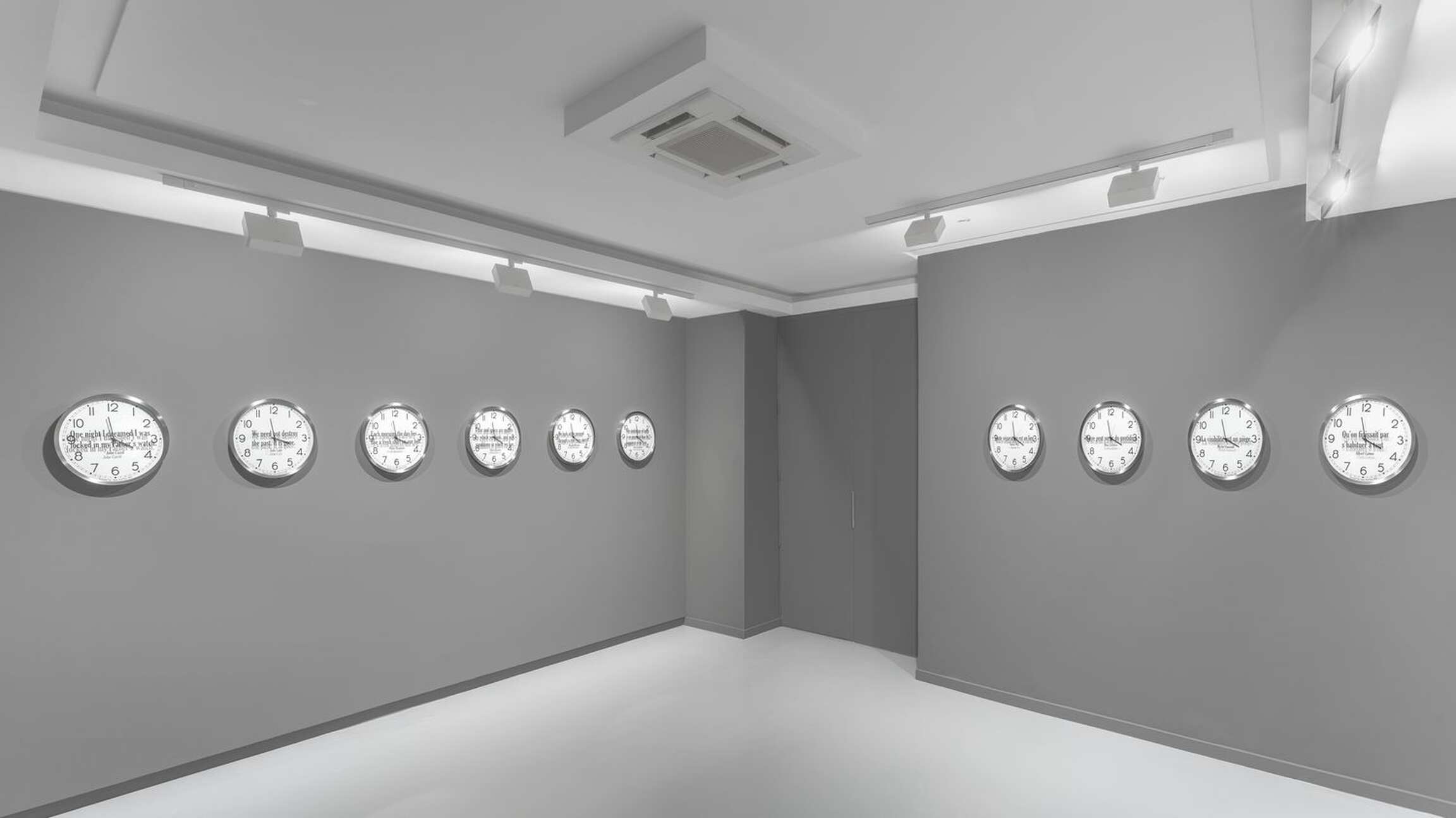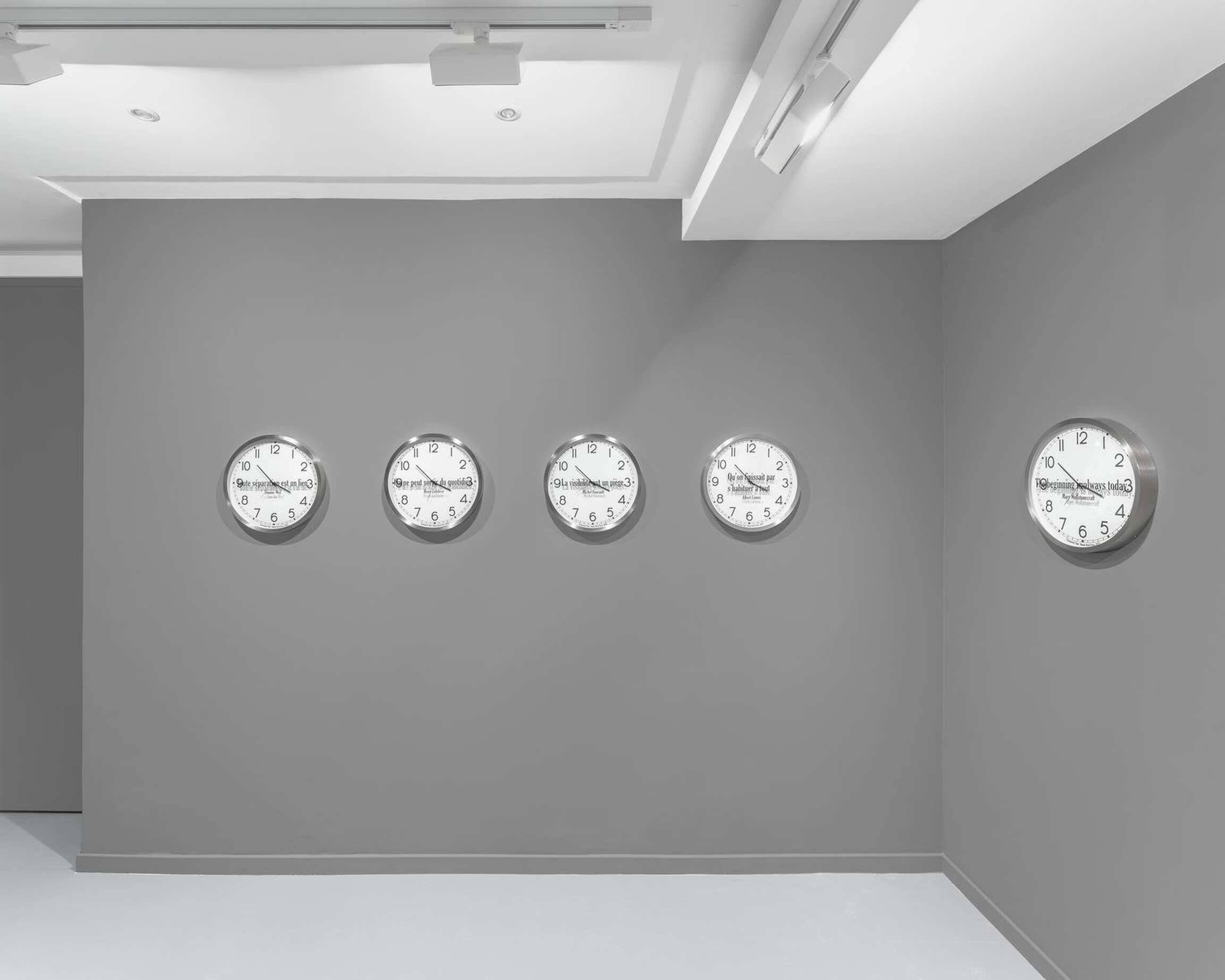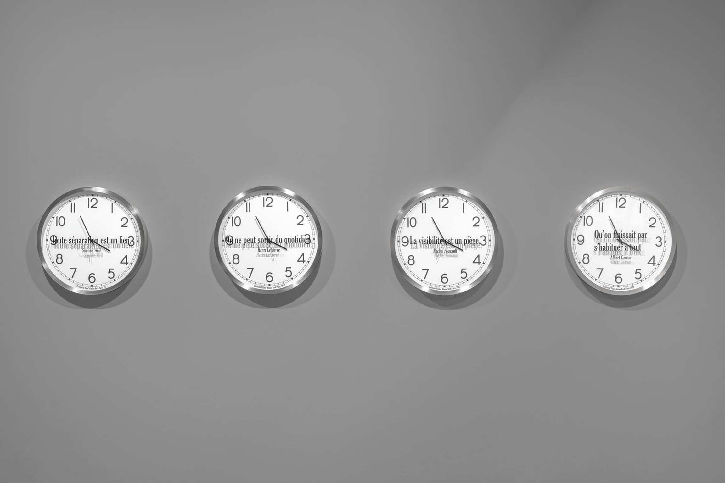 Kosuth’s interest is in the meaning of time as we experience it within the array of contexts life provides. In the sixteen individual works titled ‘Quoted Clocks’, Kosuth’s use of the analog clock referentially anchors the concept of time to its most literal and familiar visual representation, serving as a canny reminder that time is contained in a clock no more than the complex process of making meaning in art is contained in a single object. However precise the mechanism, a clock functions visually as little more than a punctuation mark in need of a sentence, allowing those who look at it, collectively, individually, only a glimpse of a moment that never simply passes. By removing the clock as a fabricated object from its cultural context of functionality and then combining it with quoted language also taken from prior contexts, ‘Quoted Clocks’ further punctuates the insufficiencies, limits, and surpluses of meaning that characterize our perceptions of duration. As an ongoing series of reflections, Kosuth’s Existential Time invites us to reflect on our own lived experience as it flashes by or hangs heavily, leading to questions of consciousness, to what we mean within time.