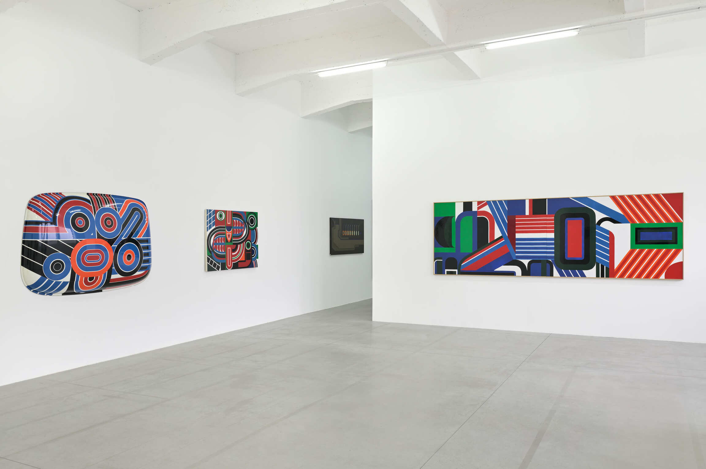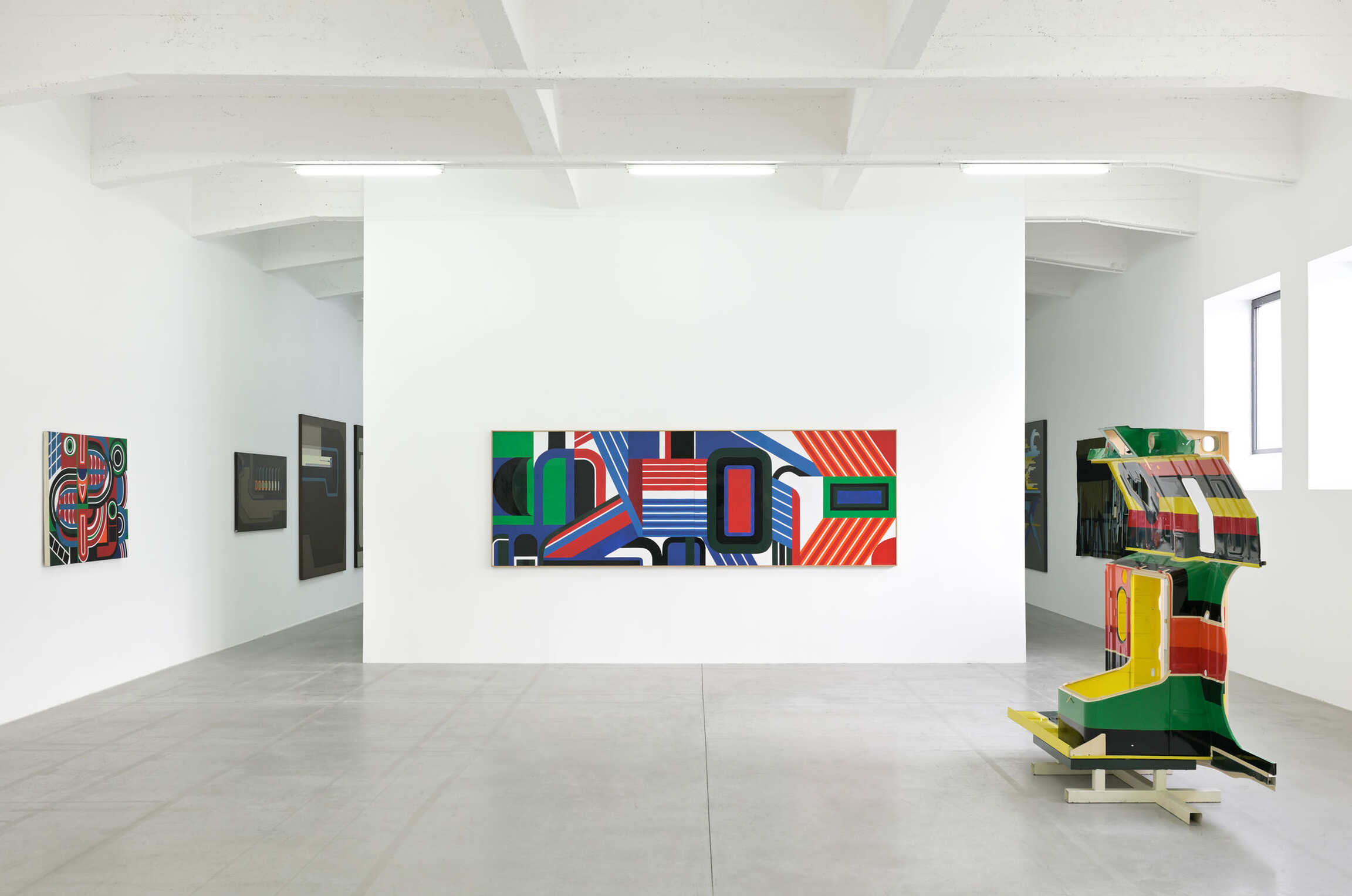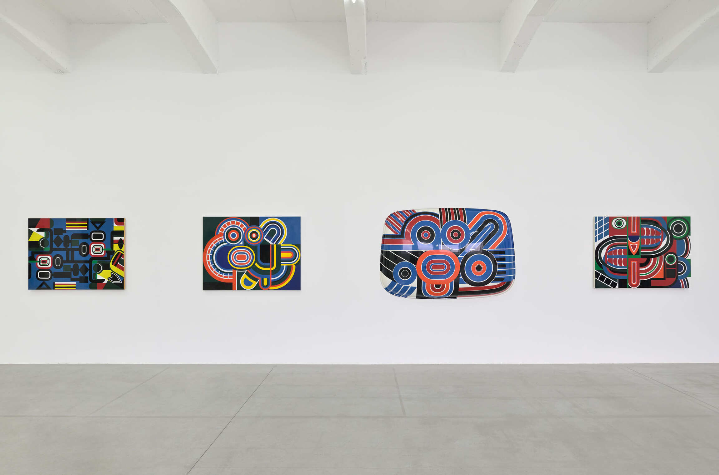 Enameled in industrial colors, the paintings are glossy, precisely composed with tape, featuring an imbricated figure/ground dialectic of curved shapes outlined with fine white lines at times. The palette is often limited to pure white, red, black, blue, and green applied in solid flat areas. Large-scale mural commissions flourished, commanding a strong, and perhaps overpowering, environmental presence, yet managing to remain strictly within pictorial two-dimensionality. Not any 3D kinetic effects here! The temptation toward sculpture nonetheless arose in his Antisculptures, which used motorcycle tank parts as supports, or elements from car bodies, in collaboration with Régie Renault.