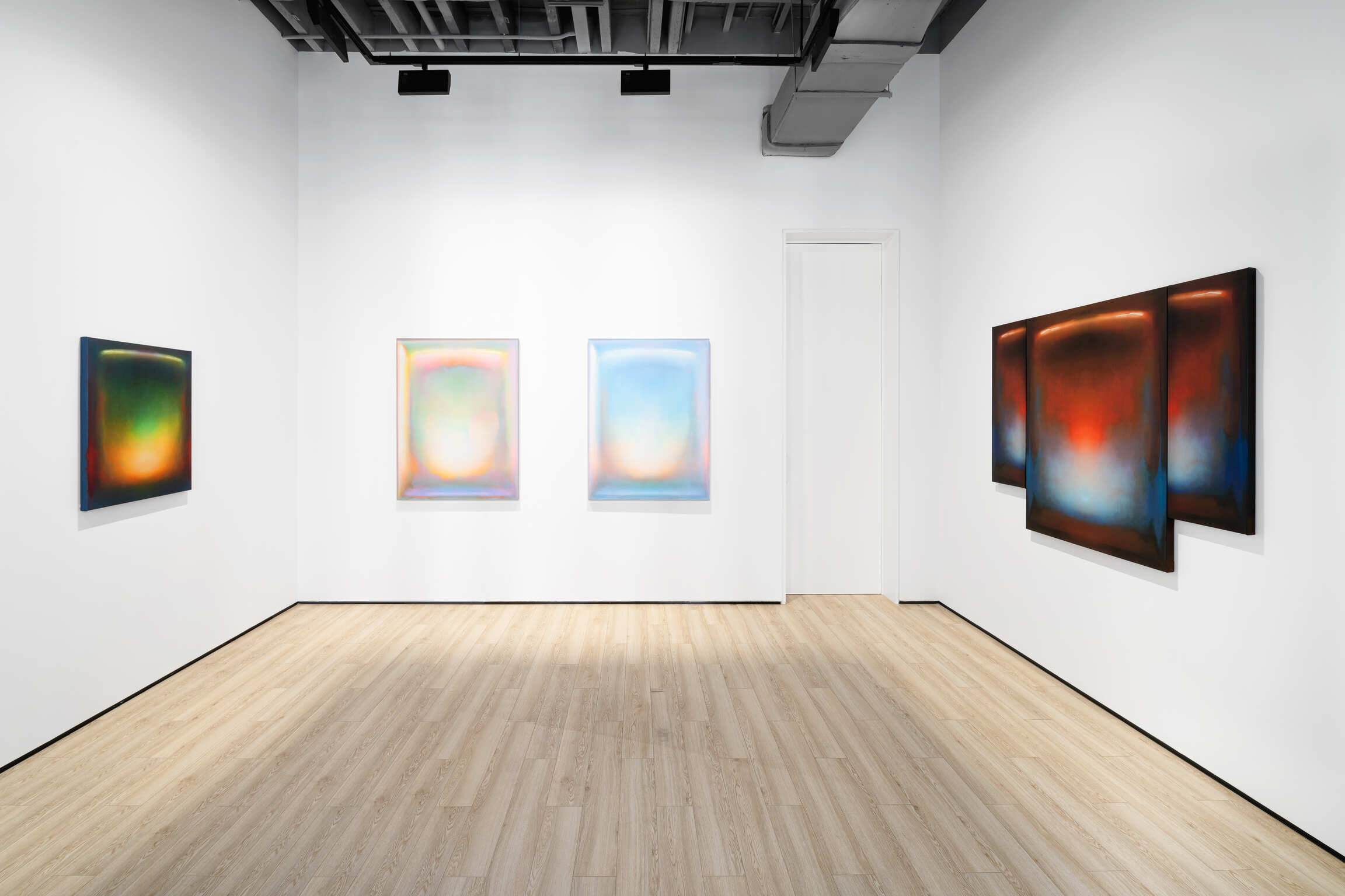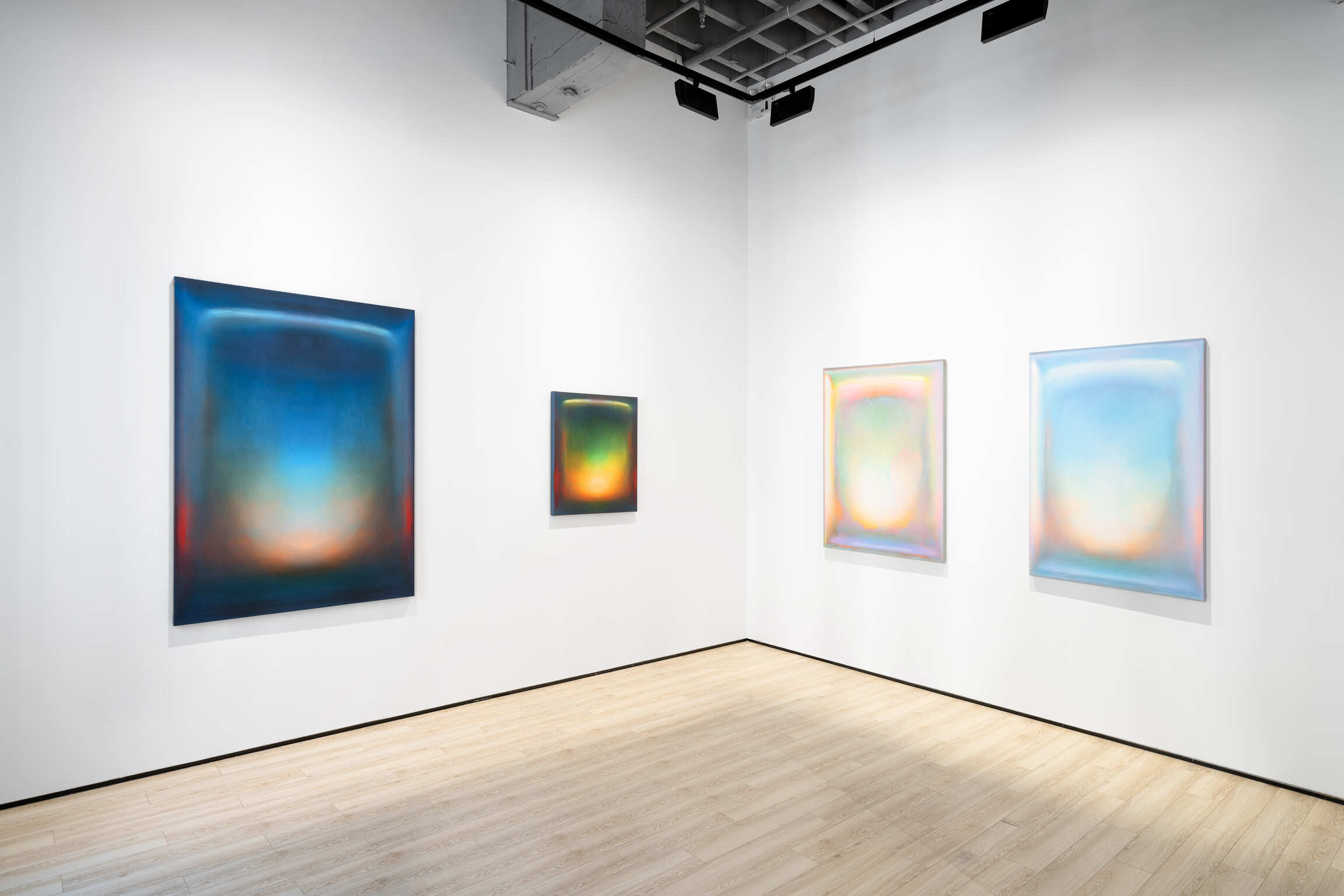 For this new show, Amaro has painted horizons, or, rather, the spirit of the horizon as seen from a window, an airplane window, or even through a smartphone screen.