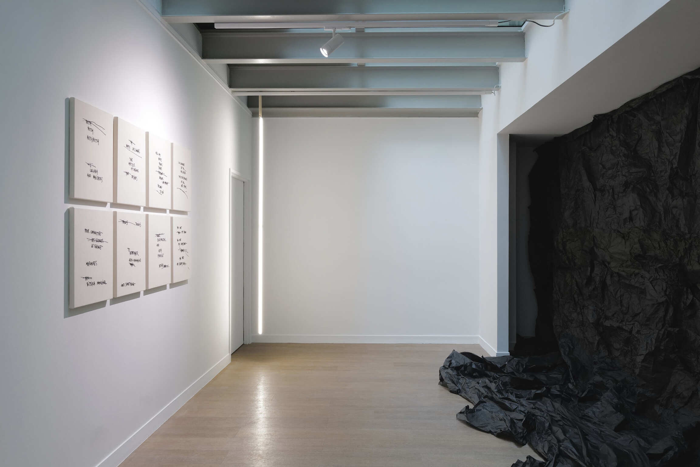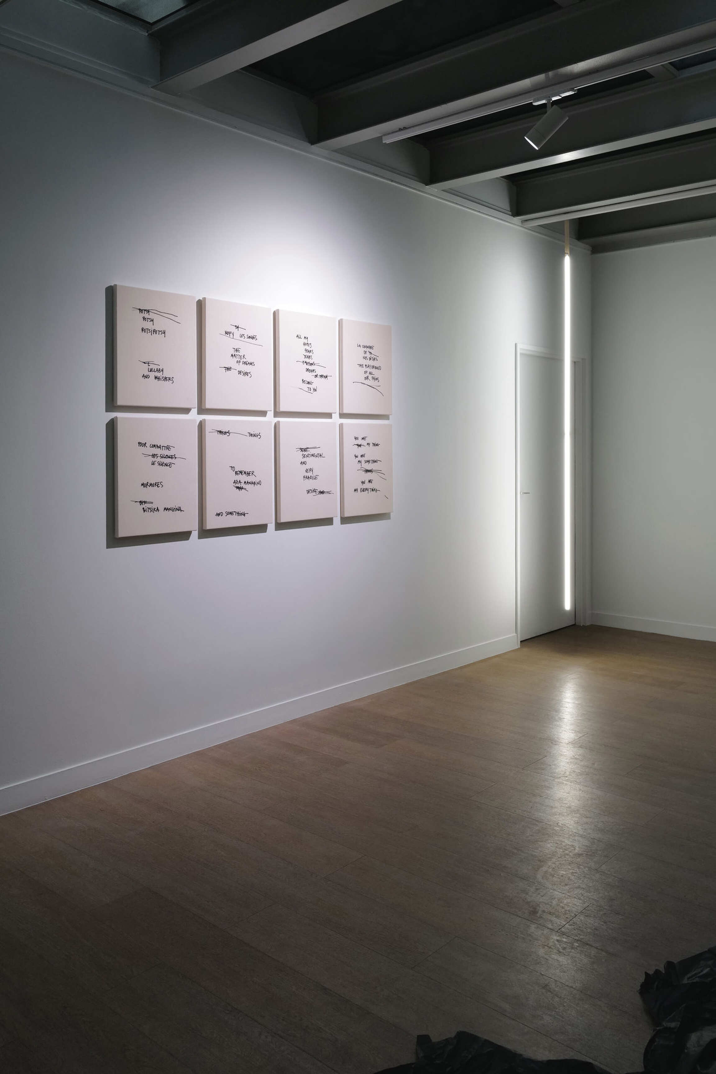 From the outside, the title displayed on the façade directly addresses the public and opens onto a space in which emotions guide the artist’s entire approach. Deployed like an architectural gesture, black tissue paper fills the spaces of Transfo, carrying the visitor into a whirlwind of black surfaces, along a continuous, almost organic movement. Neon lights, Malagasy songs, embroidery, and poetry also compose this sensitive environment: an inner landscape where emotions and feelings unfold.