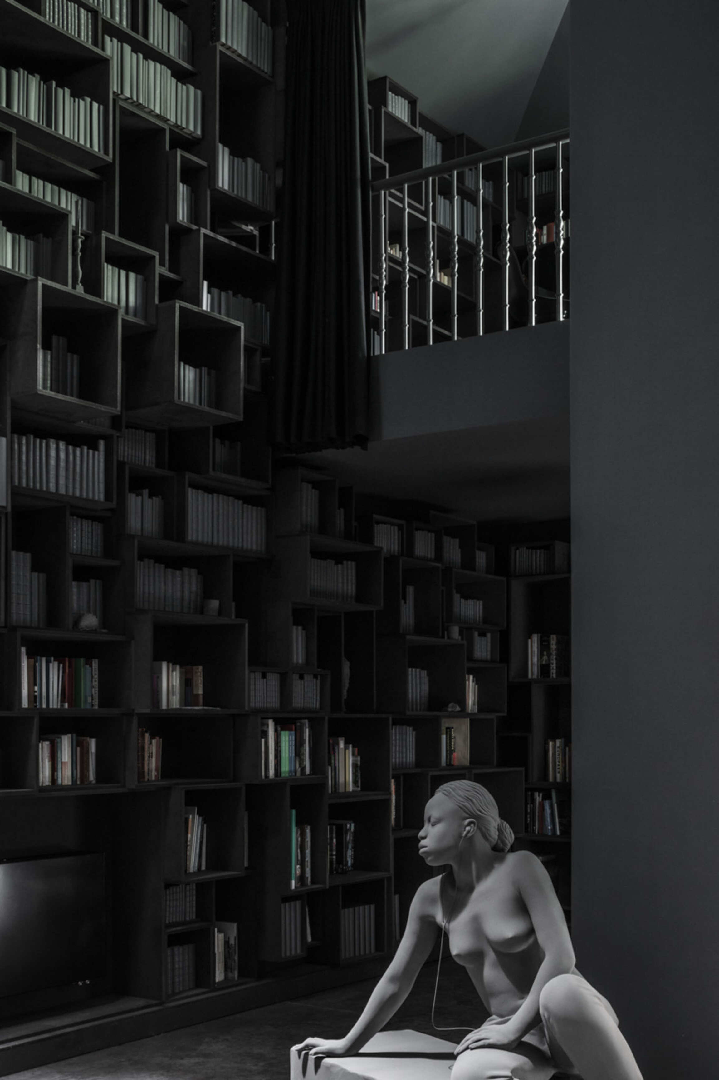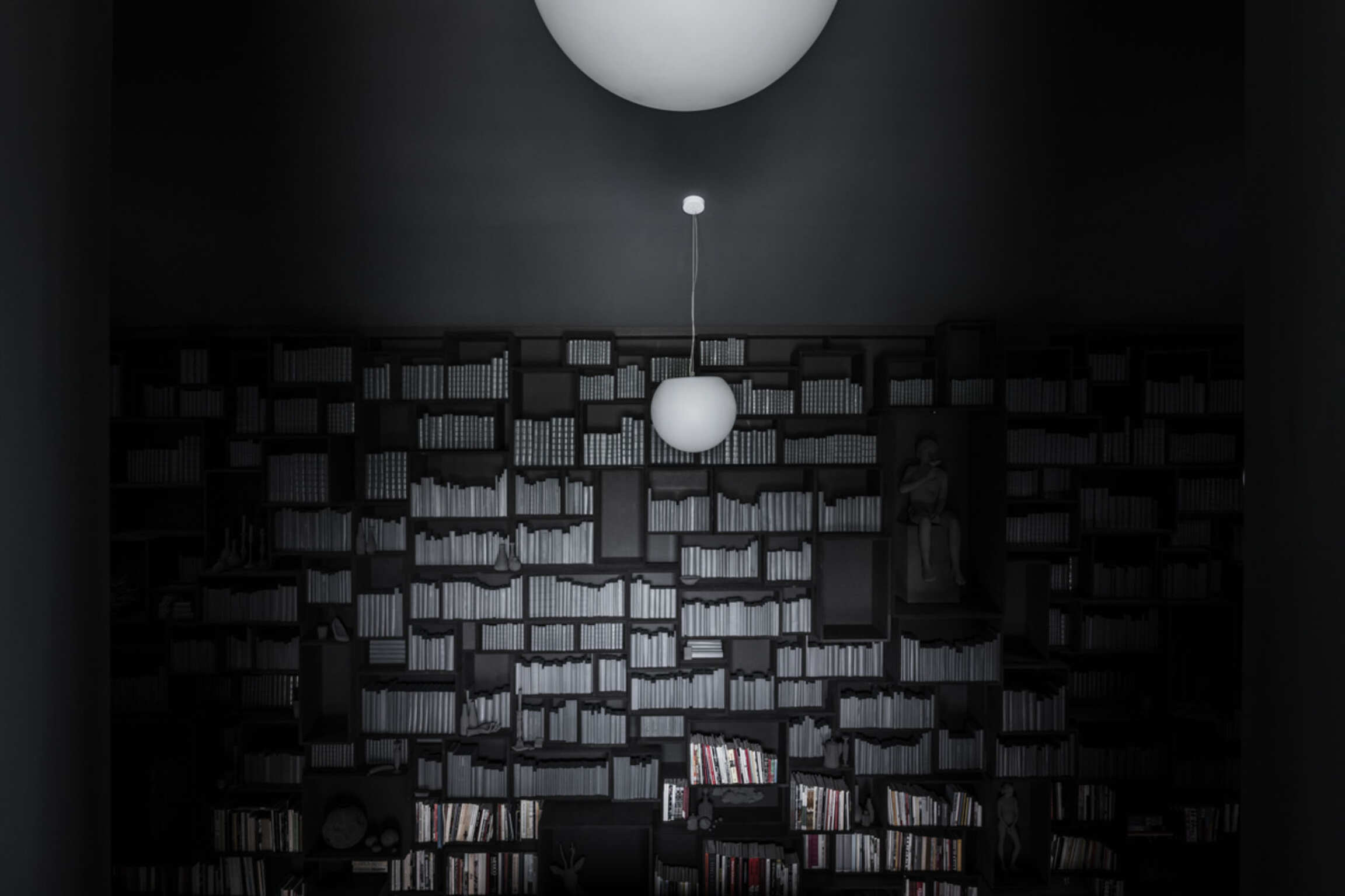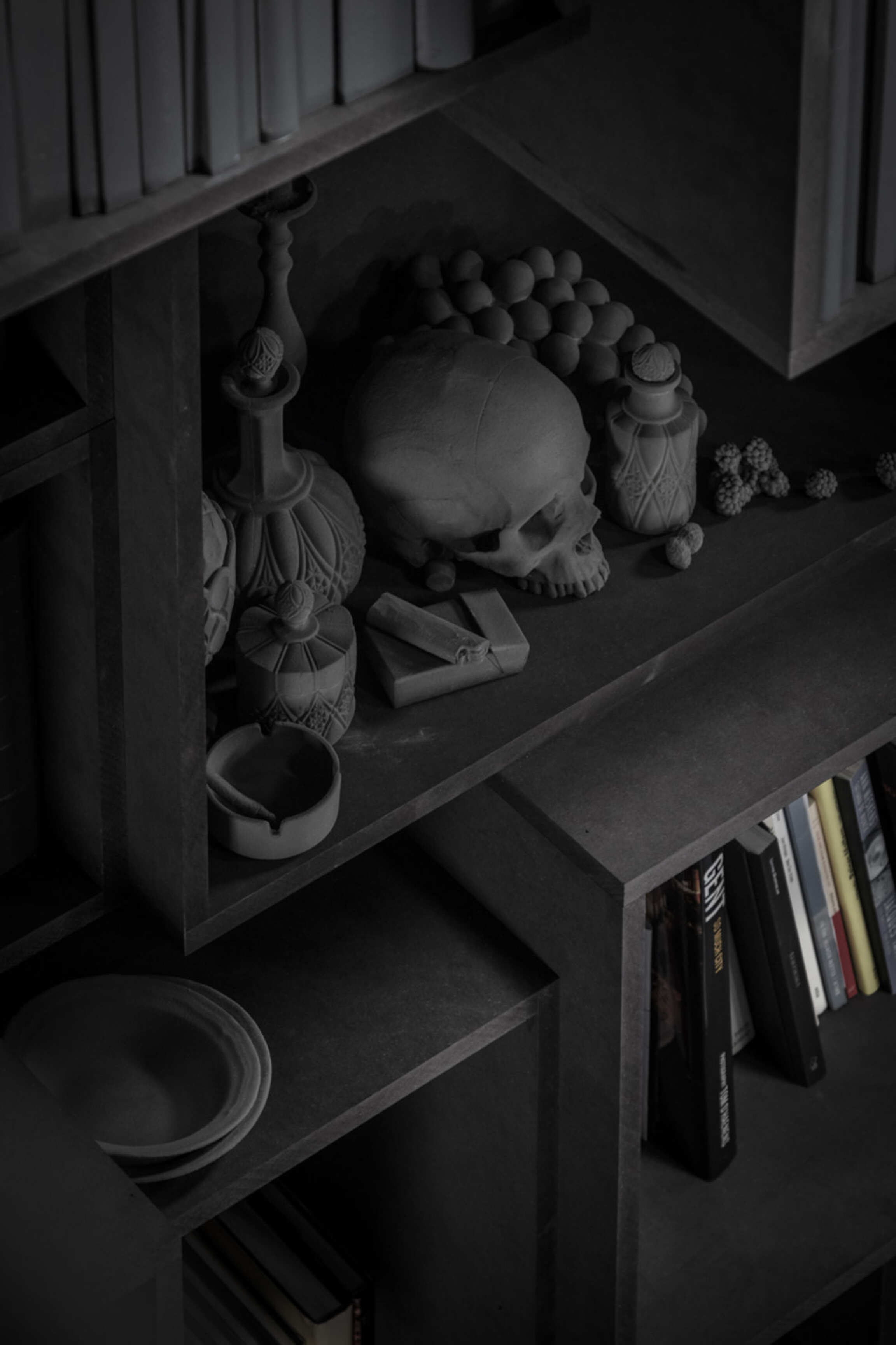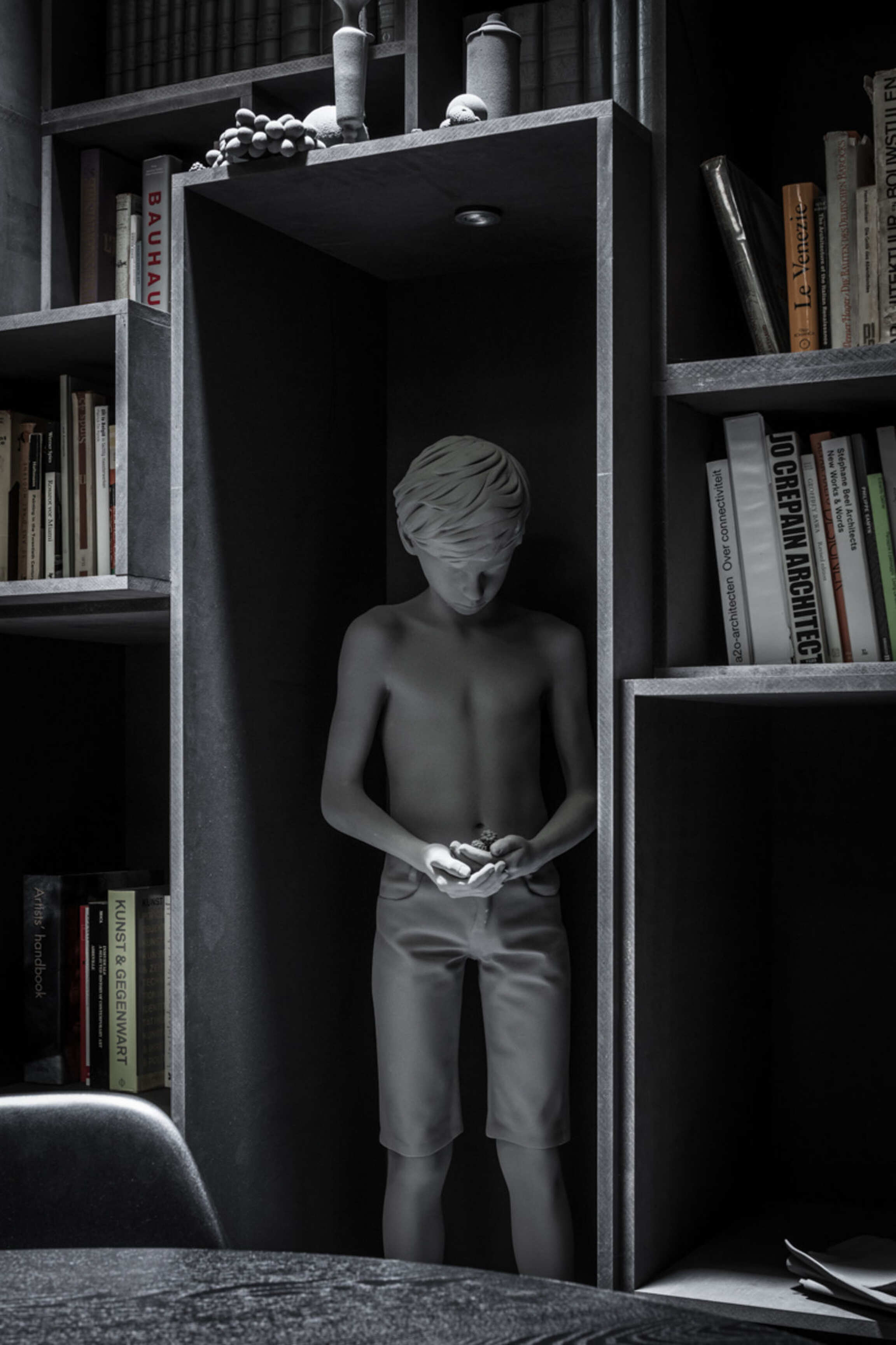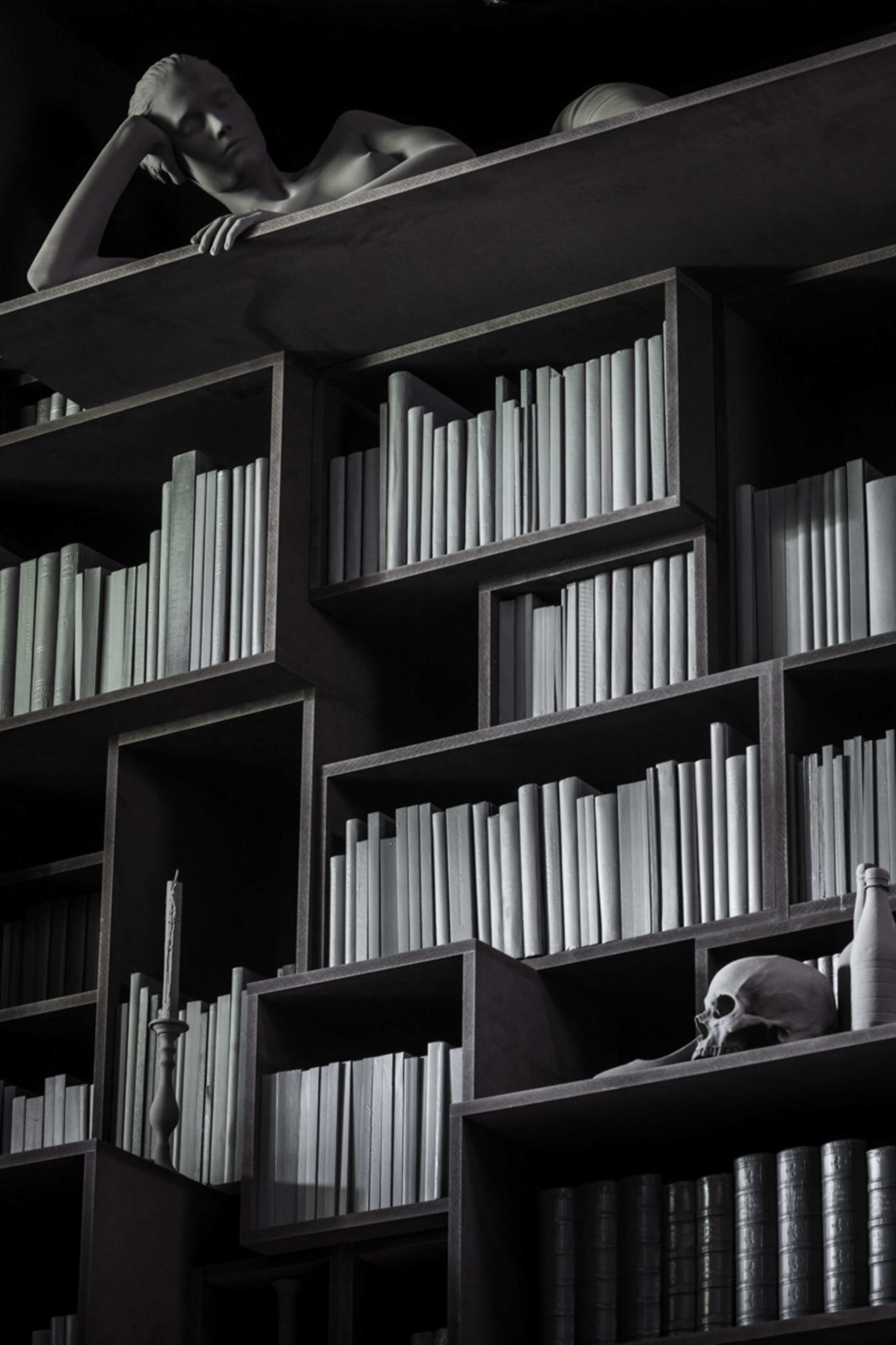 Through Op de Beeck's intervention, the original 'cottage' villa has become a true work of art. The black envelope abstracts the original, almost kitschy 'cottage' villa into a plastic, monumental sculpture in the idyllic Lys landscape. In turn, the monochrome gray interior that has been staged as a fictional 'wunderkammer' invites amazement and introspection. In the library, which covers the four walls from floor to ceiling, various rarities in the form of sculptures form a theatrical, almost cinematic setting for the 'real' collection of books Jan Hoet. In this Wunderkammer the experience of the viewer is central. The artwork resolutely aims at an immersive experience in which both the exterior and the interior enter into a dialogue with the surrounding environment, the coincidental passer-by and the visitor/resident.