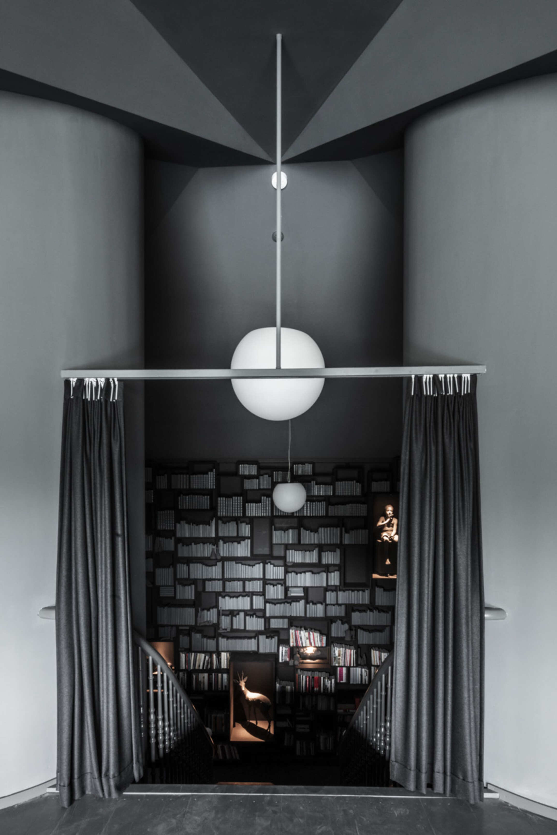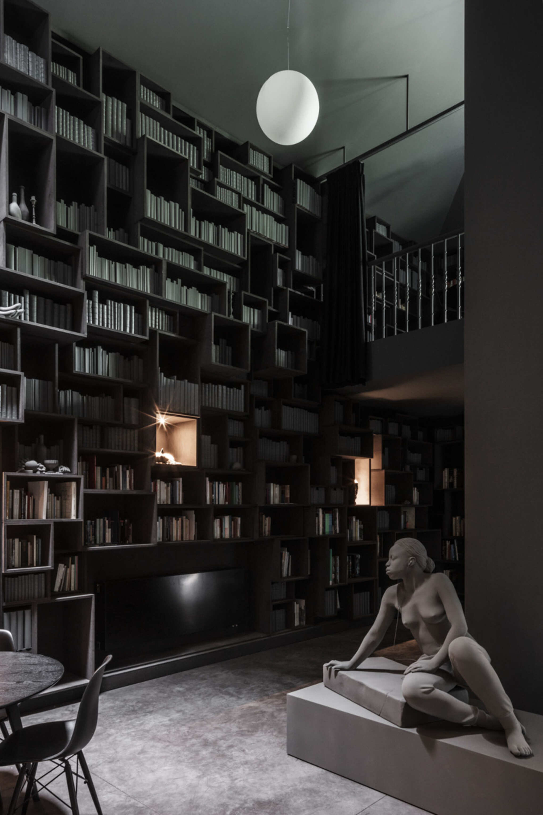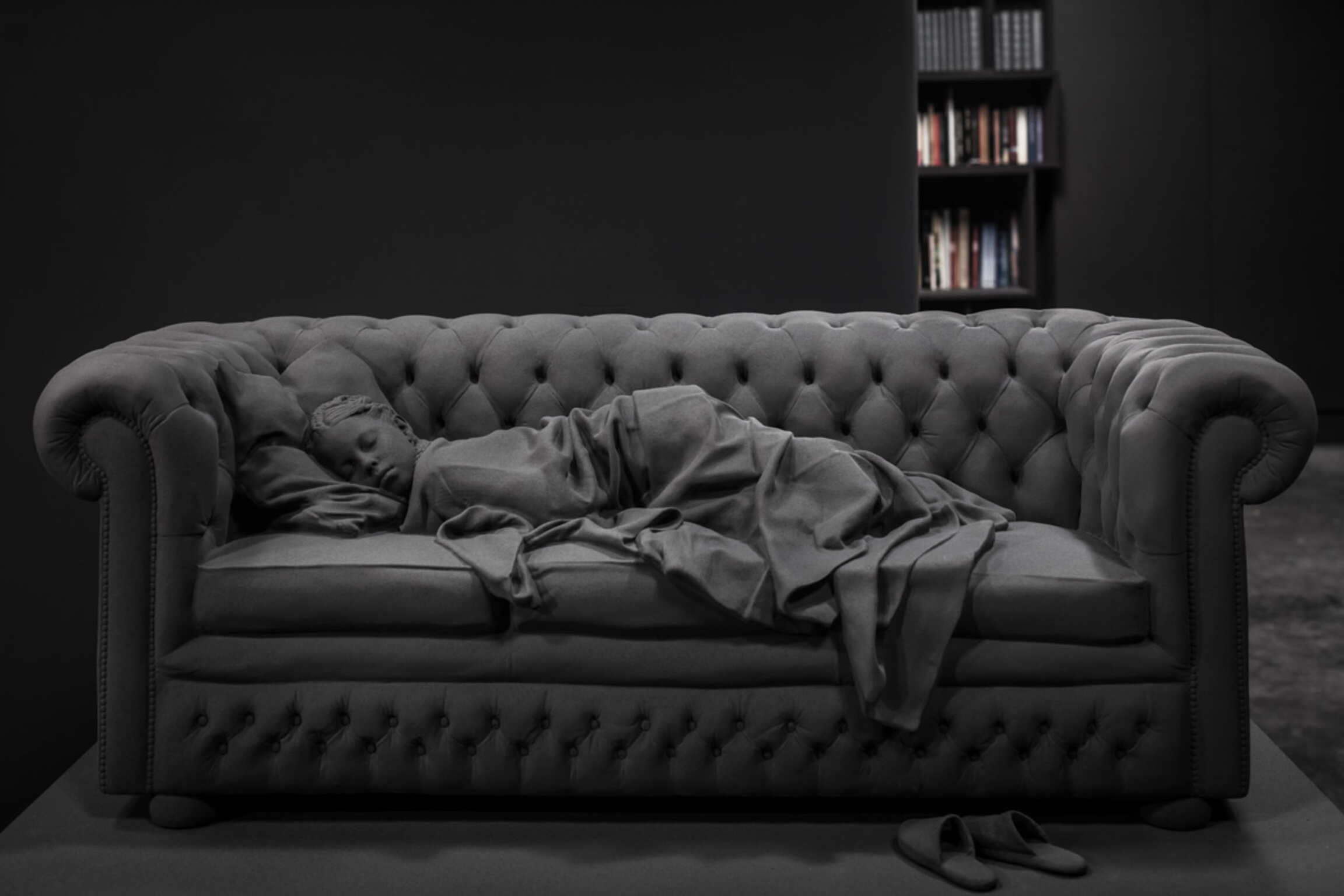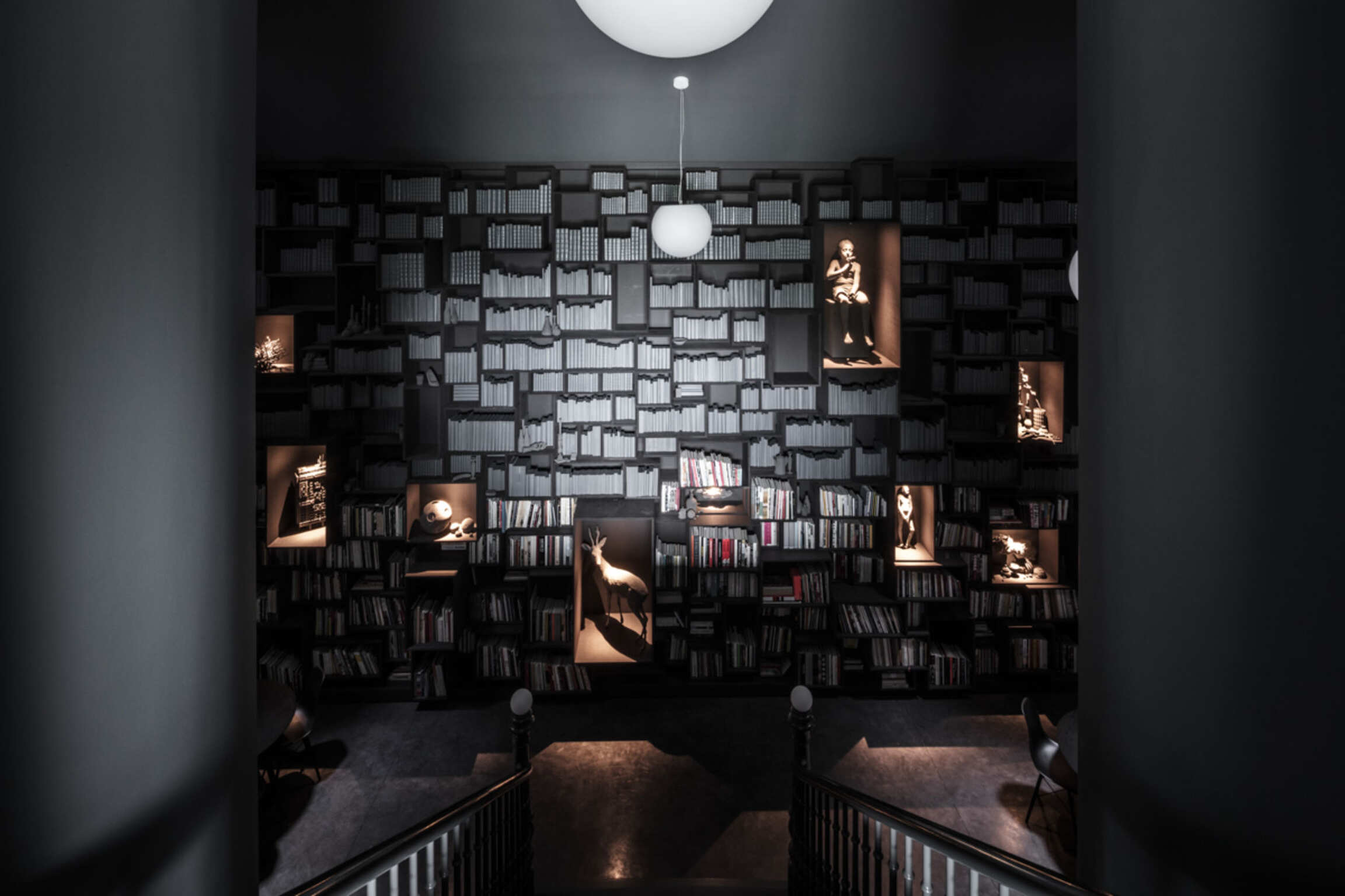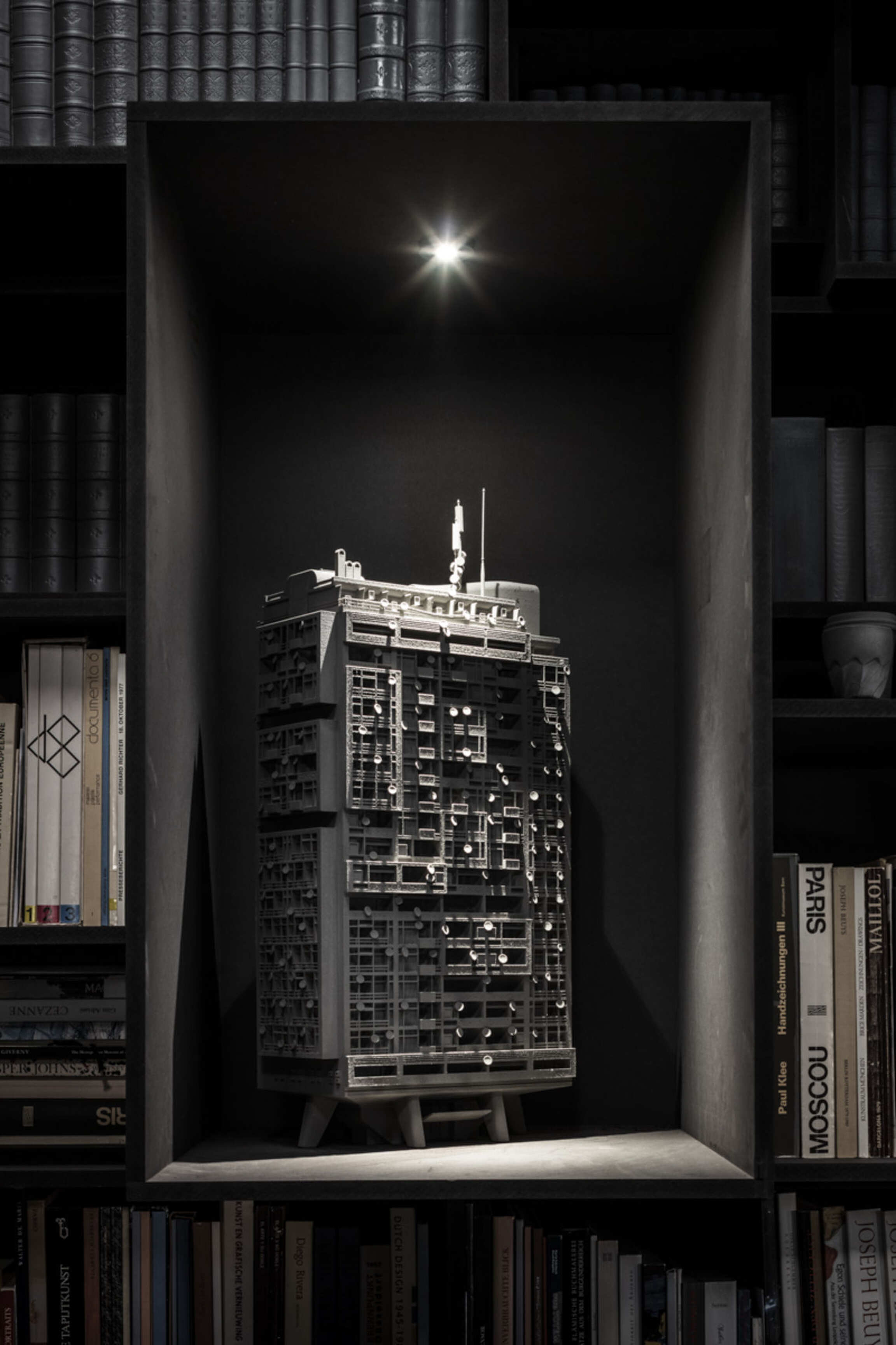 Through Op de Beeck's intervention, the original 'cottage' villa has become a true work of art. The black envelope abstracts the original, almost kitschy 'cottage' villa into a plastic, monumental sculpture in the idyllic Lys landscape. In turn, the monochrome gray interior that has been staged as a fictional 'wunderkammer' invites amazement and introspection. In the library, which covers the four walls from floor to ceiling, various rarities in the form of sculptures form a theatrical, almost cinematic setting for the 'real' collection of books Jan Hoet. In this Wunderkammer the experience of the viewer is central. The artwork resolutely aims at an immersive experience in which both the exterior and the interior enter into a dialogue with the surrounding environment, the coincidental passer-by and the visitor/resident.