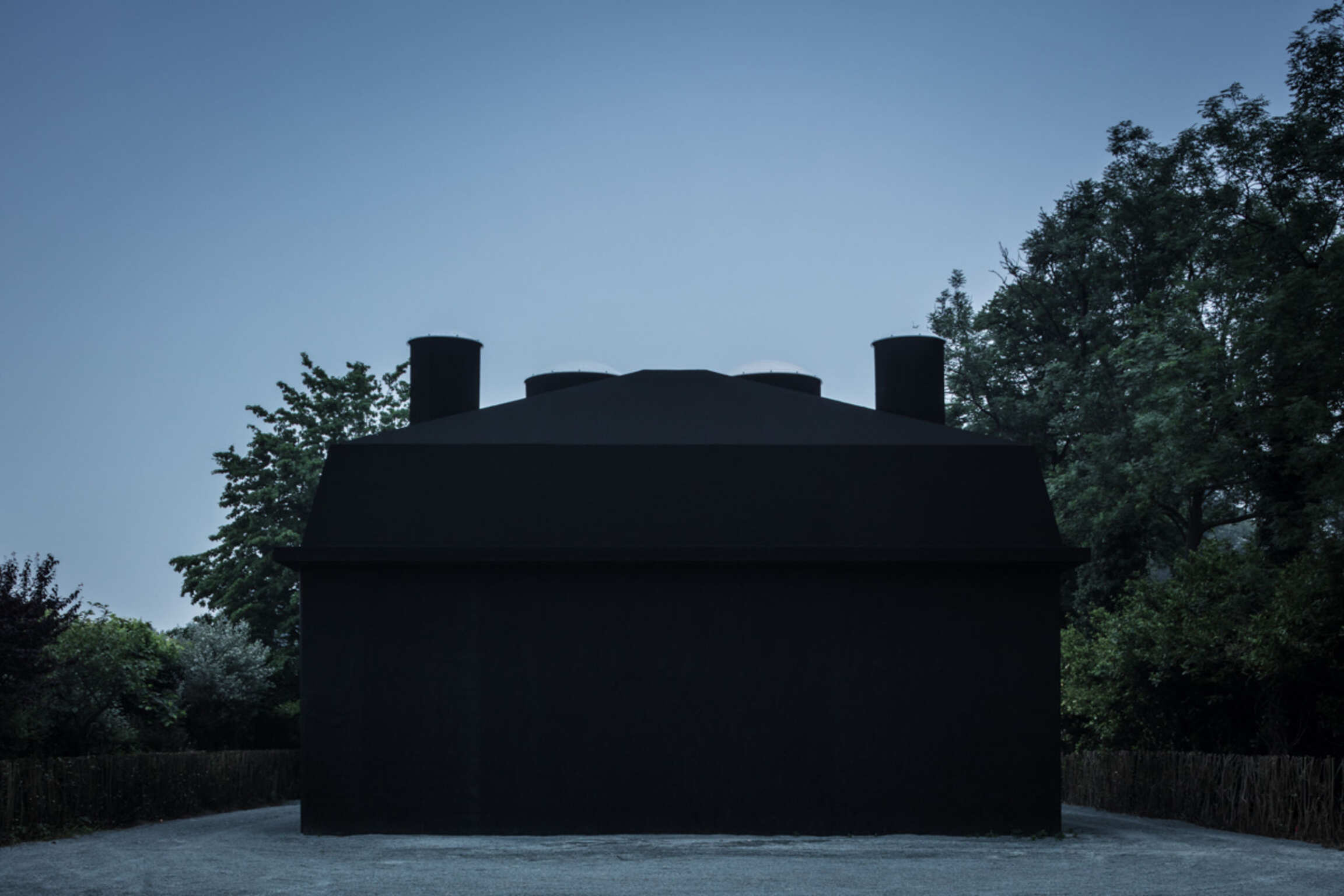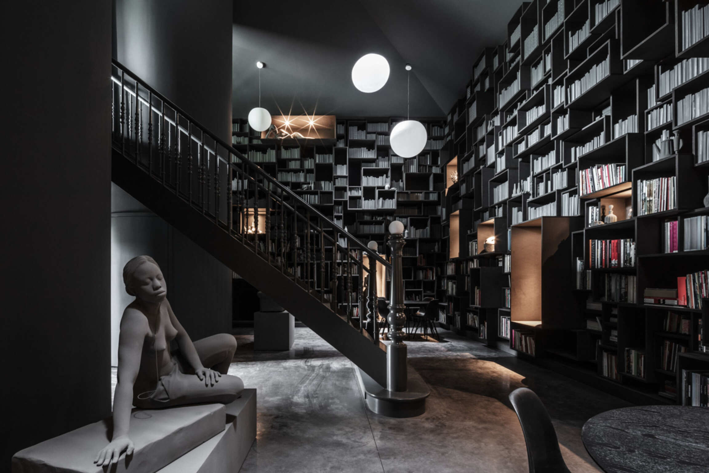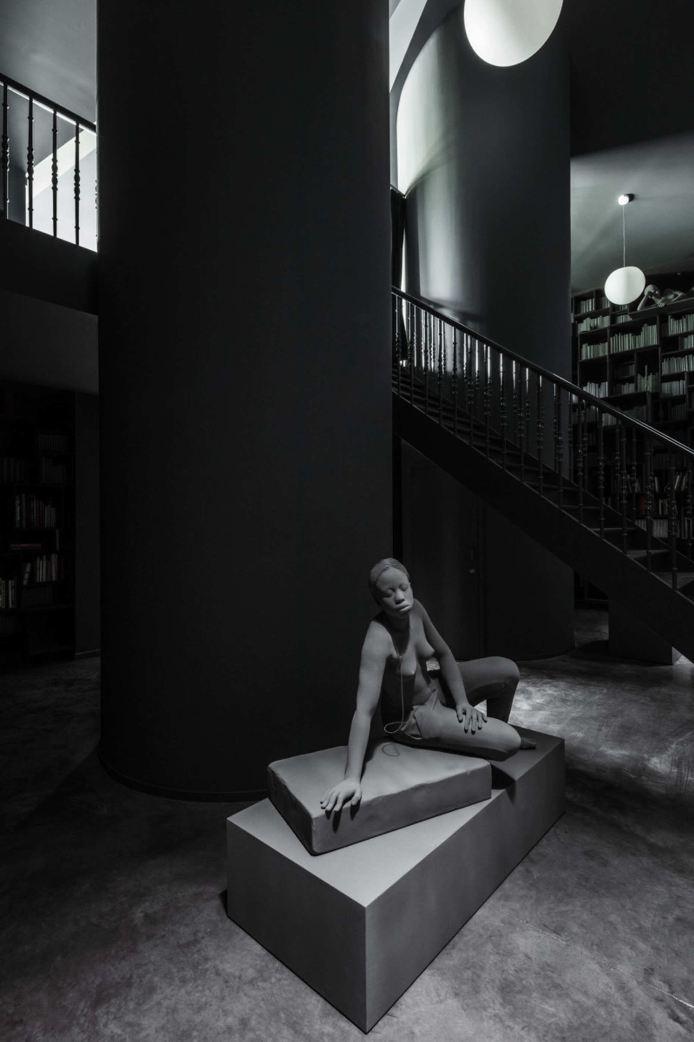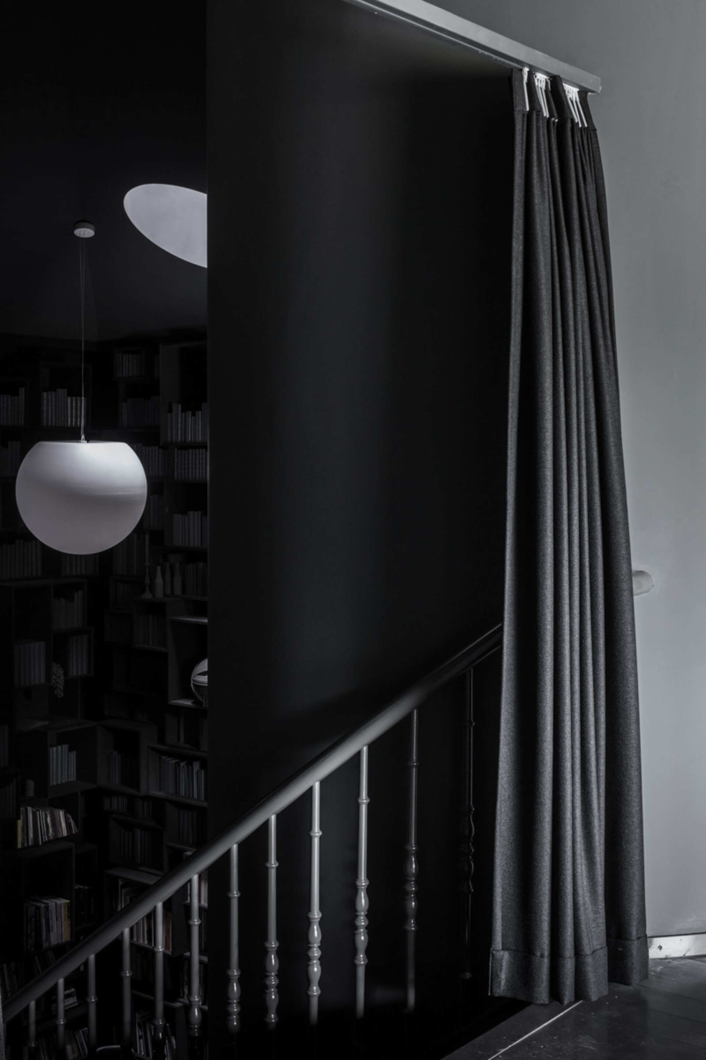 Through Op de Beeck's intervention, the original 'cottage' villa has become a true work of art. The black envelope abstracts the original, almost kitschy 'cottage' villa into a plastic, monumental sculpture in the idyllic Lys landscape. In turn, the monochrome gray interior that has been staged as a fictional 'wunderkammer' invites amazement and introspection. In the library, which covers the four walls from floor to ceiling, various rarities in the form of sculptures form a theatrical, almost cinematic setting for the 'real' collection of books Jan Hoet. In this Wunderkammer the experience of the viewer is central. The artwork resolutely aims at an immersive experience in which both the exterior and the interior enter into a dialogue with the surrounding environment, the coincidental passer-by and the visitor/resident.