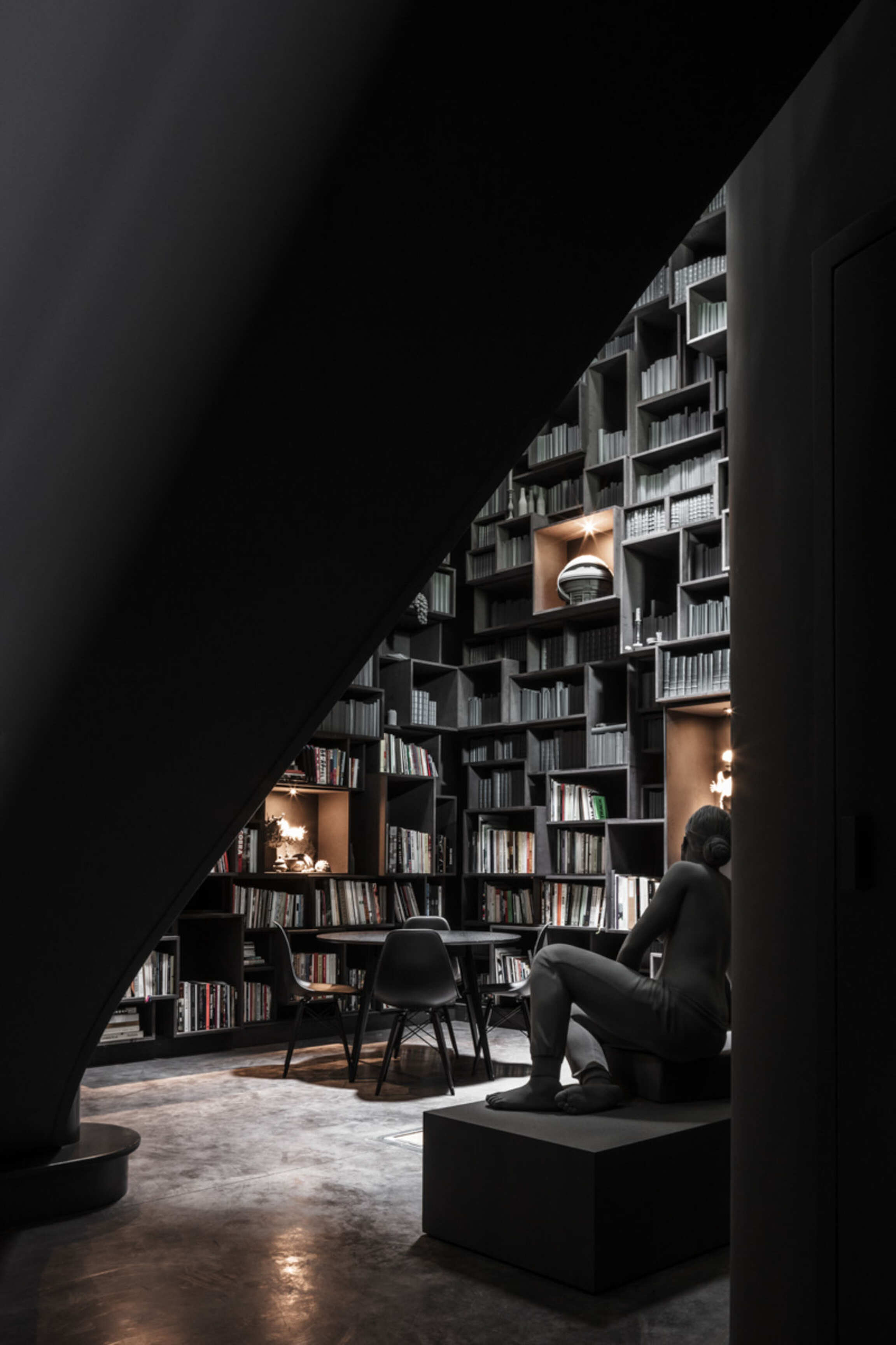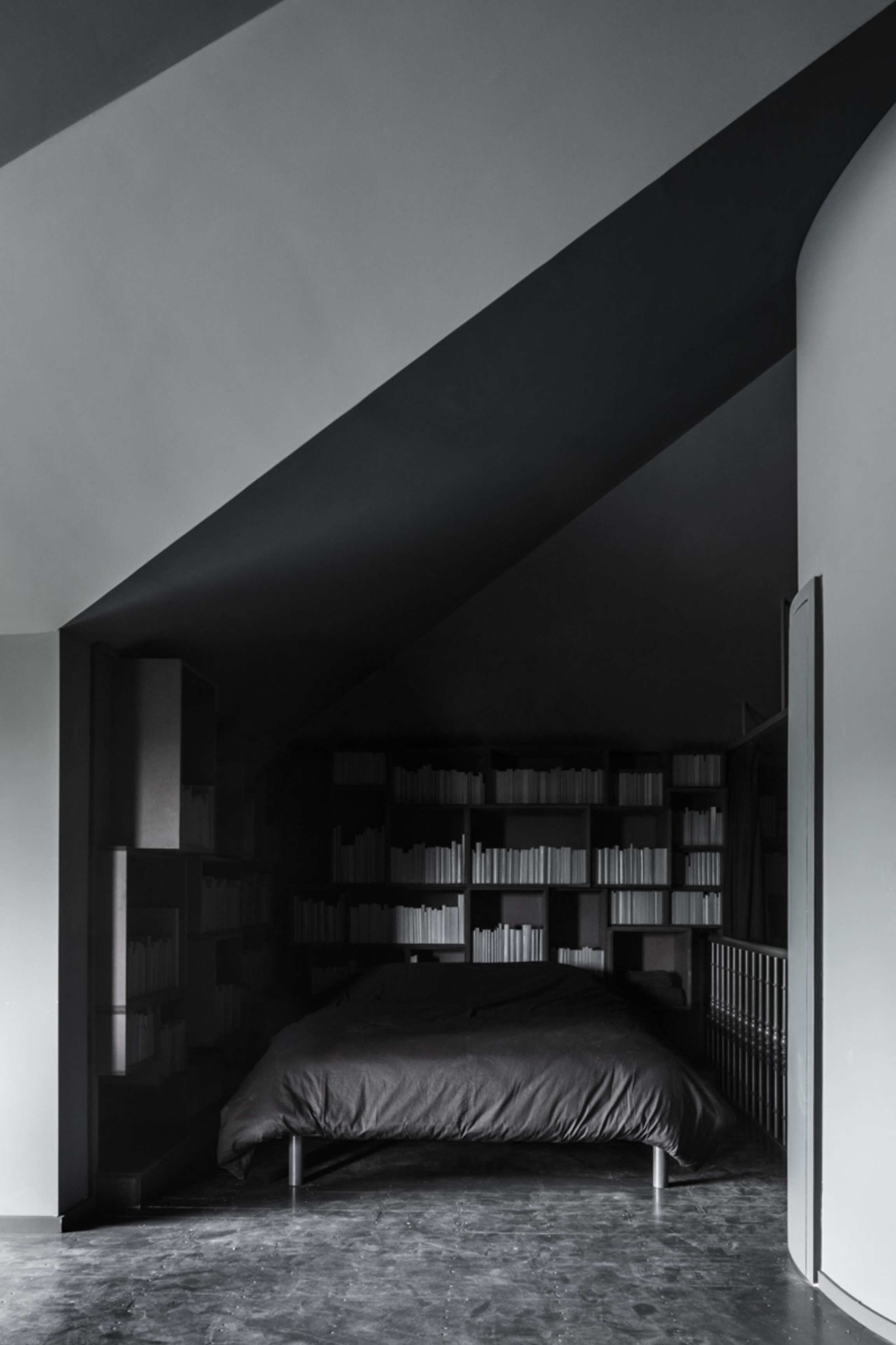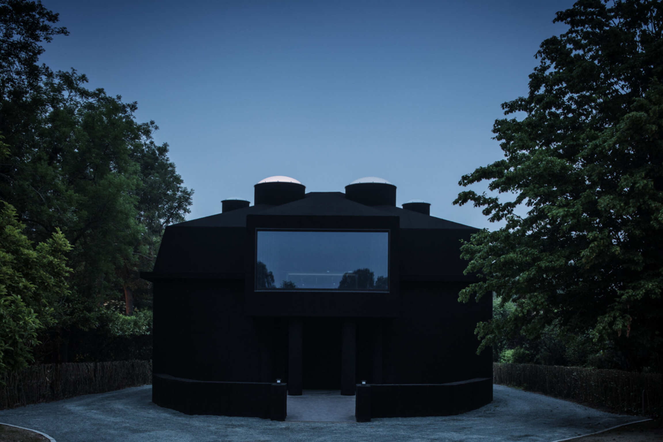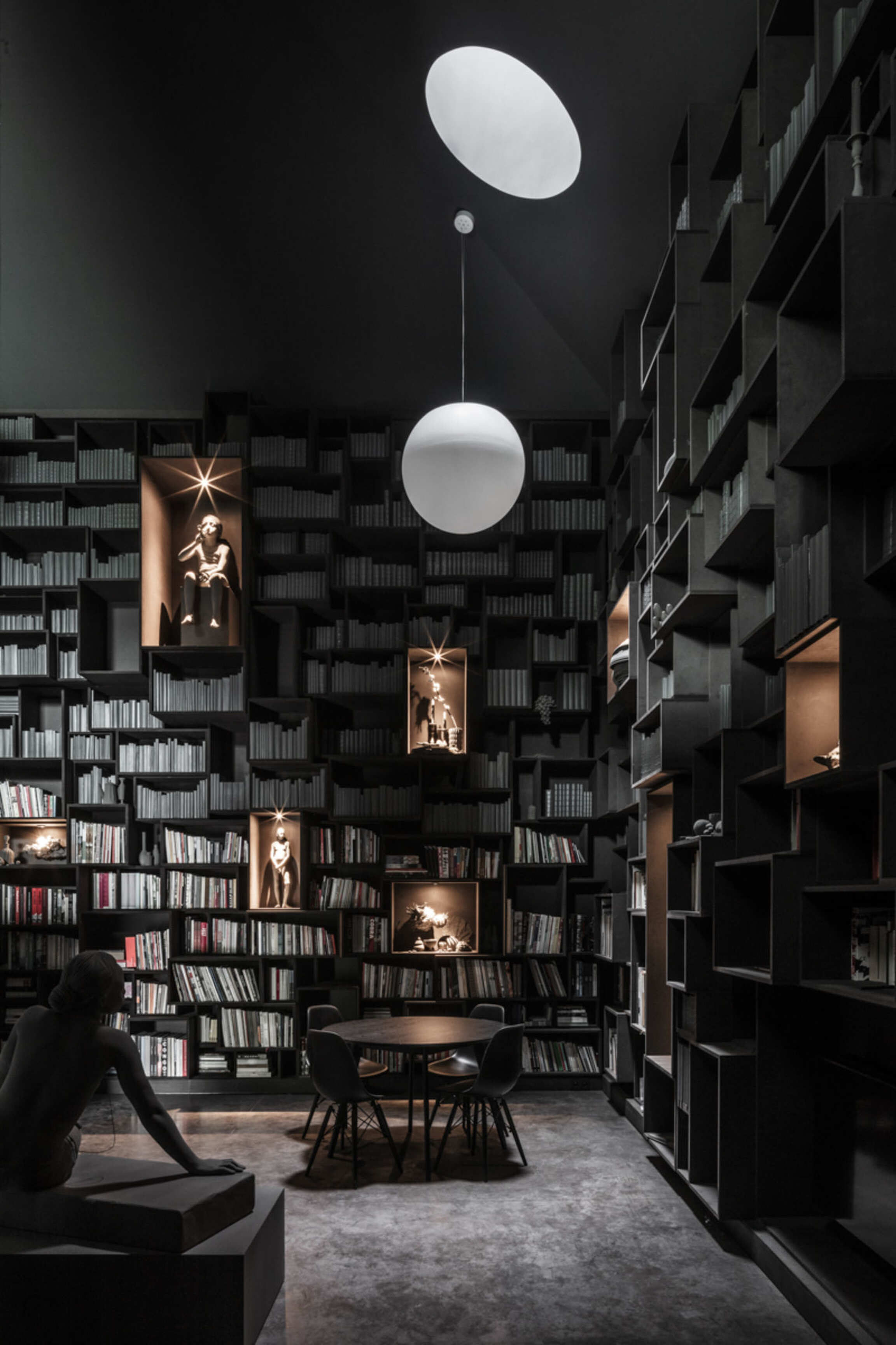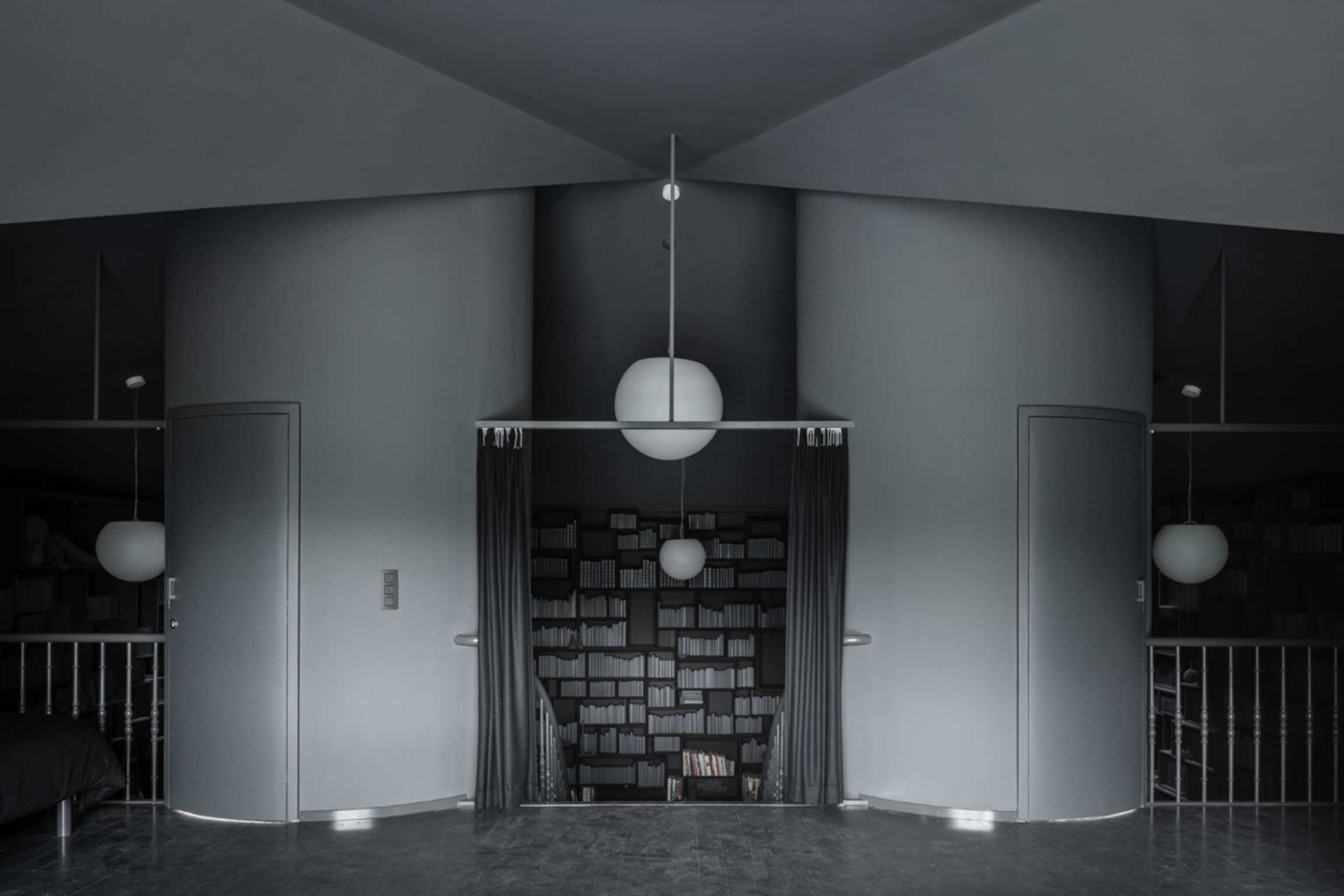 Through Op de Beeck's intervention, the original 'cottage' villa has become a true work of art. The black envelope abstracts the original, almost kitschy 'cottage' villa into a plastic, monumental sculpture in the idyllic Lys landscape. In turn, the monochrome gray interior that has been staged as a fictional 'wunderkammer' invites amazement and introspection. In the library, which covers the four walls from floor to ceiling, various rarities in the form of sculptures form a theatrical, almost cinematic setting for the 'real' collection of books Jan Hoet. In this Wunderkammer the experience of the viewer is central. The artwork resolutely aims at an immersive experience in which both the exterior and the interior enter into a dialogue with the surrounding environment, the coincidental passer-by and the visitor/resident.