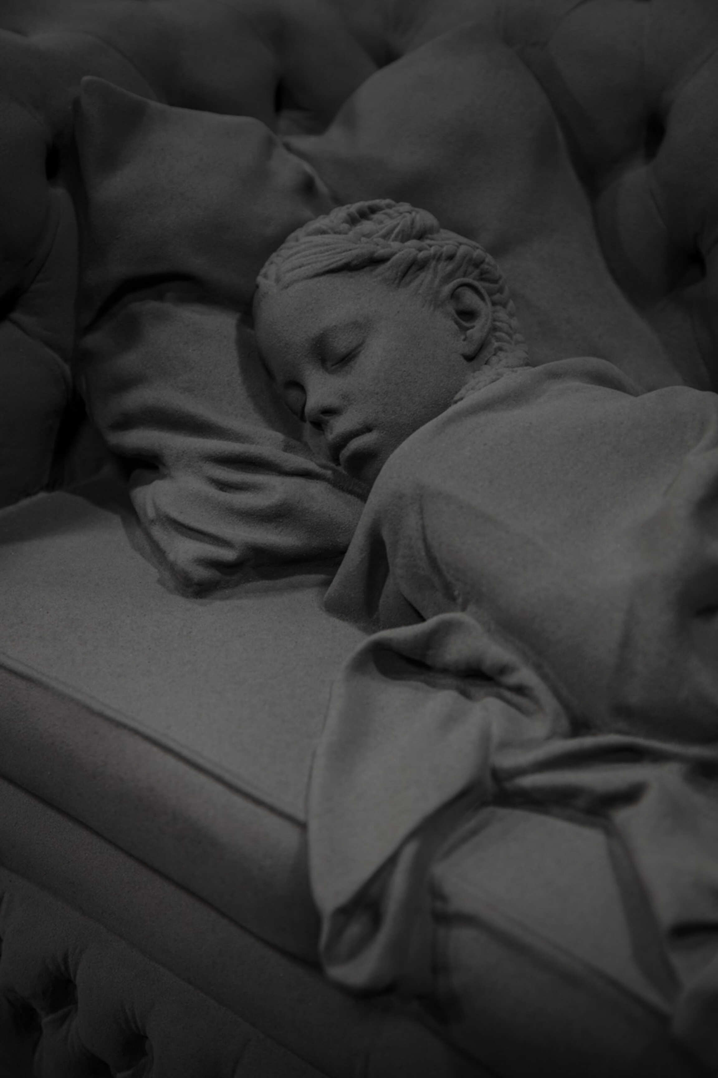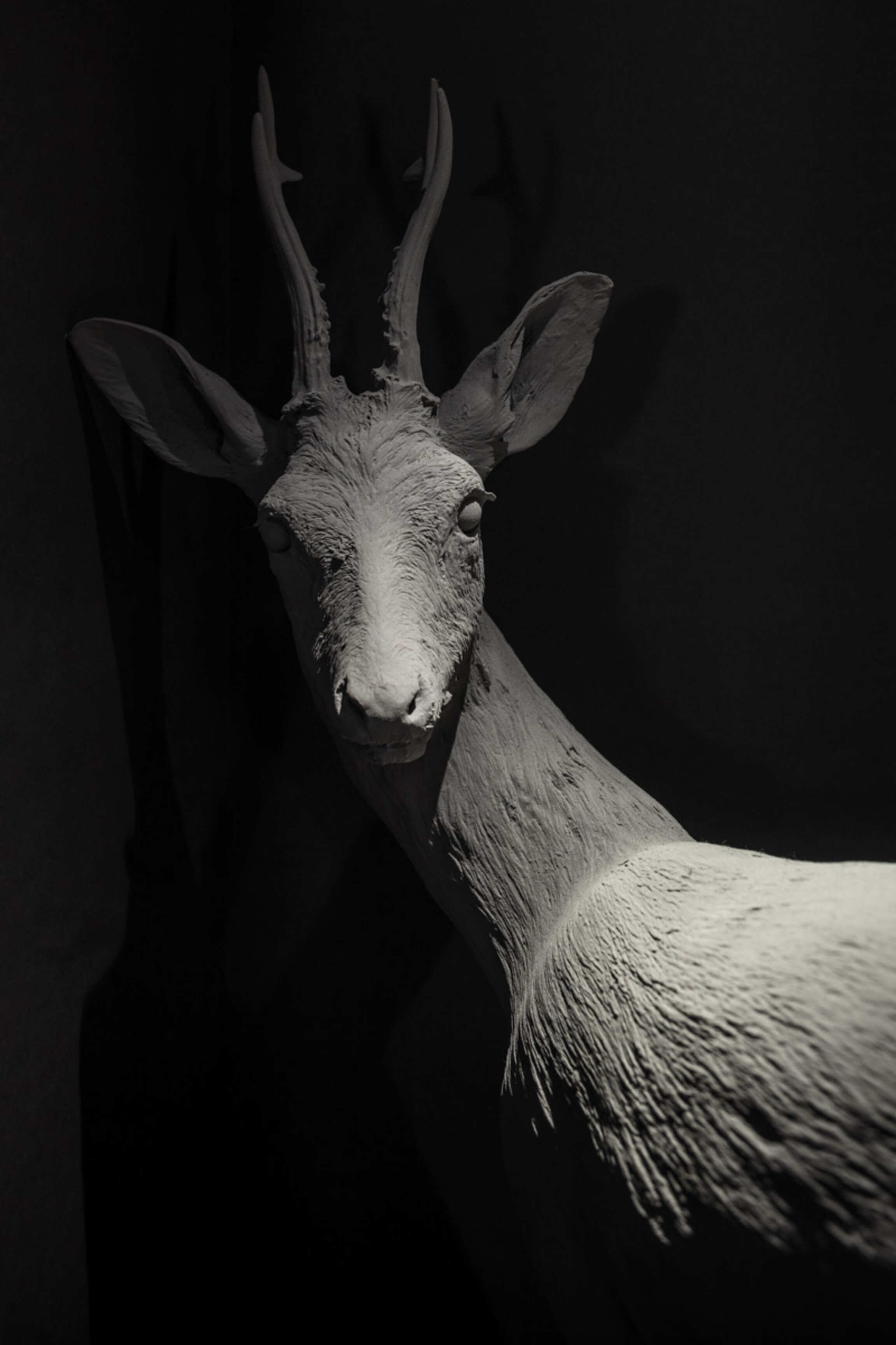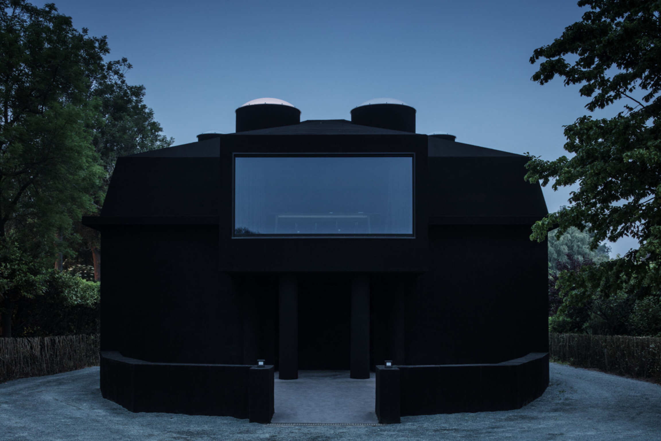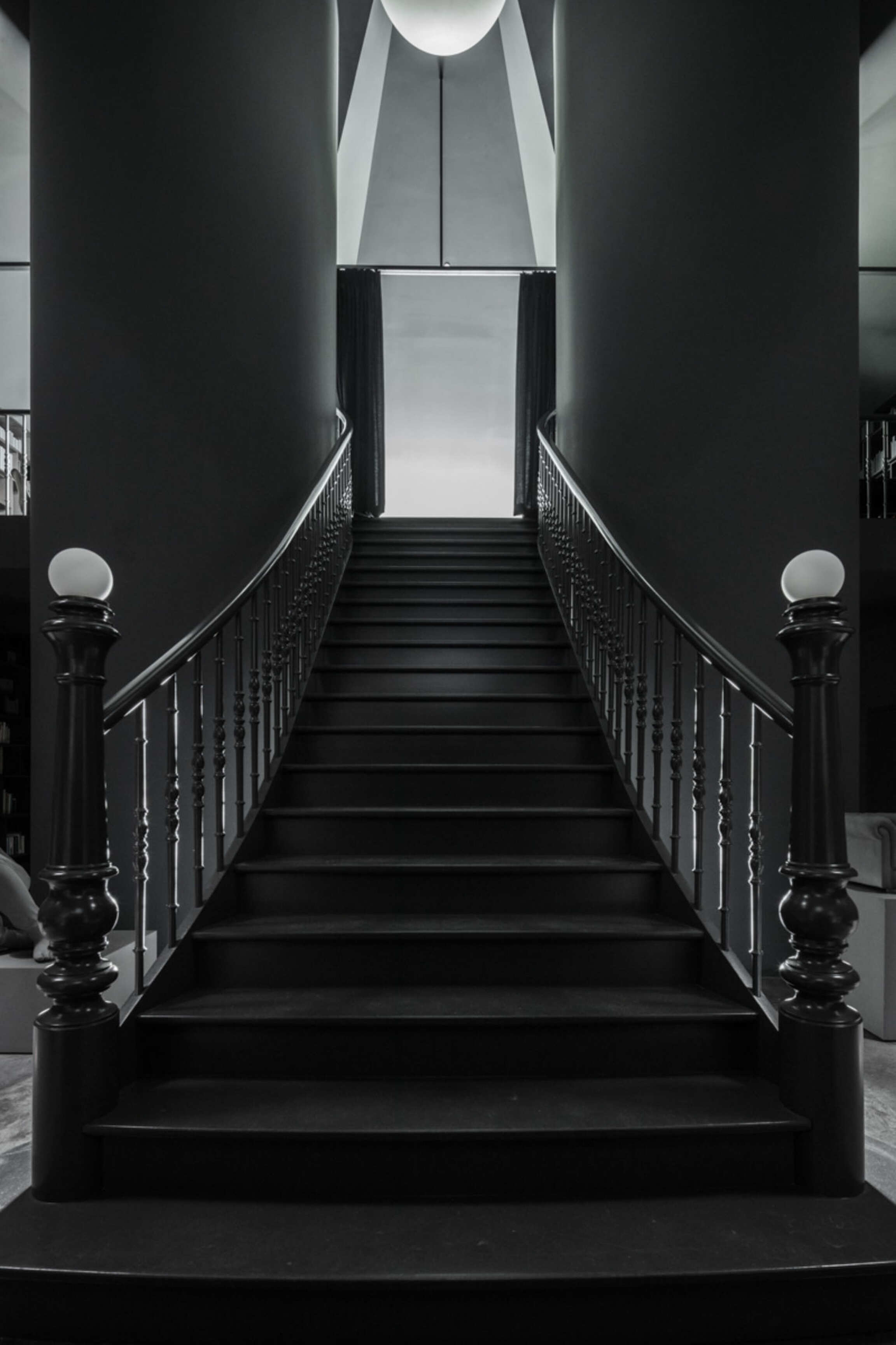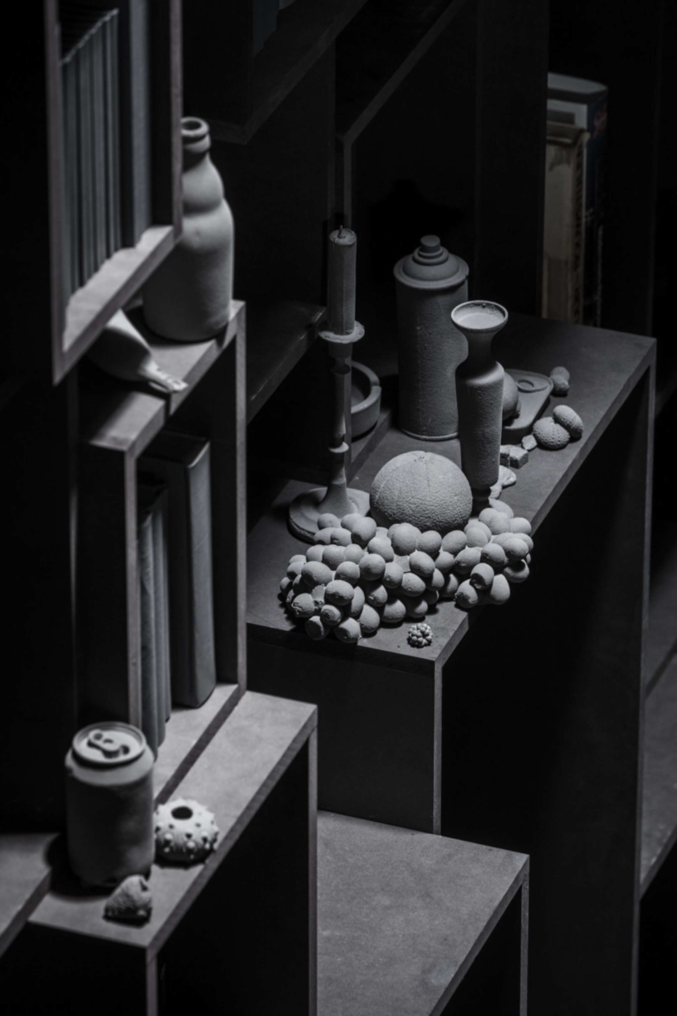 Through Op de Beeck's intervention, the original 'cottage' villa has become a true work of art. The black envelope abstracts the original, almost kitschy 'cottage' villa into a plastic, monumental sculpture in the idyllic Lys landscape. In turn, the monochrome gray interior that has been staged as a fictional 'wunderkammer' invites amazement and introspection. In the library, which covers the four walls from floor to ceiling, various rarities in the form of sculptures form a theatrical, almost cinematic setting for the 'real' collection of books Jan Hoet. In this Wunderkammer the experience of the viewer is central. The artwork resolutely aims at an immersive experience in which both the exterior and the interior enter into a dialogue with the surrounding environment, the coincidental passer-by and the visitor/resident.
