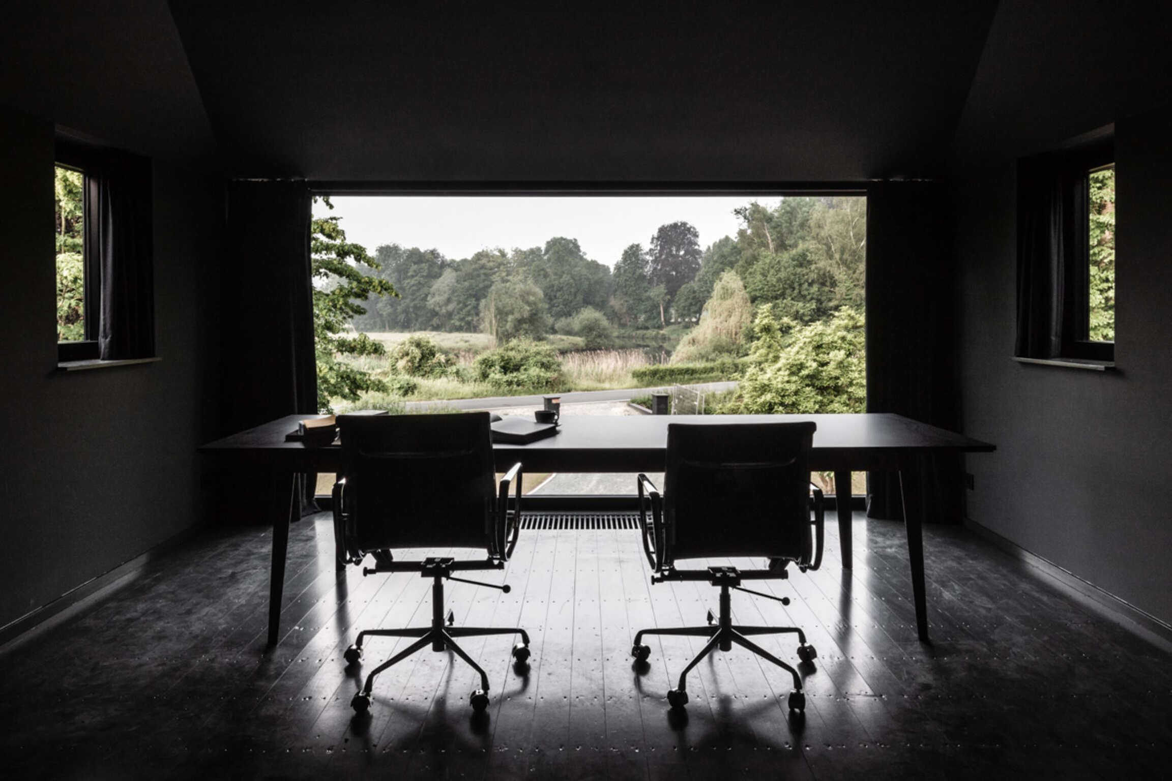 The museum Dhondt-Dhaenens (MDD) is since recently joined by The Wunderkammer Residence, a project by artist Hans Op de Beeck, realized in collaboration with architect Mo Vandenberghe (studio MOTO). Op de Beeck transformed the former Villa Meander, a villa built at the beginning of the 1930's, into a unique 'gesamtkunstwerk..’ The building is conceived as a contemporary 'wunderkammer' and houses the personal library collection of Jan Hoet (1936 - 2014) while also doubling as a residence for artists, curators, researchers and writers with an (inter)national, non-European focus. Set between the museum building from 1968, the historic Lys River and the former residence of Jules and Irma Dhondt-Dhaenens, the founders of the museum, The Wunderkammer aims to create a space for dialogue, reflection and research within the typical rural context of the museum.