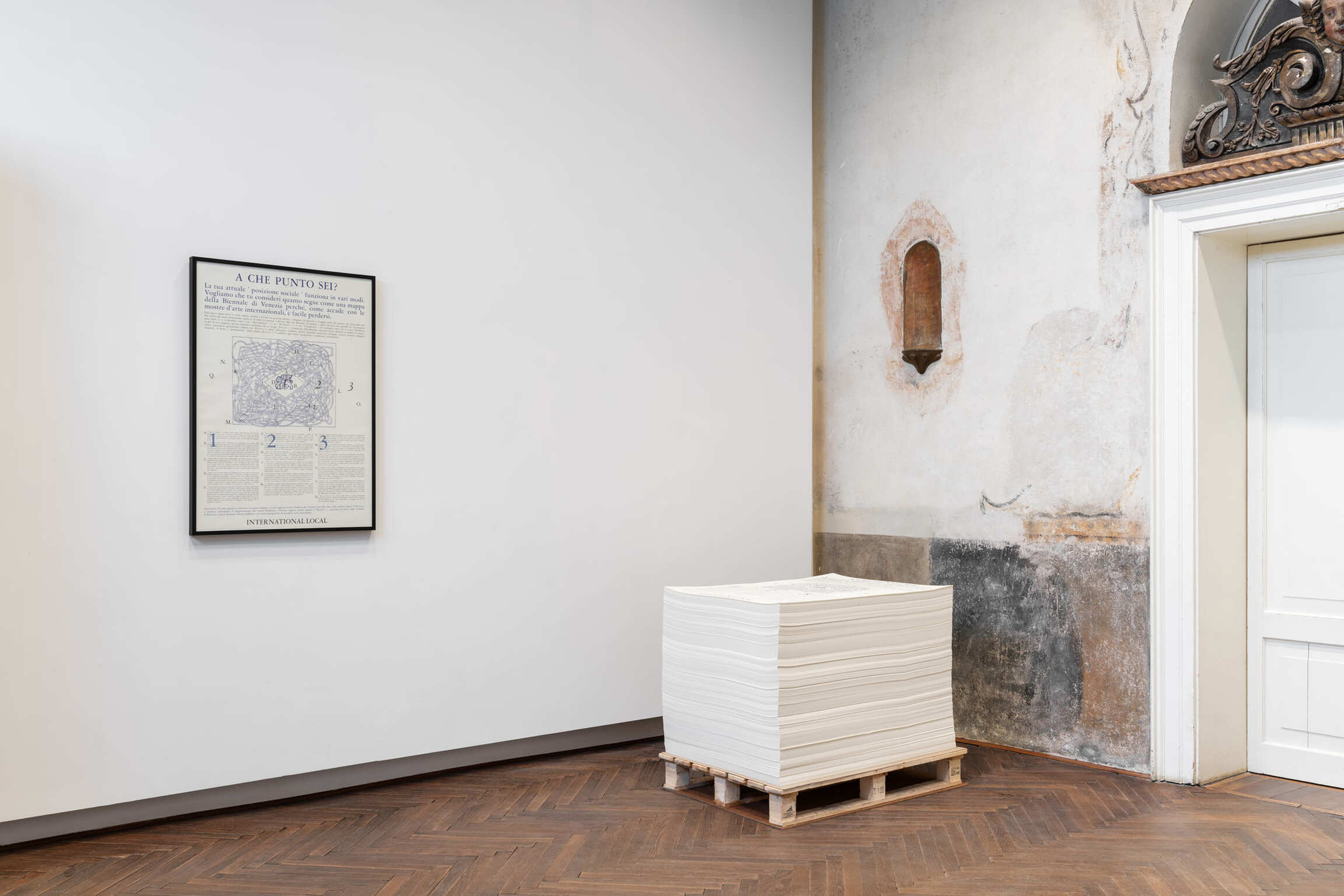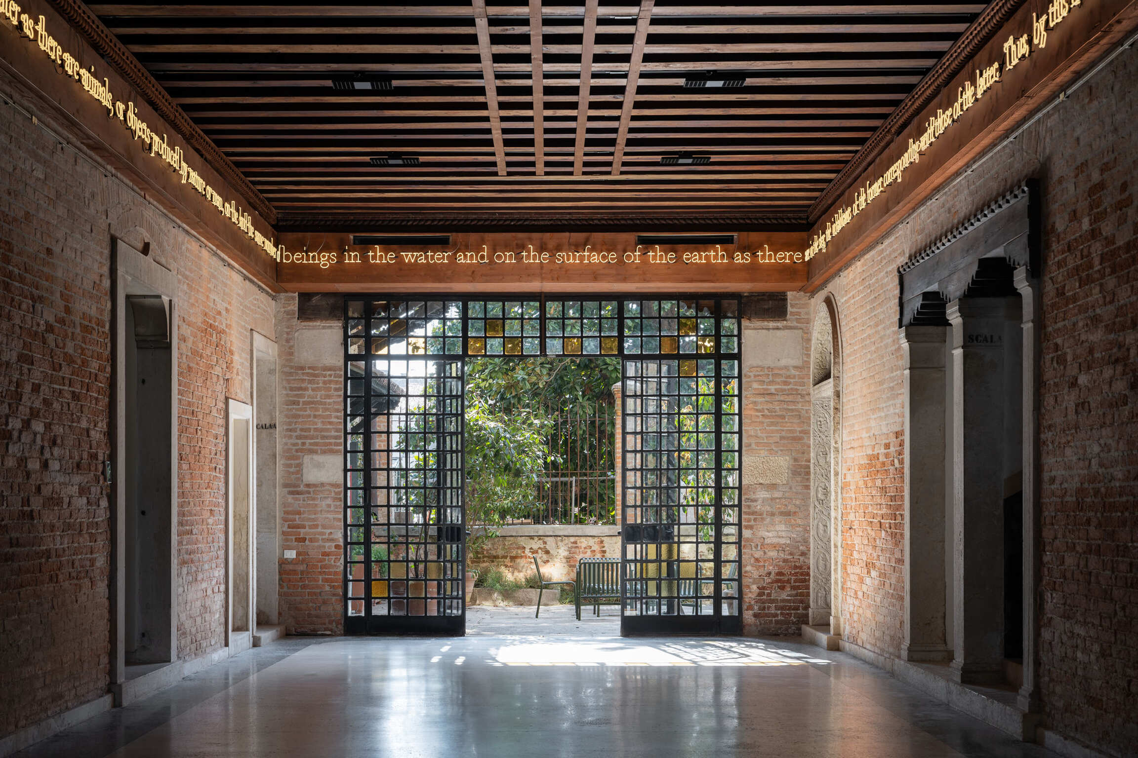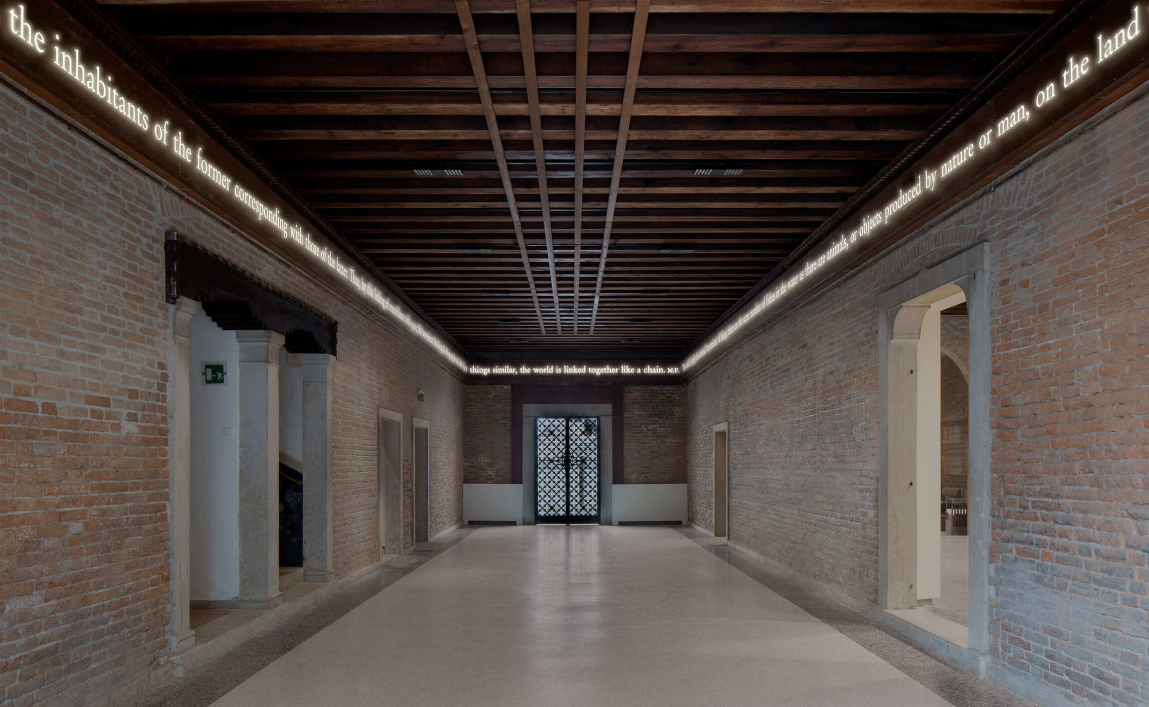 The exhibition opens with the site-specific installation A Chain of Resemblance, which wraps around the entrance hall of Casa dei Tre Oci. The work requires both seeing and reading to unfold the appropriated text by Michel Foucault, who describes the world as a network of interconnections of natural species which continually reflect and influence one another.