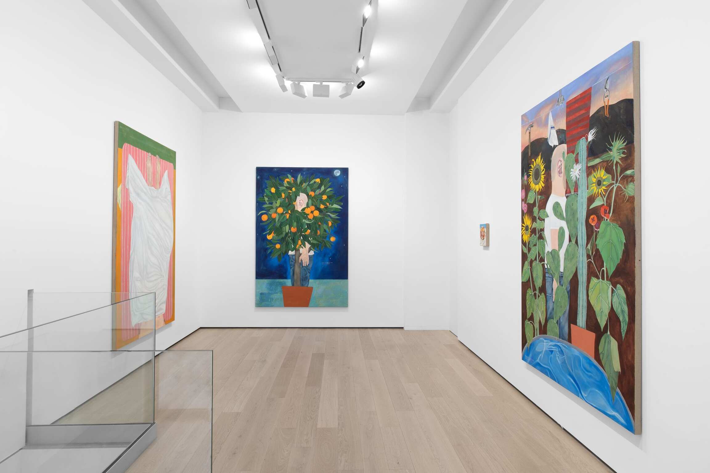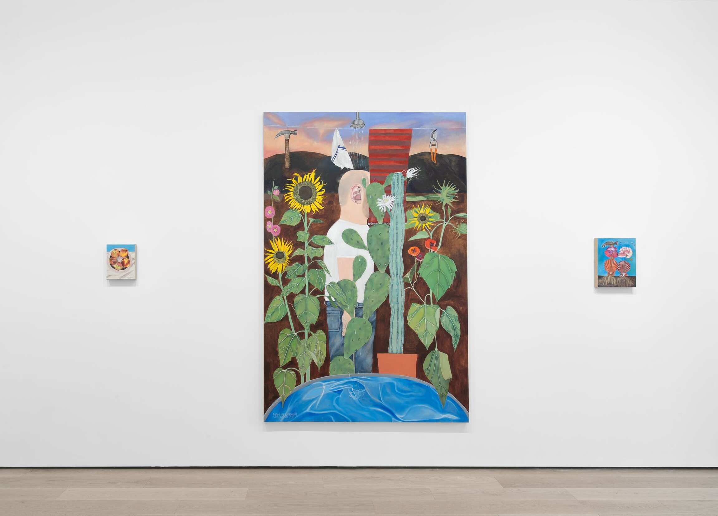 Los Angeles, city of mirrors, what Jean Baudrillard called a “paradisiac and inward-looking illusion,” is everywhere and nowhere in Michael Hilsman’s paintings. The Southern California landscape in which the artist was born and raised – and where he lives and works today – appears in his work as a space for self-reflection. Like the fabricated façades of a movie set, the works’ primary illusion is their appearance of flatness, which only enhances their metaphysical depth. Bodies study their own contours in a limitless expanse. Loneliness is as abundant as sunshine. Lush gardens and empty horizons, bathed in crepuscular light, are places where the subconscious will roam.