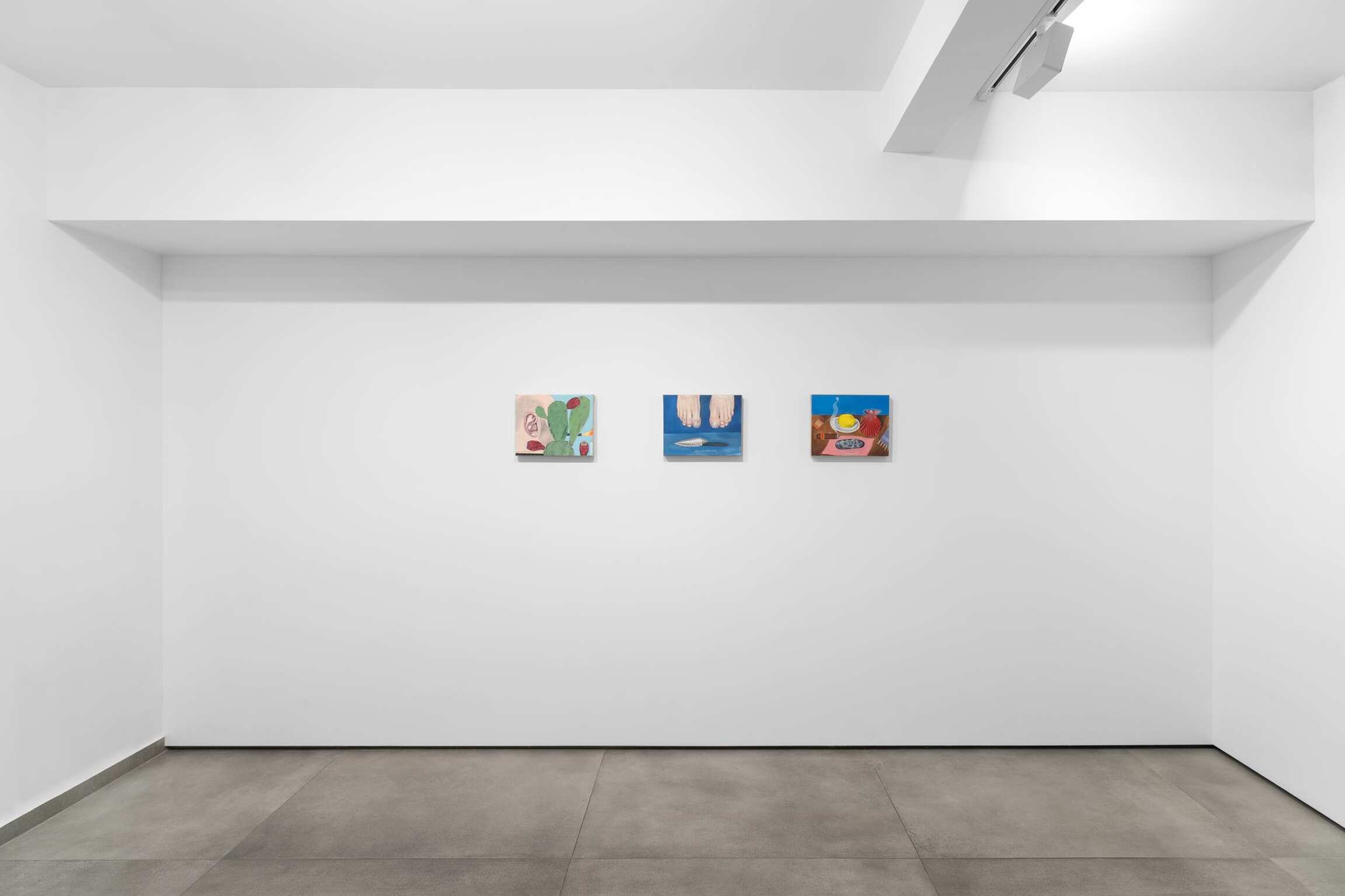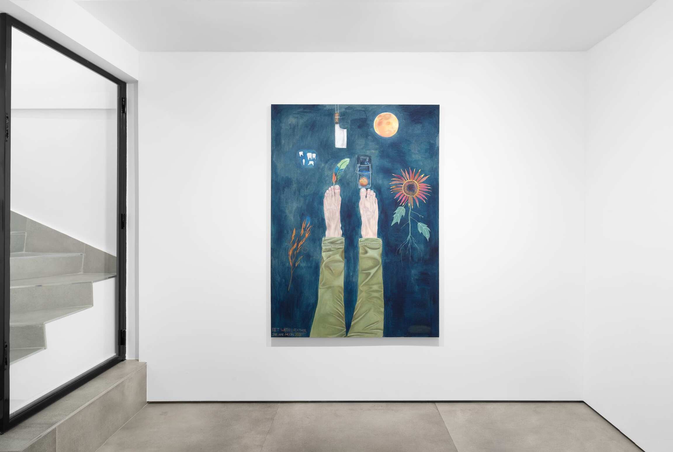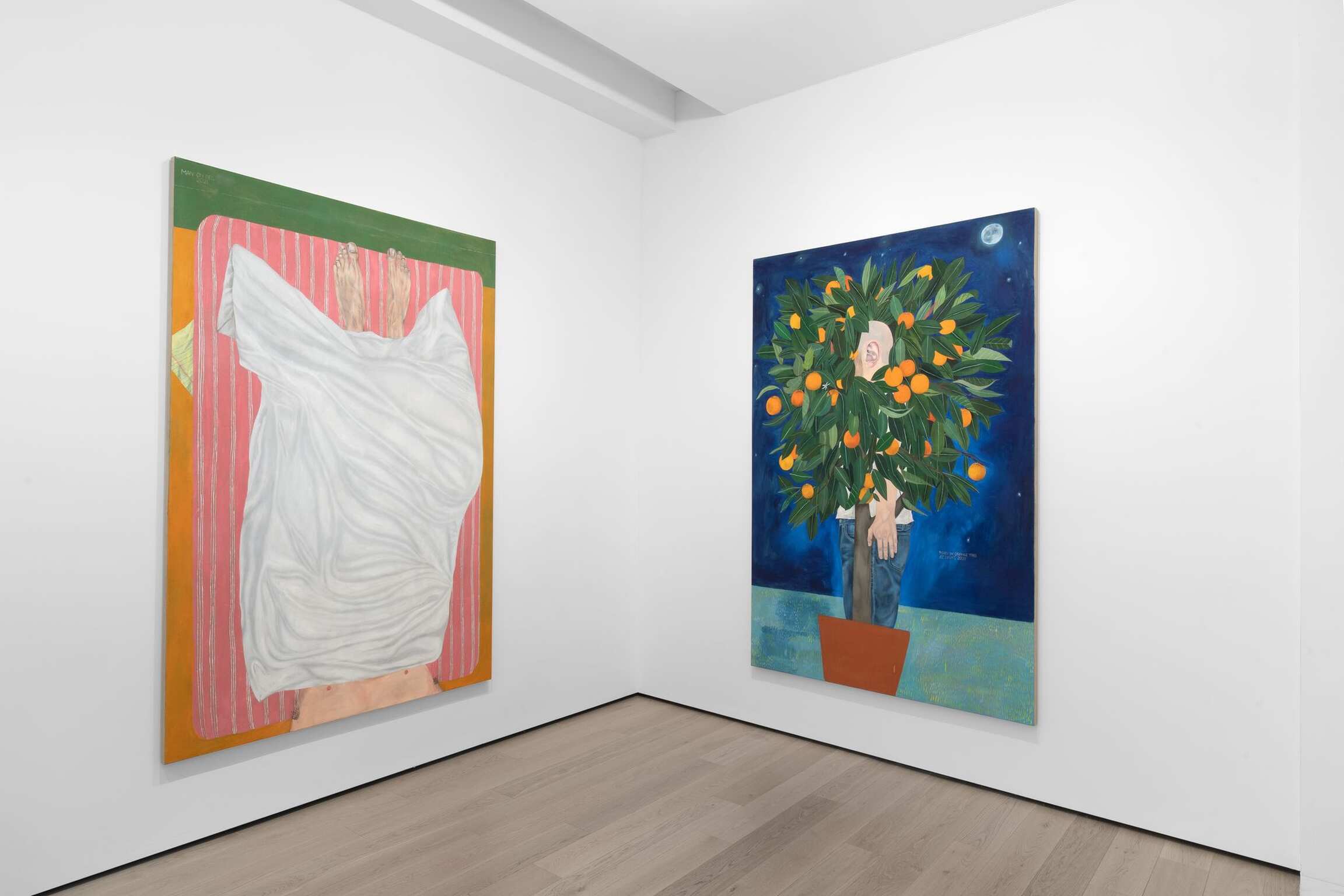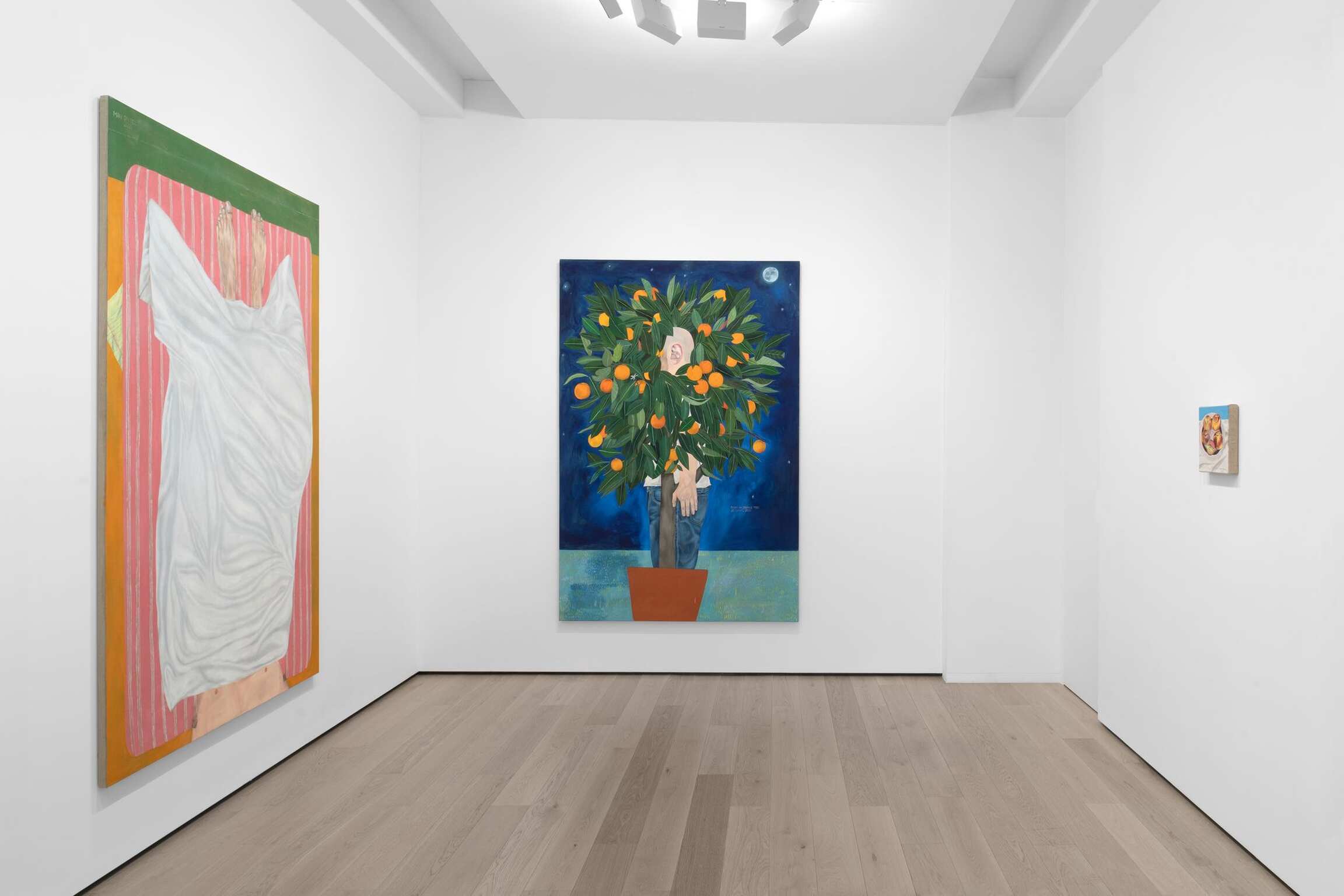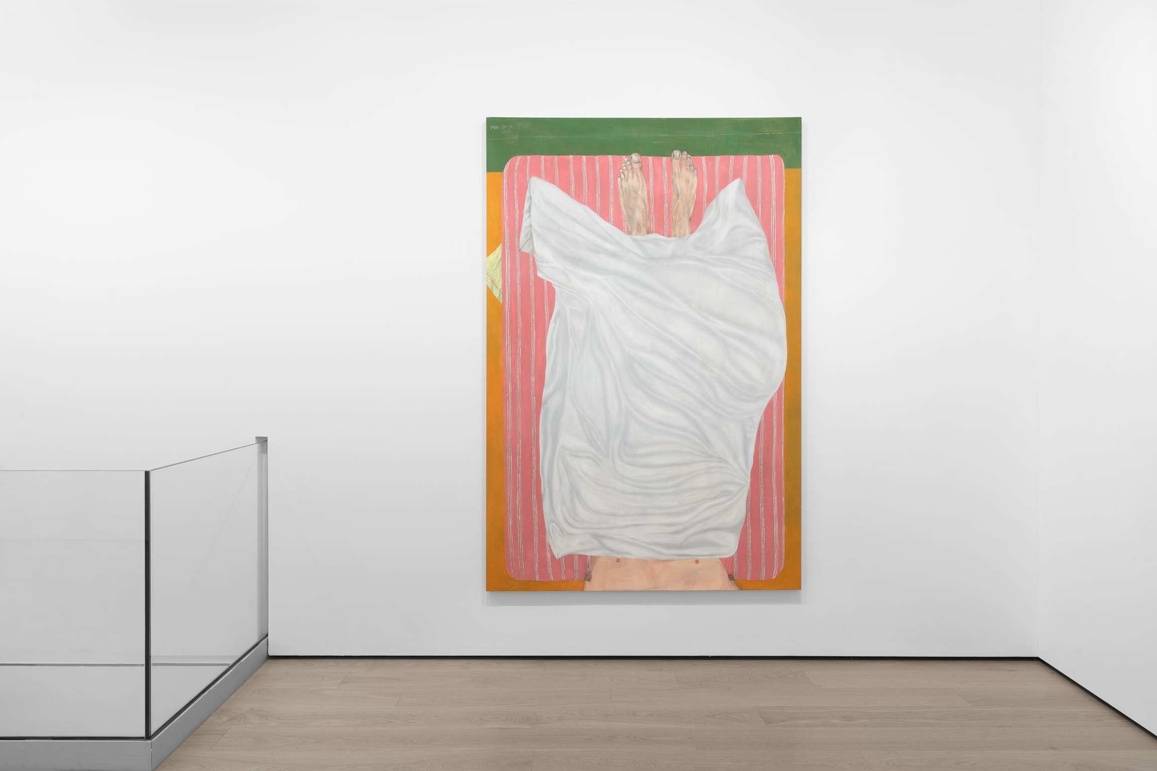 “Man On Bed” the work from which this exhibition takes its name, is deceptively flat in both form and title. Like an analyst’s couch, the titular lounger is a device for day-dreaming. Its pink upholstery is a ground upon which Hilsman has rendered – with unsettling detail – a man’s feet protruding from beneath a blanket. Light glints off each nail and the second toe on the left foot bends at the tip, revealing a broken phalanx. Bony and elongated with sallow skin, these alien appendages are a metonym of modern man’s estrangement from his own body, a corpus increasingly objectified and pathologized. They illustrate what Hilsman describes as his effort to “foreground the physical in order to highlight the unseen.” The blanket, meanwhile, occupies central ground in the painting, a white surface applied to a canvas that’s no longer blank, its many folds inviting the projection of our mind’s eye. Like the Shroud of Turin, it bears the impression of an otherwise invisible body, a talisman of art’s power to stimulate the imagination in the midst of alienation and spiritual emptiness.