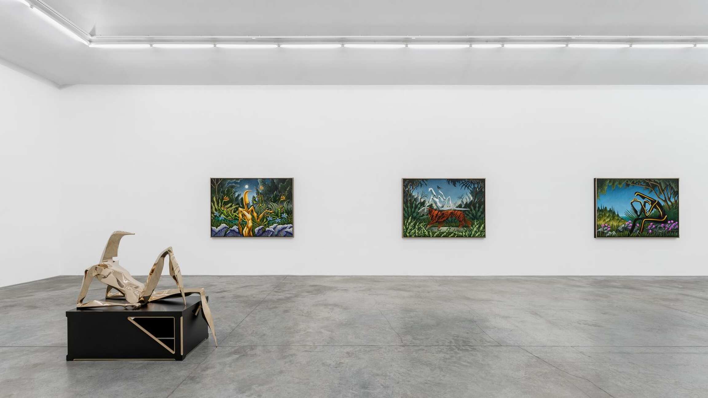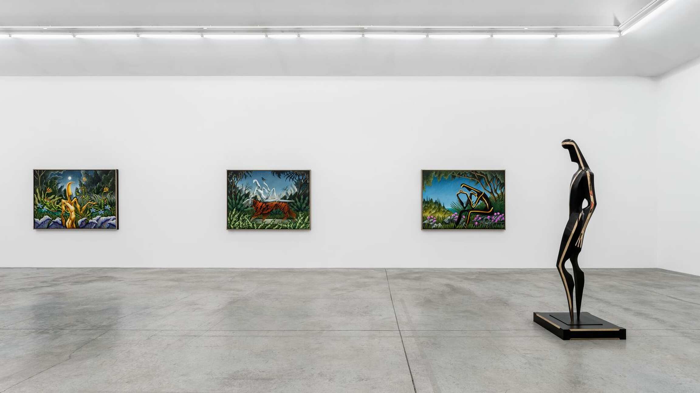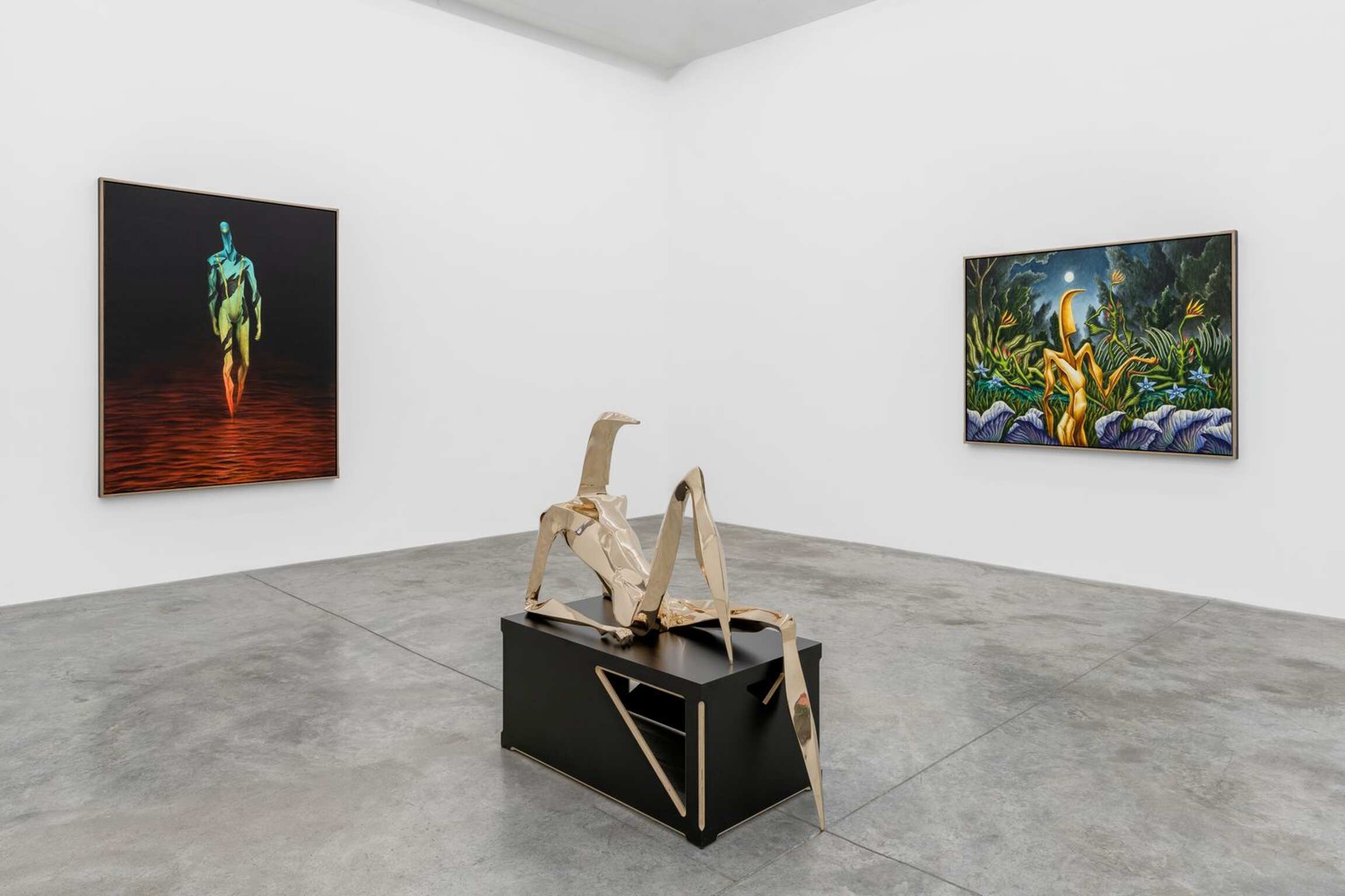 The main space’s starting point stems from the luxurious flora and fauna of Henri Rousseau’s paintings. Rousseau’s landscapes—and, as a result, Cardenas’—echo the descriptions that Homer makes of Ogygia, which is said to be made of cedars, junipers, poplars, cypresses, garden vines, violets, parsley, owls, falcons, and sea-crows (see V, 55–75). The gesture towards Rousseau is equally important in regard to the paintings’ scales. In the same way as Rousseau plays with the proportions that tie his figures to their surroundings, Cardenas makes his figures larger than nature to render the extraordinary status and abilities that Homer conferred to them. Such a scalar move entails a more painterly brushwork, compared to some of Cardenas’ earlier works.