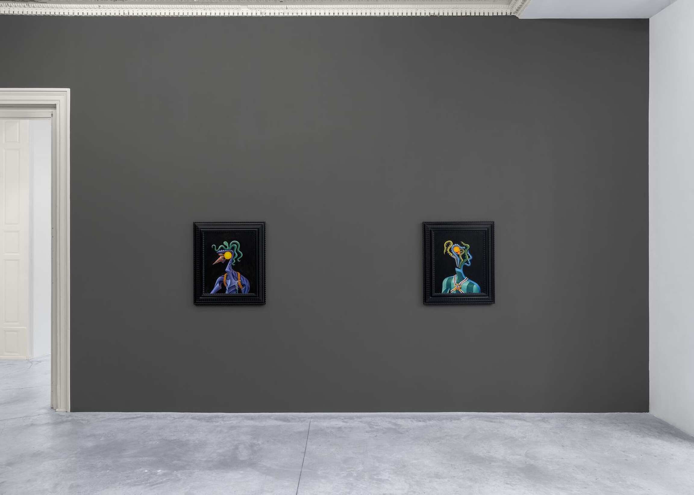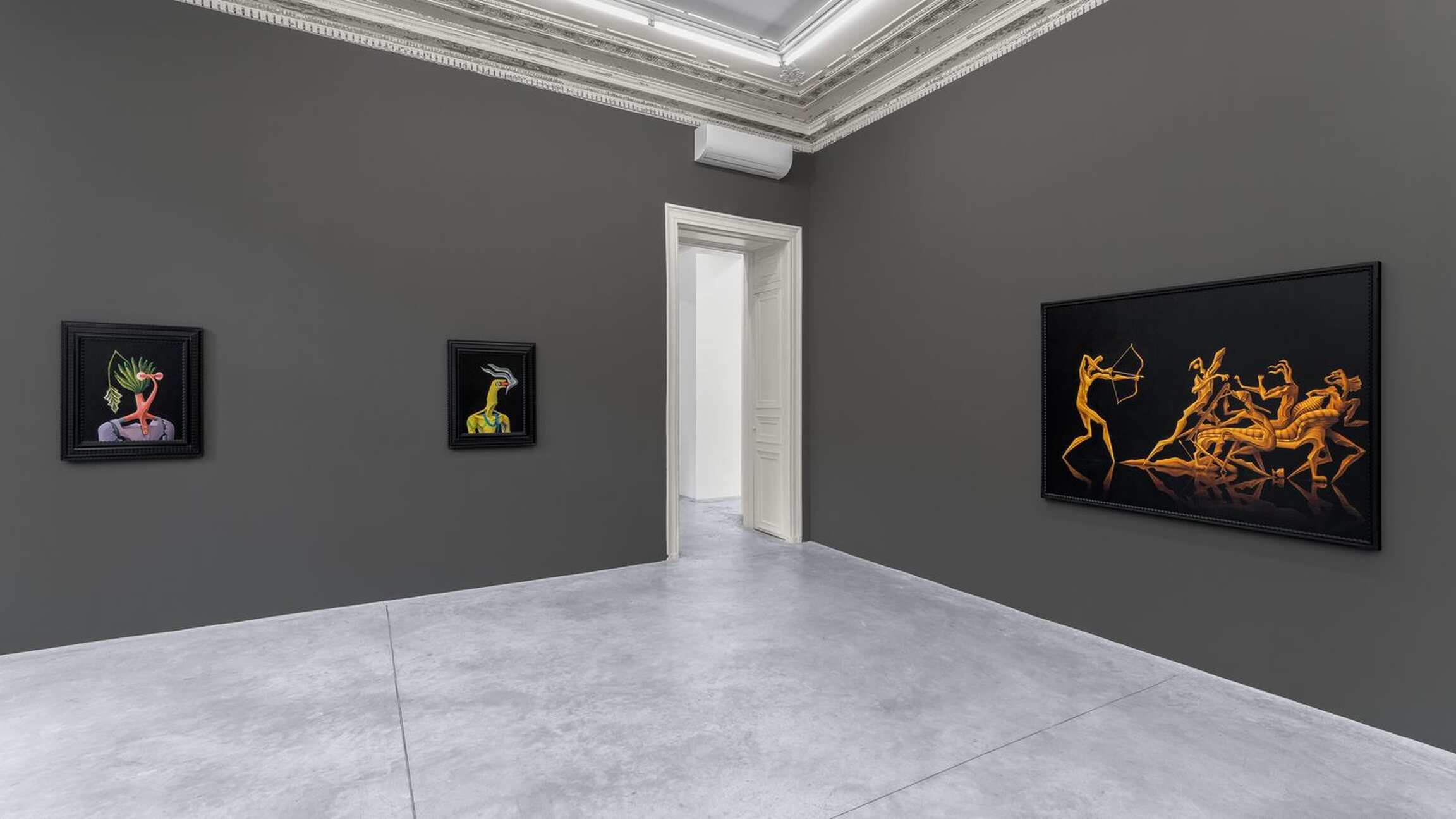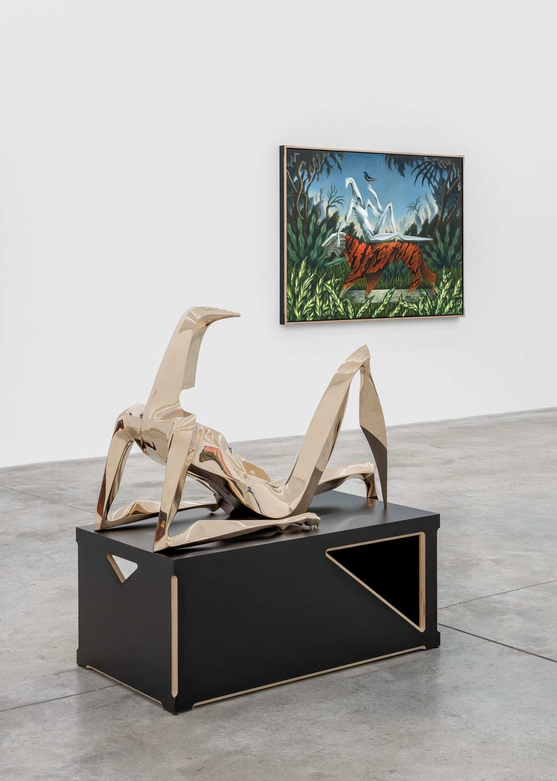 The main space’s starting point stems from the luxurious flora and fauna of Henri Rousseau’s paintings. Rousseau’s landscapes—and, as a result, Cardenas’—echo the descriptions that Homer makes of Ogygia, which is said to be made of cedars, junipers, poplars, cypresses, garden vines, violets, parsley, owls, falcons, and sea-crows (see V, 55–75). The gesture towards Rousseau is equally important in regard to the paintings’ scales. In the same way as Rousseau plays with the proportions that tie his figures to their surroundings, Cardenas makes his figures larger than nature to render the extraordinary status and abilities that Homer conferred to them. Such a scalar move entails a more painterly brushwork, compared to some of Cardenas’ earlier works.