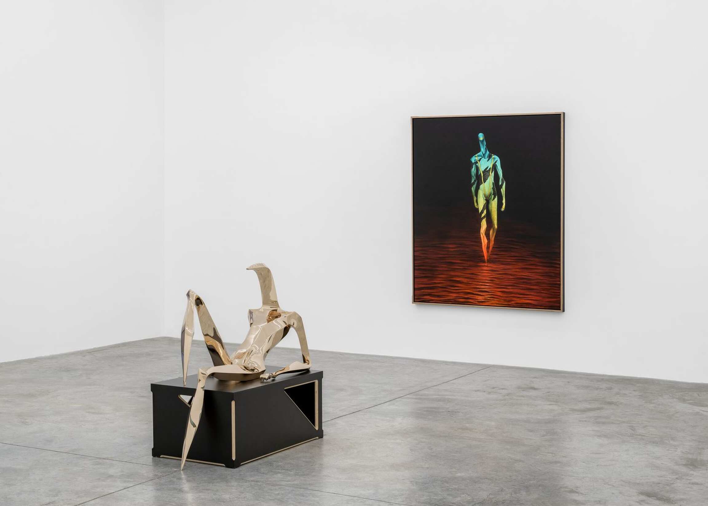 In continuity with the paintings, the main space brings into play Cardenas’ first human scale sculptures. The two sculptures, Calypso and Odysseus, both measure six feet and propel Cardenas closer to his conception of exhibitions as works of art in their own right, rather than a set of individual works. Like the paintings’ figures, the sculptures’ heads recall the numerous shapes of Ancient Greek helmets. Calypso inscribes itself in the continuity of a reclining Venus, while Odysseus draws on the Kritios Boy.
