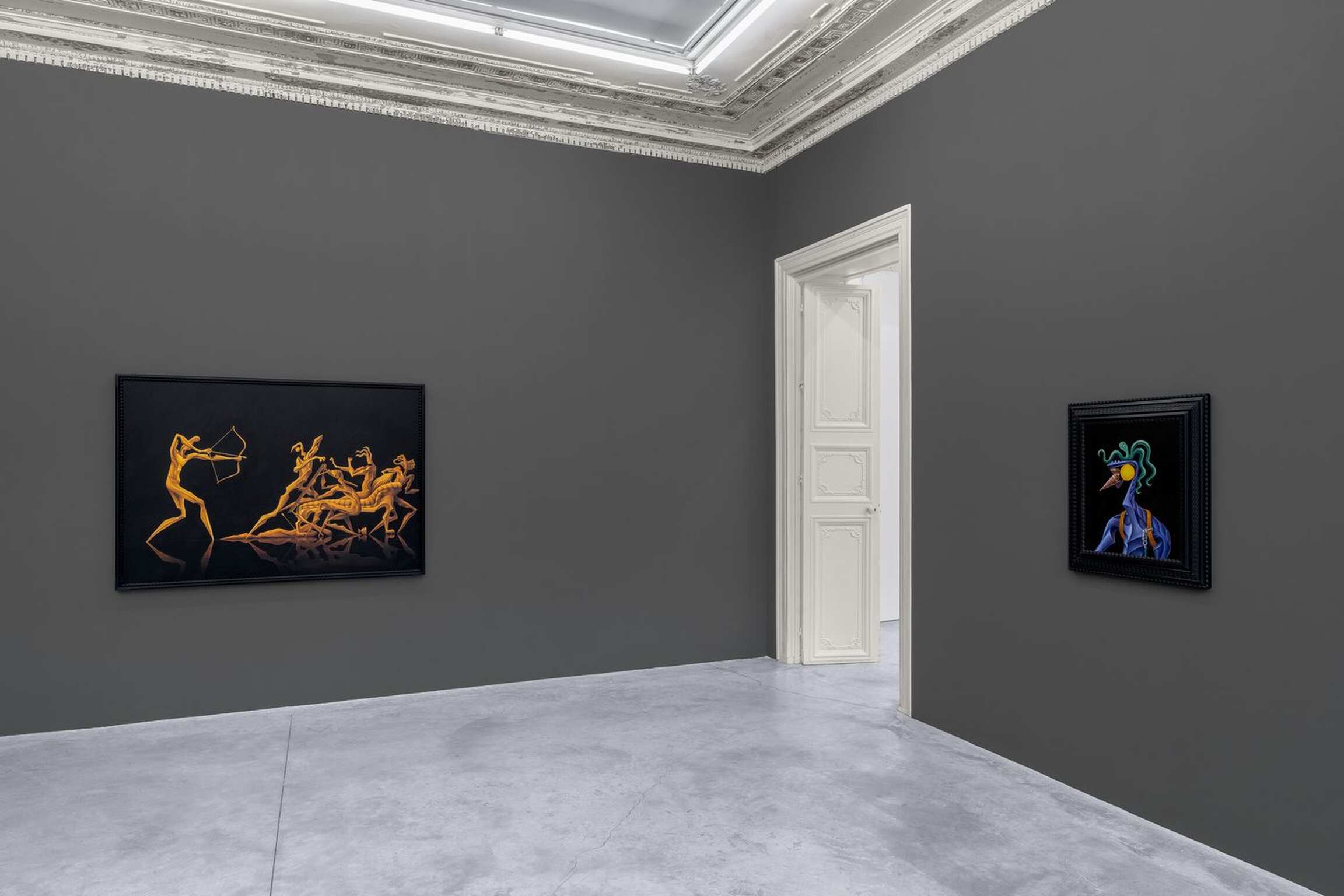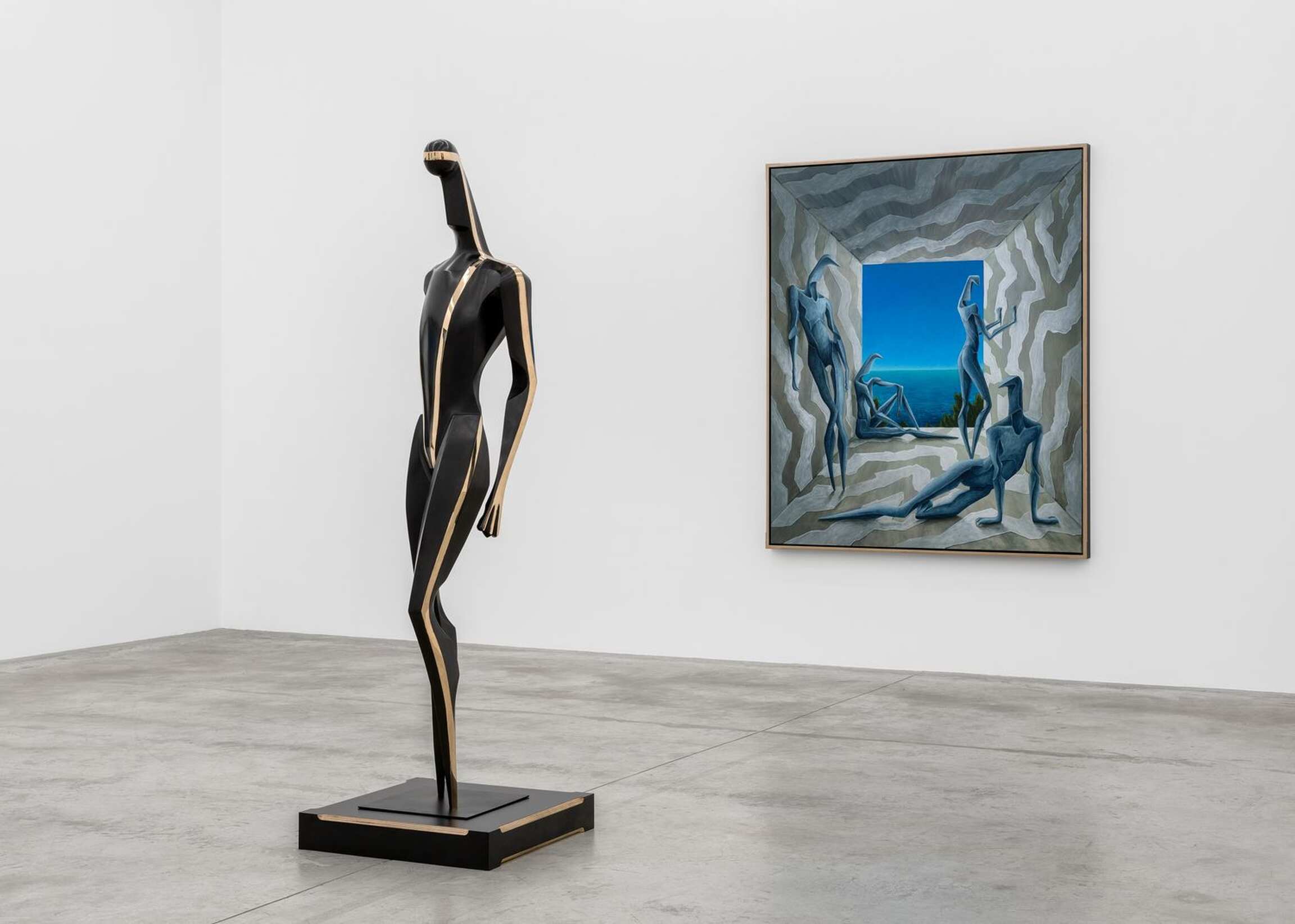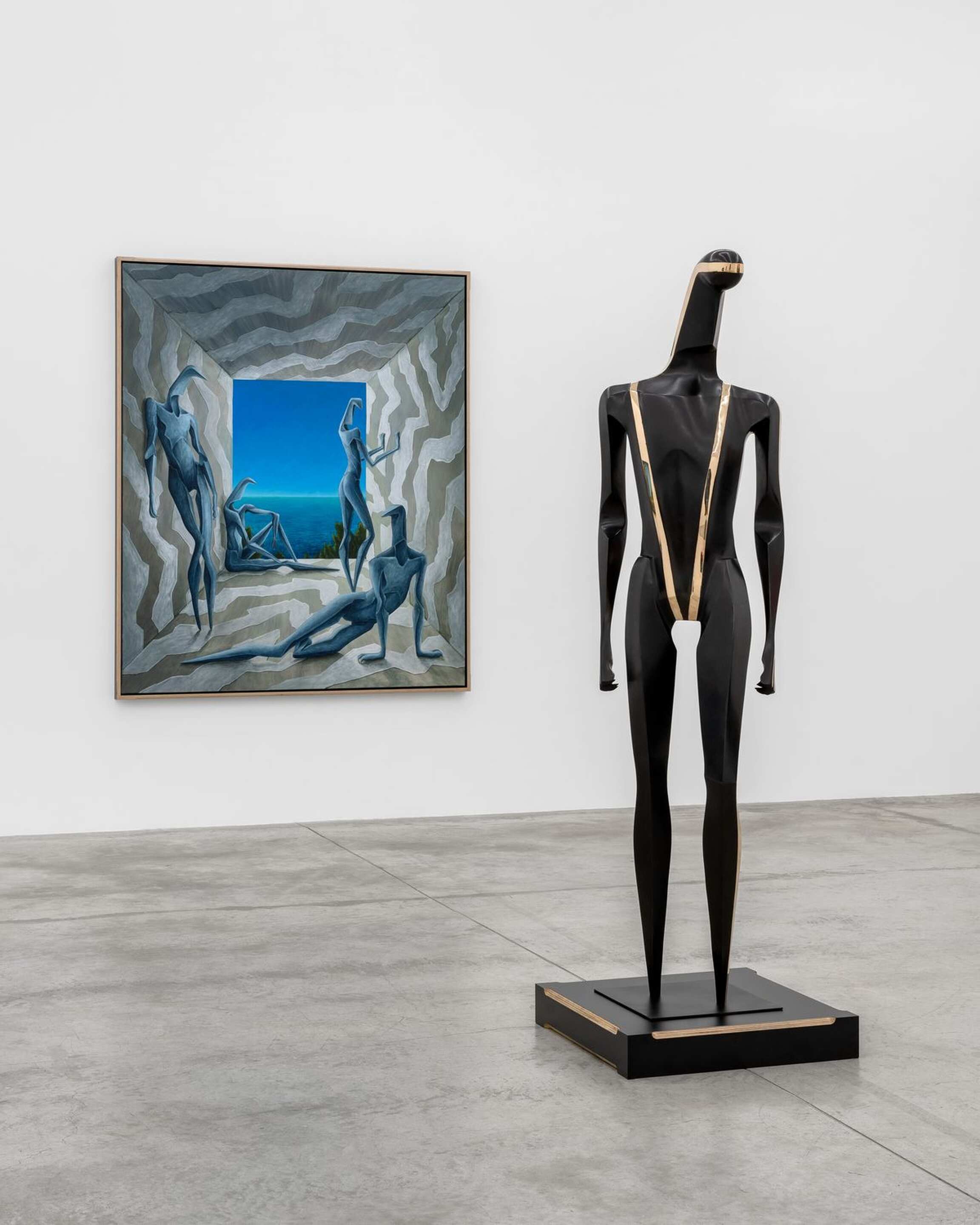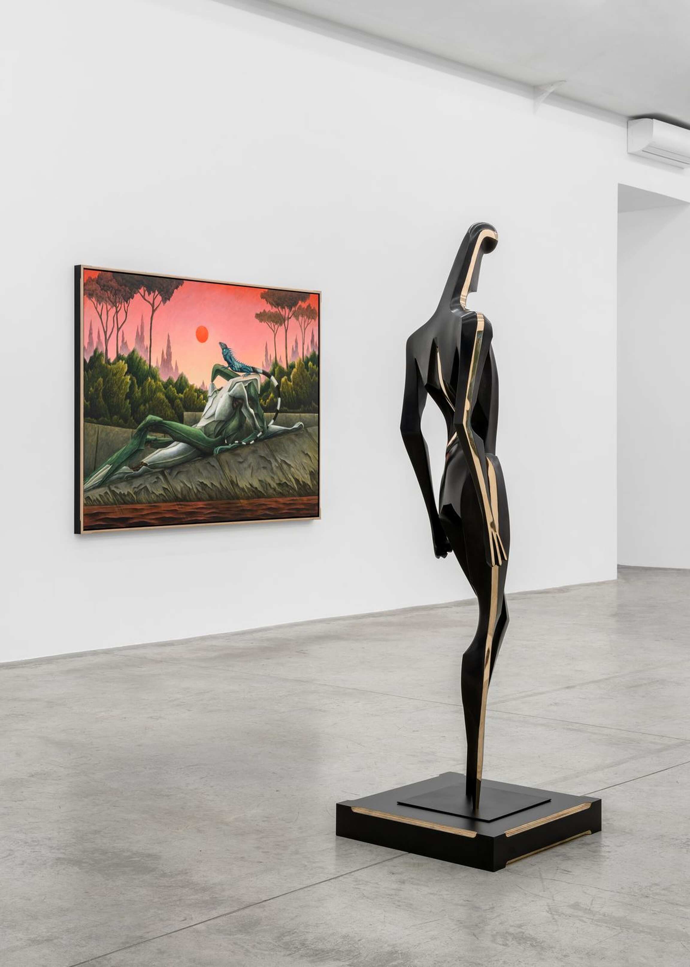 ‘CALYPSO’ is the title that Alejandro Cardenas gives to his third solo exhibition with Almine Rech, and second one in Paris, following ‘PARADOXA.’ This time, Cardenas responds with paintings and sculptures to Homer’s Odyssey, and more specifically to the years Odysseus spent with the nymph Calypso in Ogygia. Before turning to the reach of Cardenas’ interpretation of that part of the poem, it should be noted that he has divided the exhibition into three parts. The main space focuses on Odysseus’s years in Ogygia. One room attached to it deals with the suitors of Penelope, while another offers meditations on the questions that the exhibition raises. Cardenas’ latest body of works constitutes a rather unusual moment in contemporary painting and sculpture insofar as it presents the reflections of an artist who quite literally engaged with a classical textual source, in an age where the tendency bends towards oblique presentations of traces of ideas, as Jean-Luc Nancy has shown in Les Muses. One can find in the very verses of Homer’s Odyssey the matrix of the paintings and sculptures from ‘CALYPSO.’ The works are nonetheless not mere visual ekphrases confined to the Odyssey. Cardenas weaves together webs of meaning across time. He intertwines Homer’s poem with Ancient Greek sculptures, as well as references from different periods and regions, whose significations thereby find themselves deepened or altered.