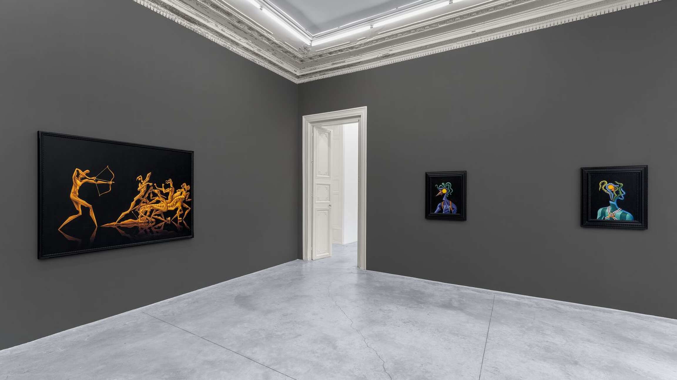 As noted above, two rooms complement the main space. The room with the suitors of Penelope, and the one forming meditations on the exhibition’s questions. The Dream of Ithaca is the title of the painting featured in the latter. Mystery and indeterminacy are two terms which characterize it. Are the two figures Odysseus and Penelope reunited? A faint memory of the years Odysseus and Calypso spent together? Penelope and Calypso? Odysseus and his alter ego? Is the blue stripe the water that divides the ecumene from Ogygia? Cardenas’ painting remains unresolved. The blue stripe, which occurs in Hermes Delivers the Order of Zeus, might be reminiscent of Barnett Newman’s zips. If we wanted to anchor our comparison in chromatic criteria, we would mention, say, Shimmer Bright, 1968, from the Metropolitan Museum of Art. But it is Newman’s words on the Museum of Modern Art’s Vir Heroicus Sublimis, 1950–1951, which seem to fit Cardenas’ painting best: ‘It’s no different, really, from meeting another person. One has a reaction to the person physically. Also, there’s a metaphysical thing, and if a meeting of people is meaningful, it affects both their lives.’ In Newman’s painting, it is the zips that fulfil the role of drawing people to the painting. It feels as though the two figures in The Dream of Ithaca were first and foremost two persons that the blue stripe draws into the painting’s space.