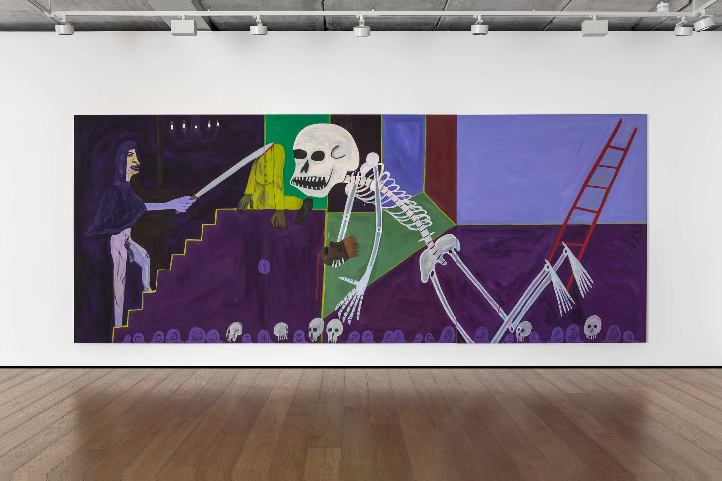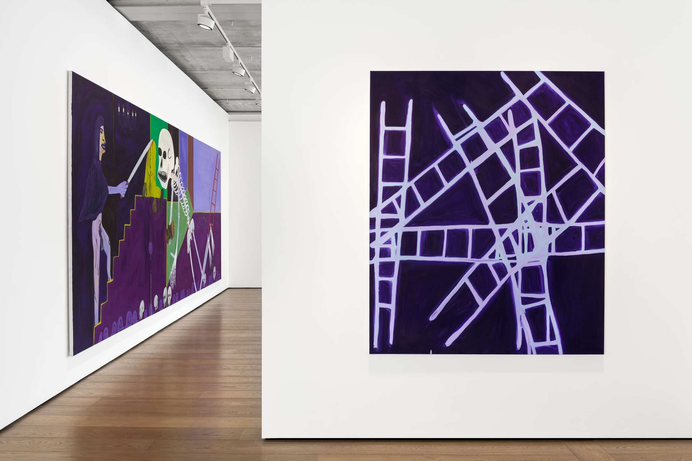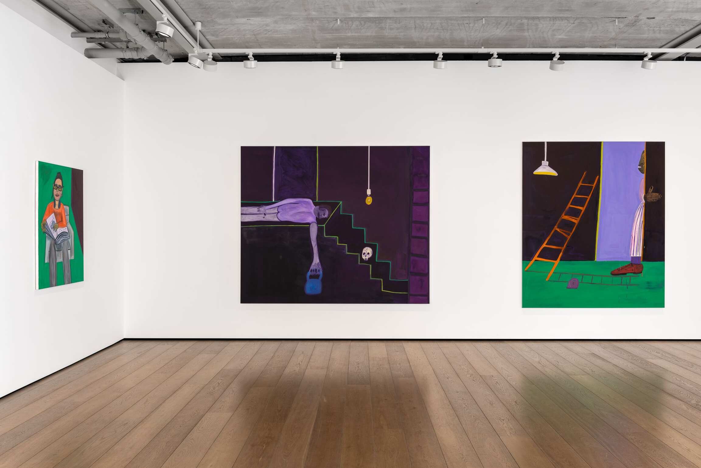 He’s painted a lot of ladders and staircases this time, both being, historically, a bridge between heaven and earth, or between life and death, or between consciousness and a half-remembered dream. If this feels reductive, if Jahmal’s pictures recall the insistent drawings of children, maybe it’s because Jahmal understands it’s useful to see the world the way a child does: for the first time, uncolored by strife. This world is allowed to be purple-hued in its splendor. Only its most essential parts matter.