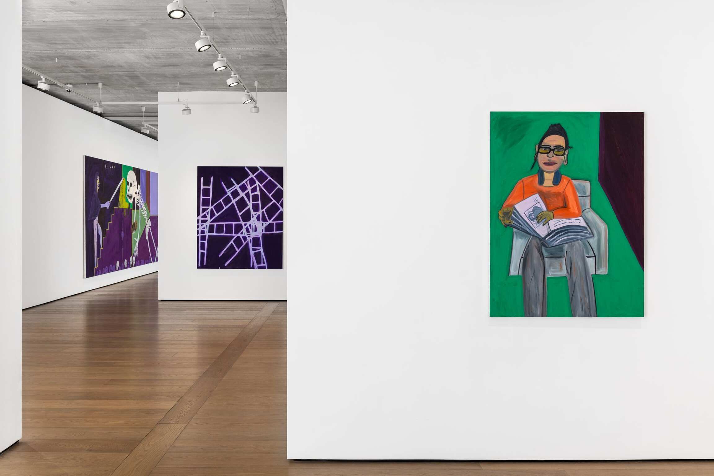 In Marcus Jahmal’s new paintings, purple hurtles along the continuum of human history. The figures that populate his washy fields wear little clothing or nothing at all, a self-abnegating refusal of millenia of class structure. They have become purple itself, their skin pulsating violet, as if emanating light. Jahmal’s color sense is finely tuned, taking something of the rabid passion of the Fauvists and the emotional immediacy of the Neo-Expressionists (there are other overlaps, too: a rejection of three-dimensional space, for example). On the chromatic spectrum, purple exists somewhere between the tempestuous fury of red and the calm cool of blue. It takes both humors and makes its own. Purple vibrates at the uppermost length of the visible spectrum. Travel any further and you’ve left the physical realm. You can do that in a Marcus Jahmal picture, too.