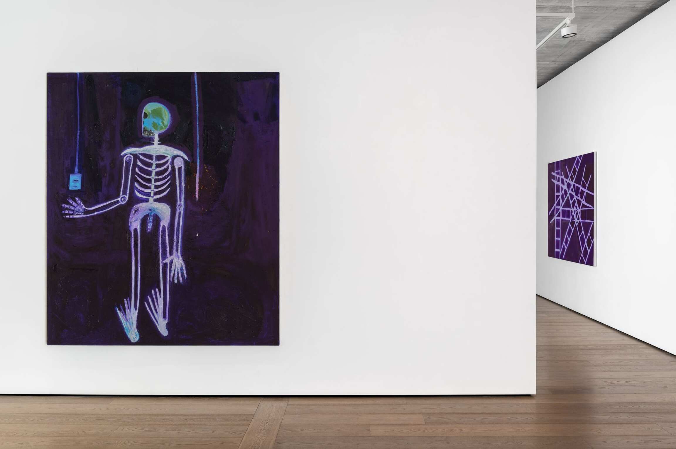 Elsewhere, visions of the cosmos come into view. Constellations share space with orbiting skull-shaped planets, their colors searing on top of a thickly applied field of purple infinity. The same view folds in on itself, seen through the window of a room, its walls bathed in purple light. Jahmal says that when he looks up at the night sky it reads more purple than dark blue or black: “Somewhere between the two purple spaces, perhaps there is a crossover.”