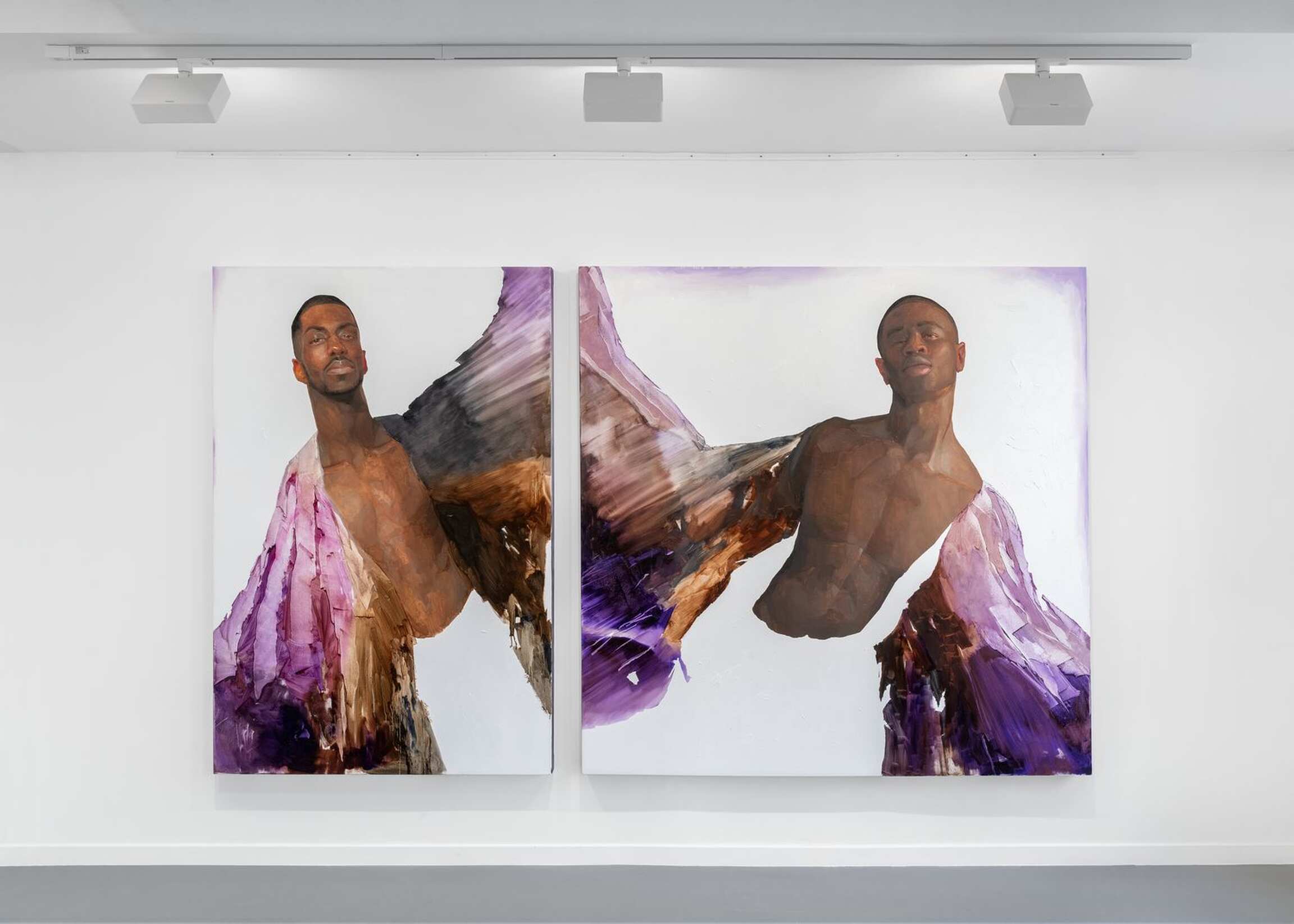 Among the centerpieces of the show is a diptych which emphasizes the connection between shape and color, and which features two winged male figures who are related but separated experientially—perhaps by age. They could be father and son, the artist explains, or two brothers with a significant age gap not unlike the one Daniels and his own brother share (Daniels’s brother Zerrick is 17 years his junior). The color purple is applied to the wings depicted on the artist’s canvas—serves to deliver a spiritual sensation, bringing to light the power of the relationships that bind us. The beauty of the connection between these two Black men is palpable.