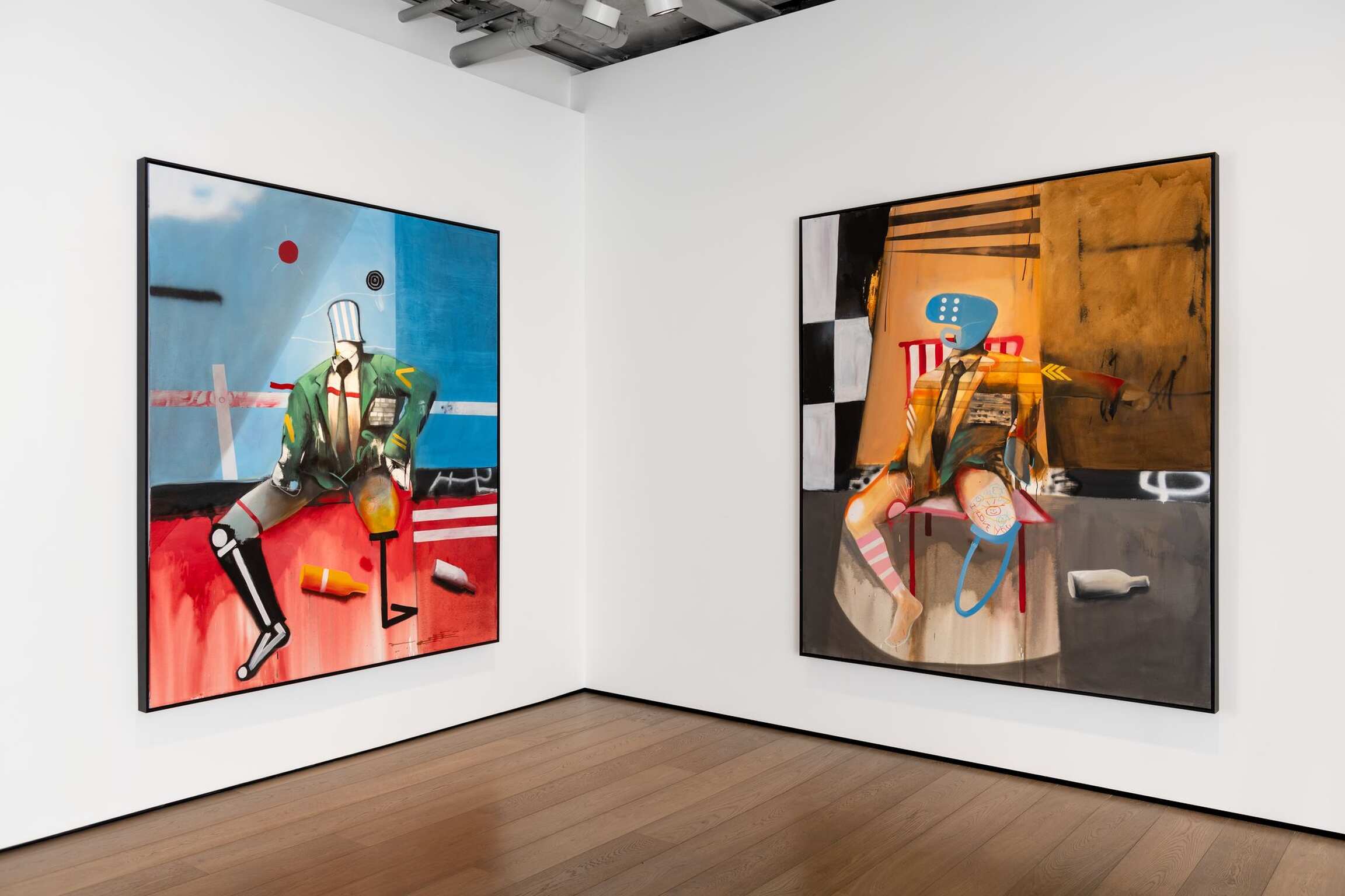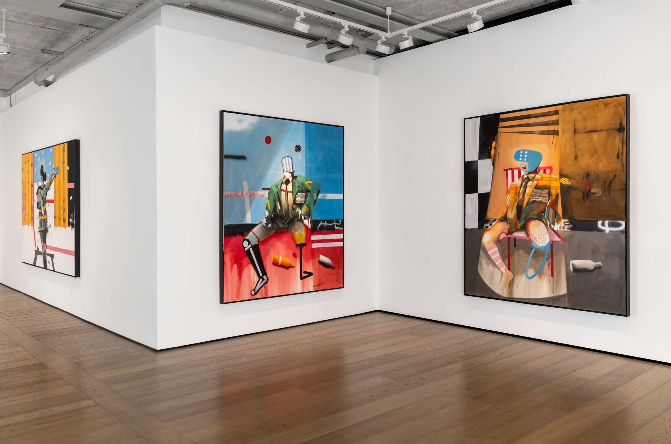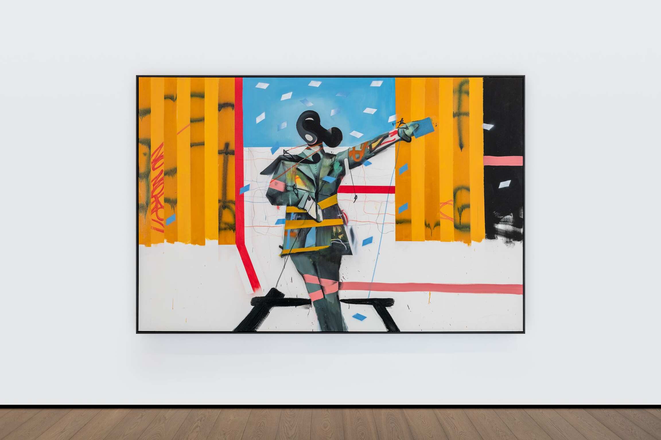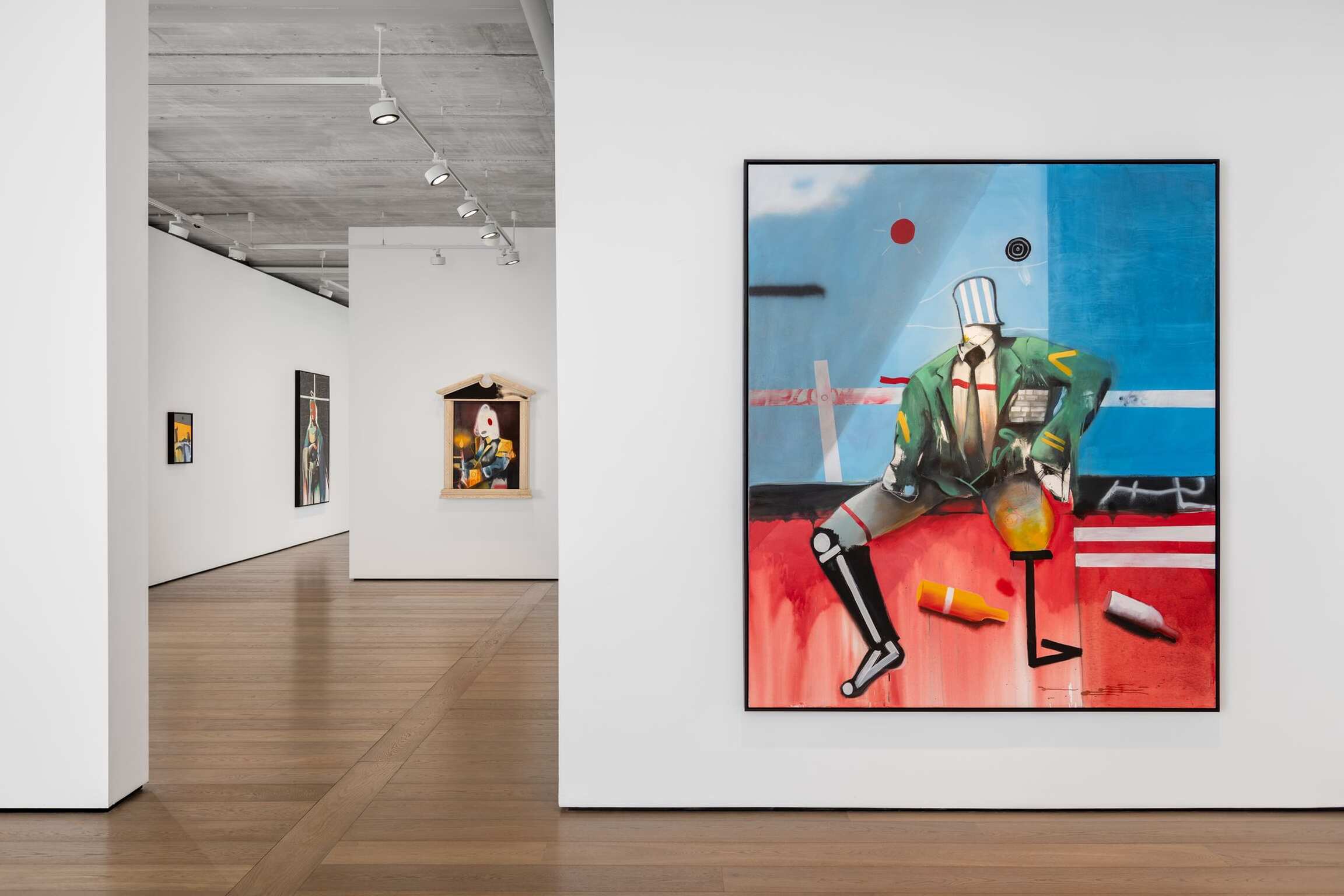 Here, the damaged, the desolate, and the overlooked are given centre stage. In A Confident Wounded Warrior (all works 2021), a pale spotlight illuminates a headless, one-legged figure in a decorated military uniform. He looks cockily out at us – although he has no eyes. Two empty bottles are scattered on the floor, and – as if to reiterate that even the bravest person is made of flesh and bones – his remaining leg is rendered like an x-ray. The colours are bold, bright, and bluntly descriptive: a blue background that could be a wall or a sky; the earth stained red with pigment or blood; a graffitied white picket fence, the embodiment of the American Dream turned sour. Everything is flattened – apart from the delicate rendering of the damage that has been done to this poor monster, who was once a human being.