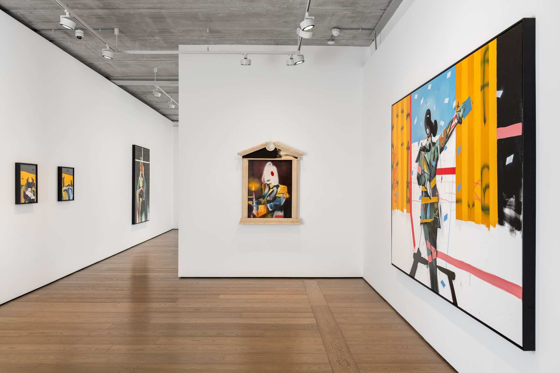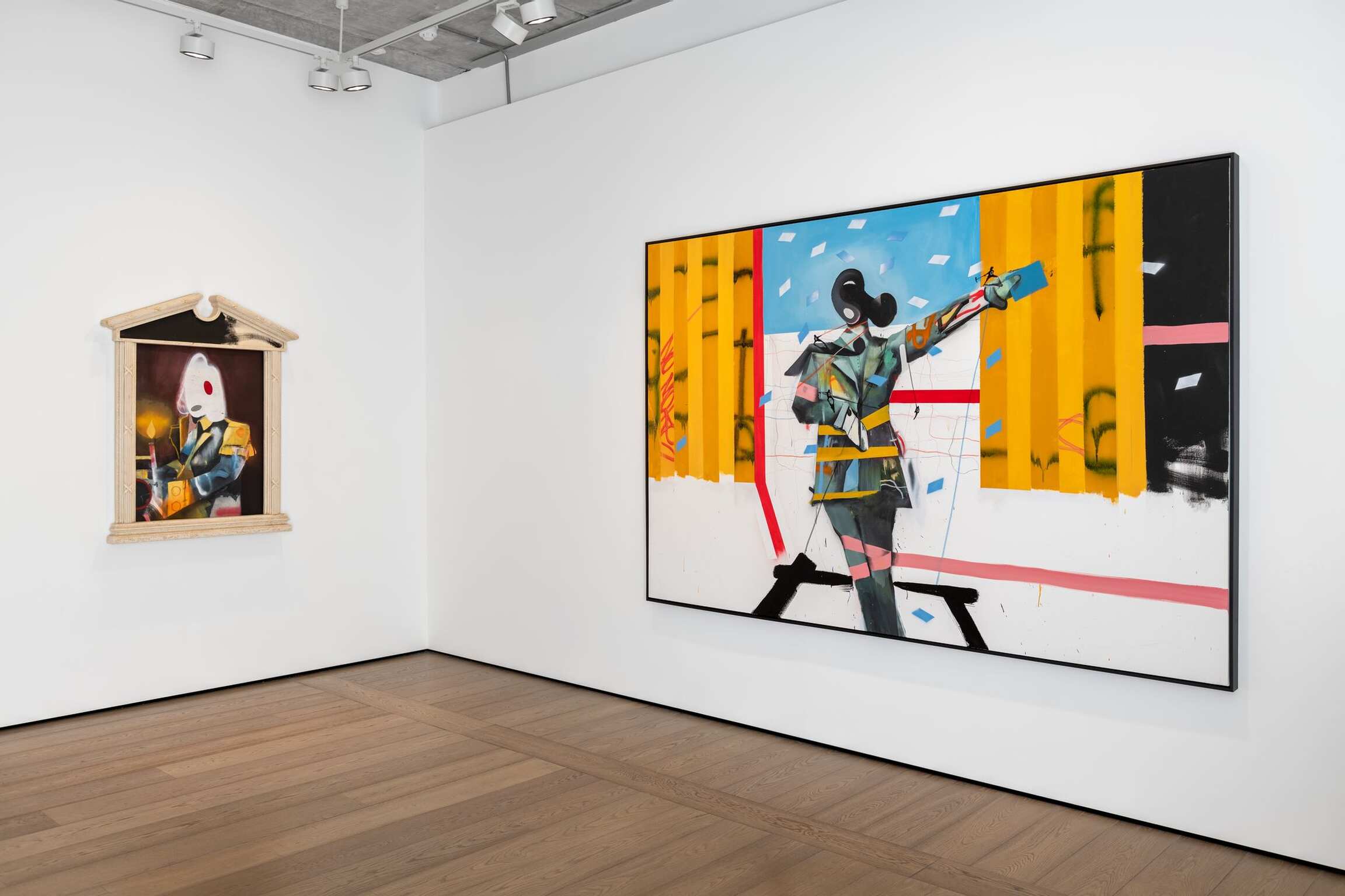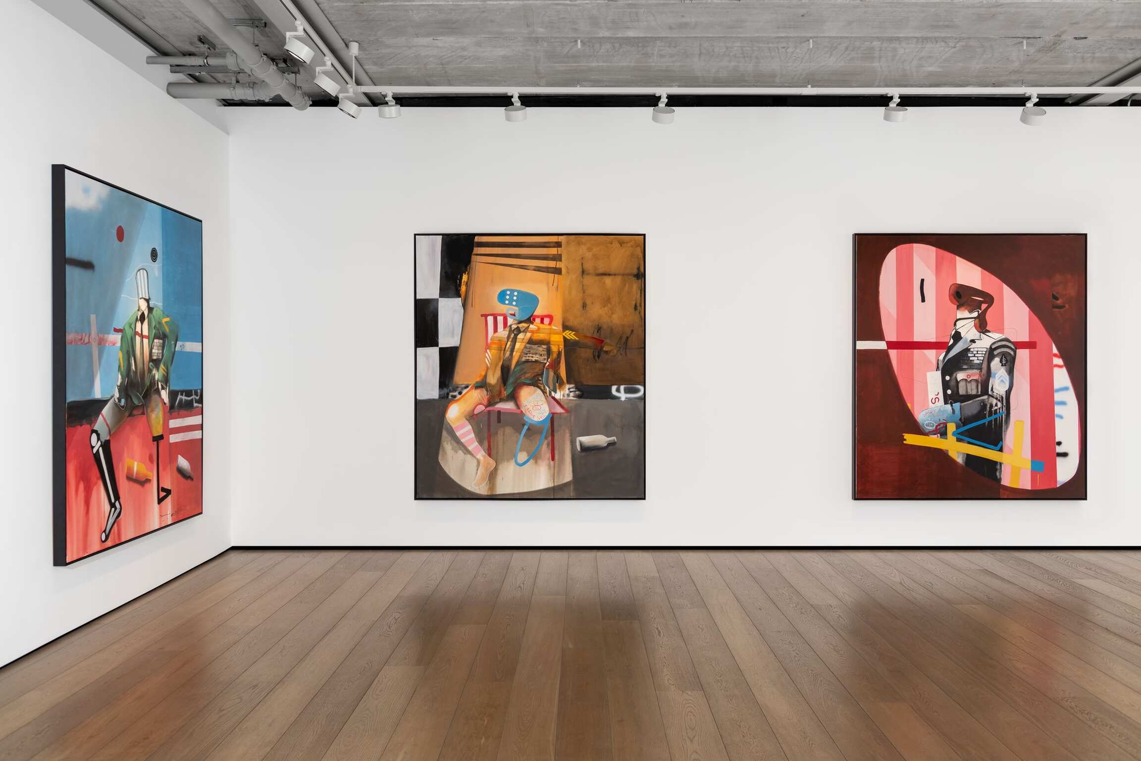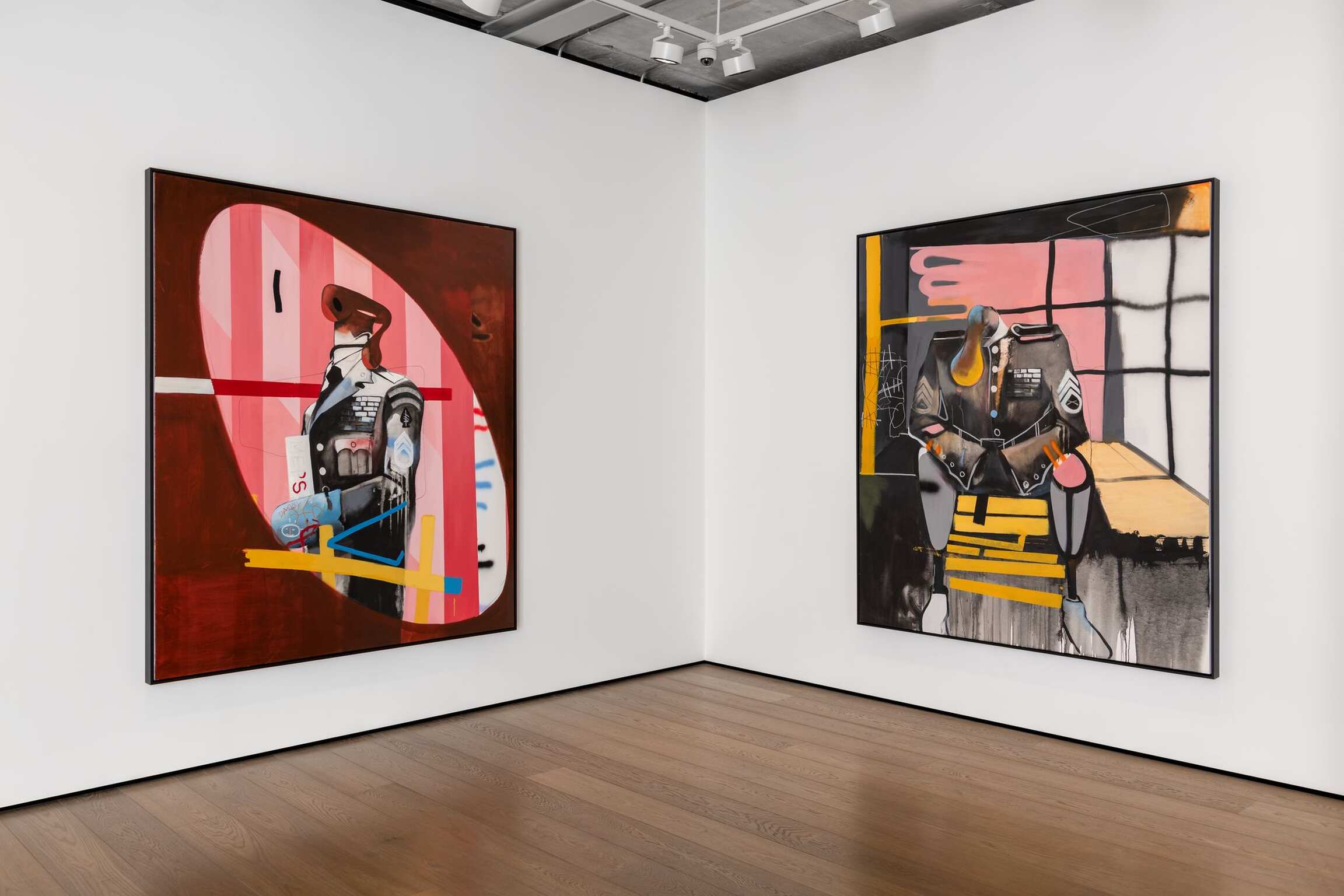 Here, the damaged, the desolate, and the overlooked are given centre stage. In A Confident Wounded Warrior (all works 2021), a pale spotlight illuminates a headless, one-legged figure in a decorated military uniform. He looks cockily out at us – although he has no eyes. Two empty bottles are scattered on the floor, and – as if to reiterate that even the bravest person is made of flesh and bones – his remaining leg is rendered like an x-ray. The colours are bold, bright, and bluntly descriptive: a blue background that could be a wall or a sky; the earth stained red with pigment or blood; a graffitied white picket fence, the embodiment of the American Dream turned sour. Everything is flattened – apart from the delicate rendering of the damage that has been done to this poor monster, who was once a human being.