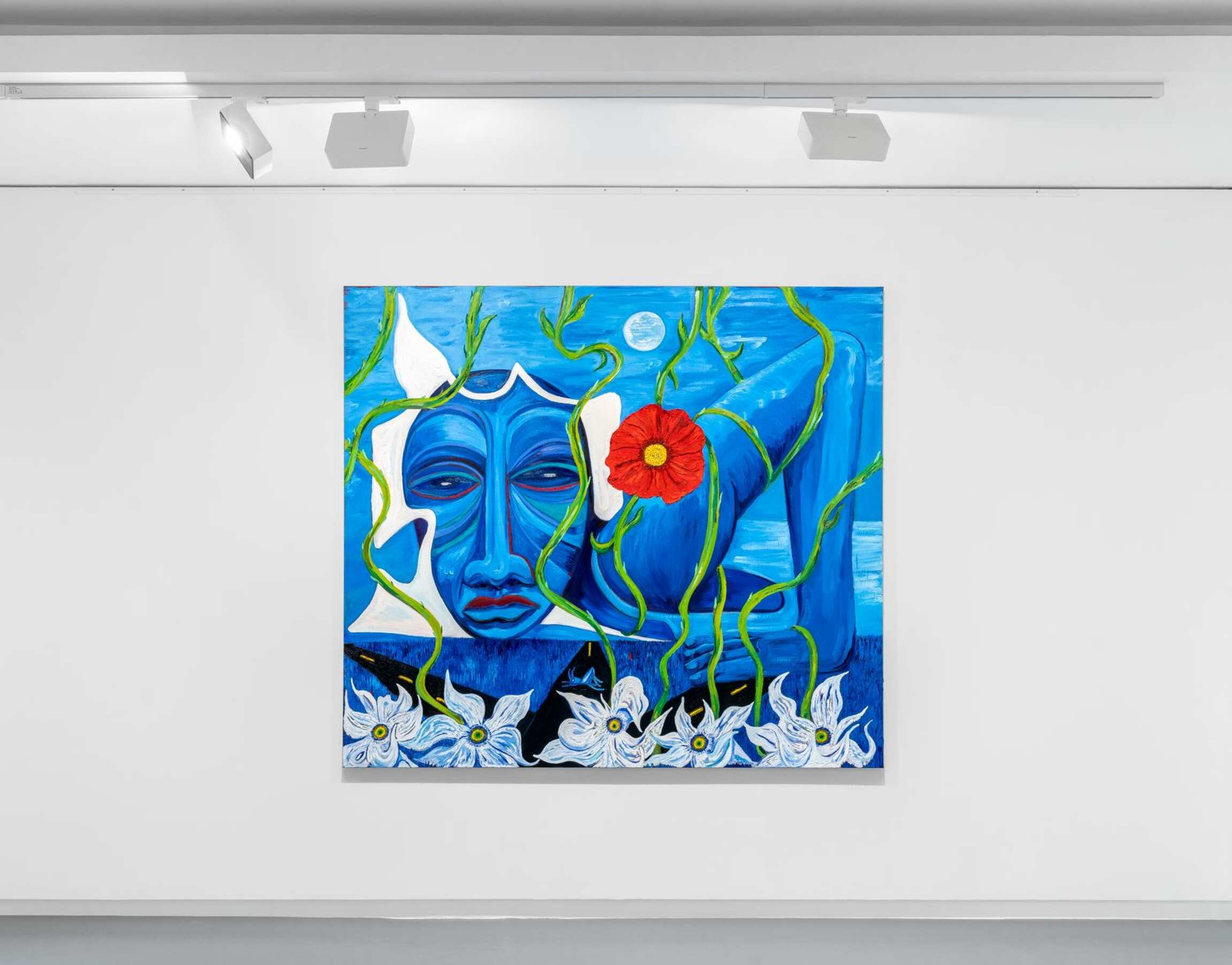Peinture à dominante bleue, Turning Into A Cricket With Red Flower présente une figure humanoïde plus grande que nature ; allongée sur le ventre, paume à plat et coude dressé vers le ciel, elle imite le corps anguleux d’un criquet. Son visage en forme de masque, fait de lignes, de couleurs et de plis, nous fixe ; son regard brise le quatrième mur. Posture qui interrompt le repos du personnage, qui semble se redresser et avancer, brisant ainsi l’immobilité mélancolique souvent associée à la figuration quand elle fait appel à des teintes bleutées. Les criquets occupent une place particulière pour Gibson, réfugié dans son atelier dès le début de l’immobilité collective provoquée par la pandémie et dans les mois qui ont suivi. Les stridulations d’un couple de criquets emplissaient alors son atelier avec une régularité de métronome, lui apportant compagnie et ancrage – pas d’autre choix alors que de cohabiter.