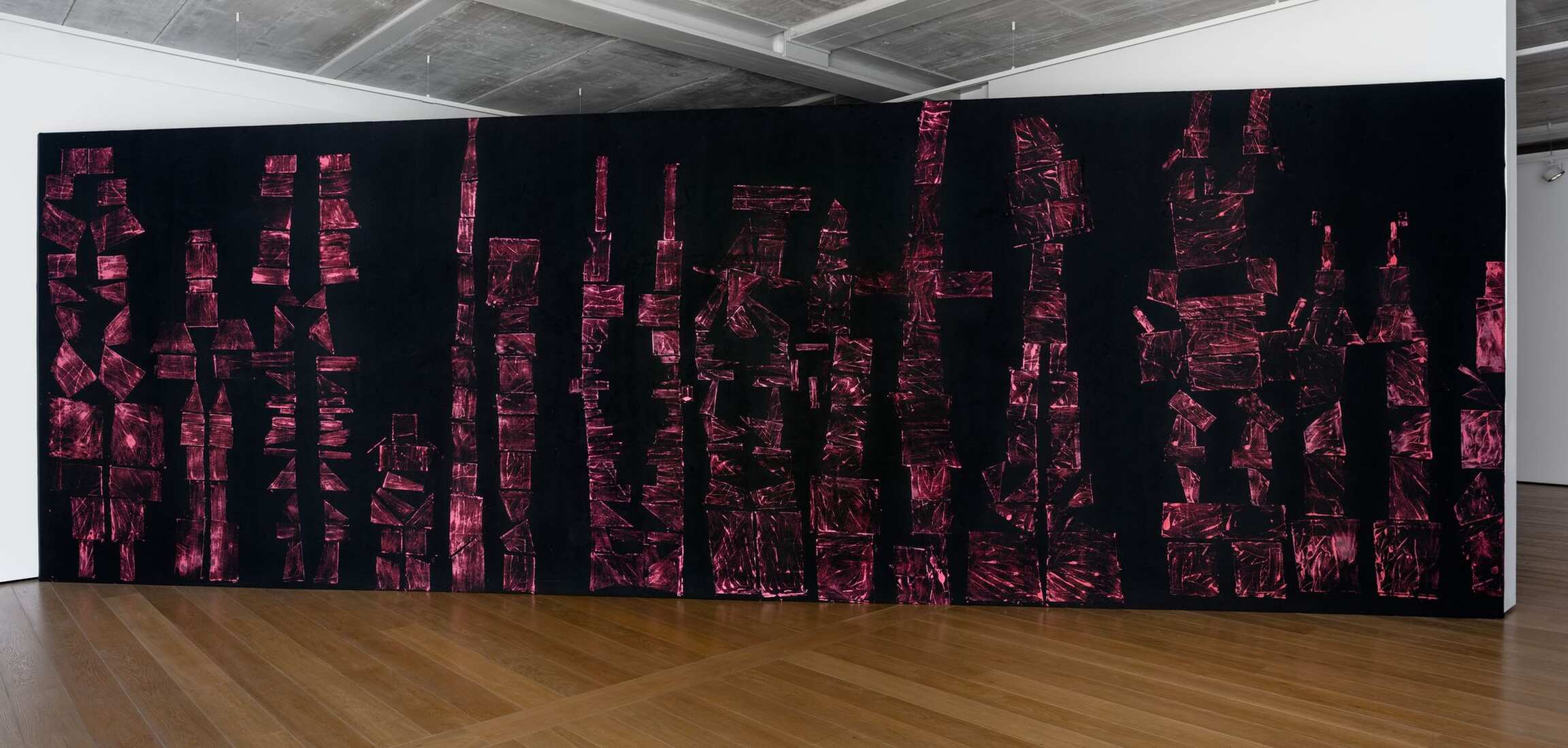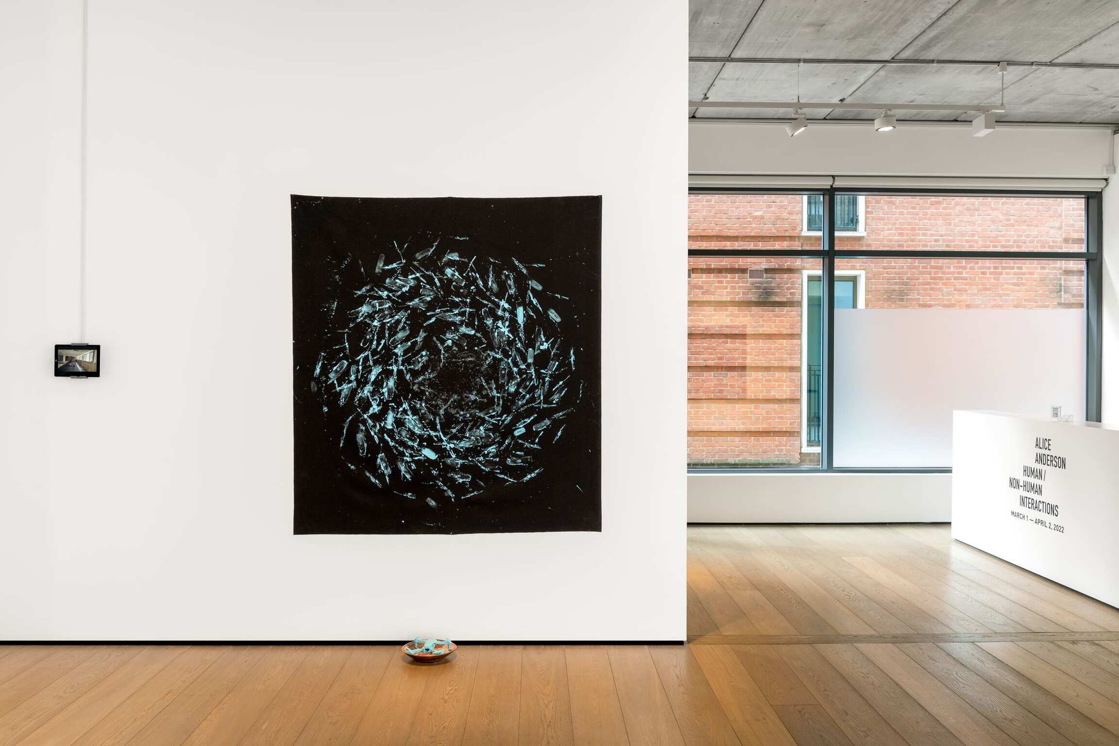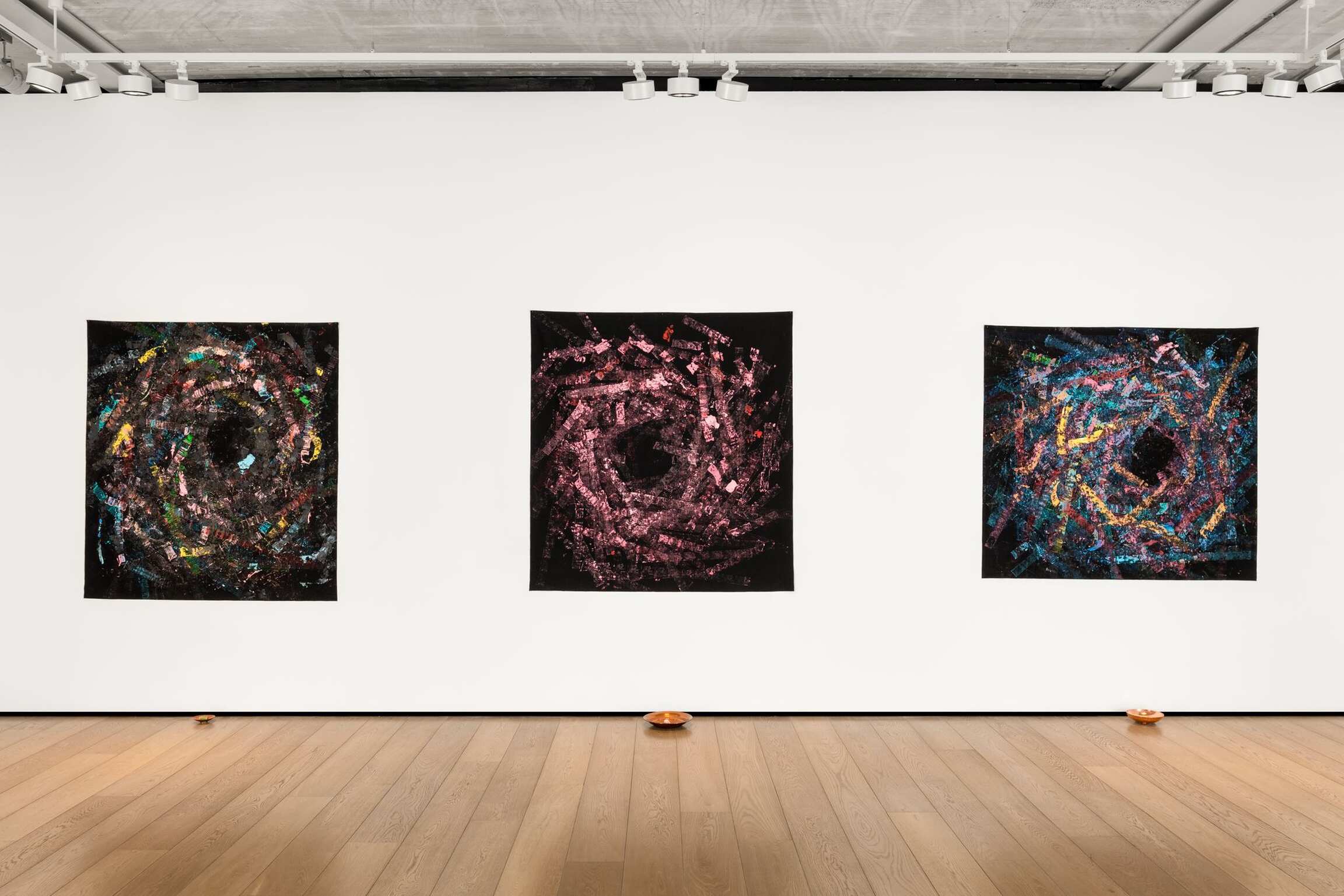 The coloured motifs that appear on black paper or felt suggest constellations, circles, and vortices.These repetitive rhythms of triangular or cubic geometrical shapes sometimes resemble contemporary totem poles in their vertical layering. Alice Anderson soaks the object in paint and then, using her movements and breath, she comes in contact with the canvas. She repeats the process with another colour. This ballet between the body, the object, and the floor—used as a dance mat—is extremely precise and complex. The artist says she is not concerned with the visual results or the aesthetic appearance of the works. What counts for her is the physical relationship with her environment: the pattern results from the energy of a body in motion. The material status of these “paintings” is ambiguous. Although they evoke gestural abstract paintings or even drip paintings, they are actually traces of performances whose motifs are random, while still very strong and visually coherent.