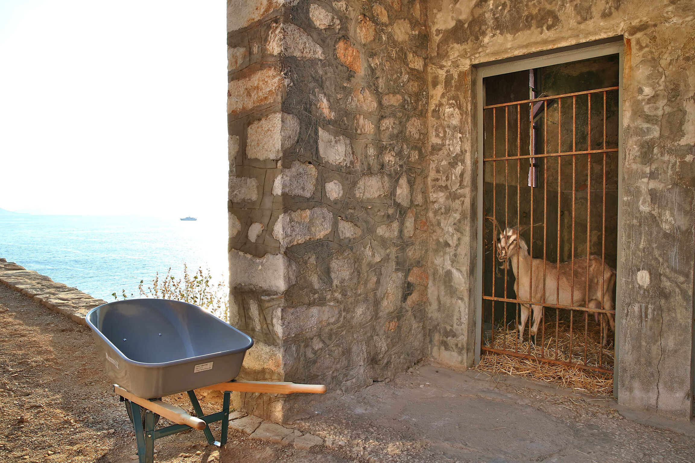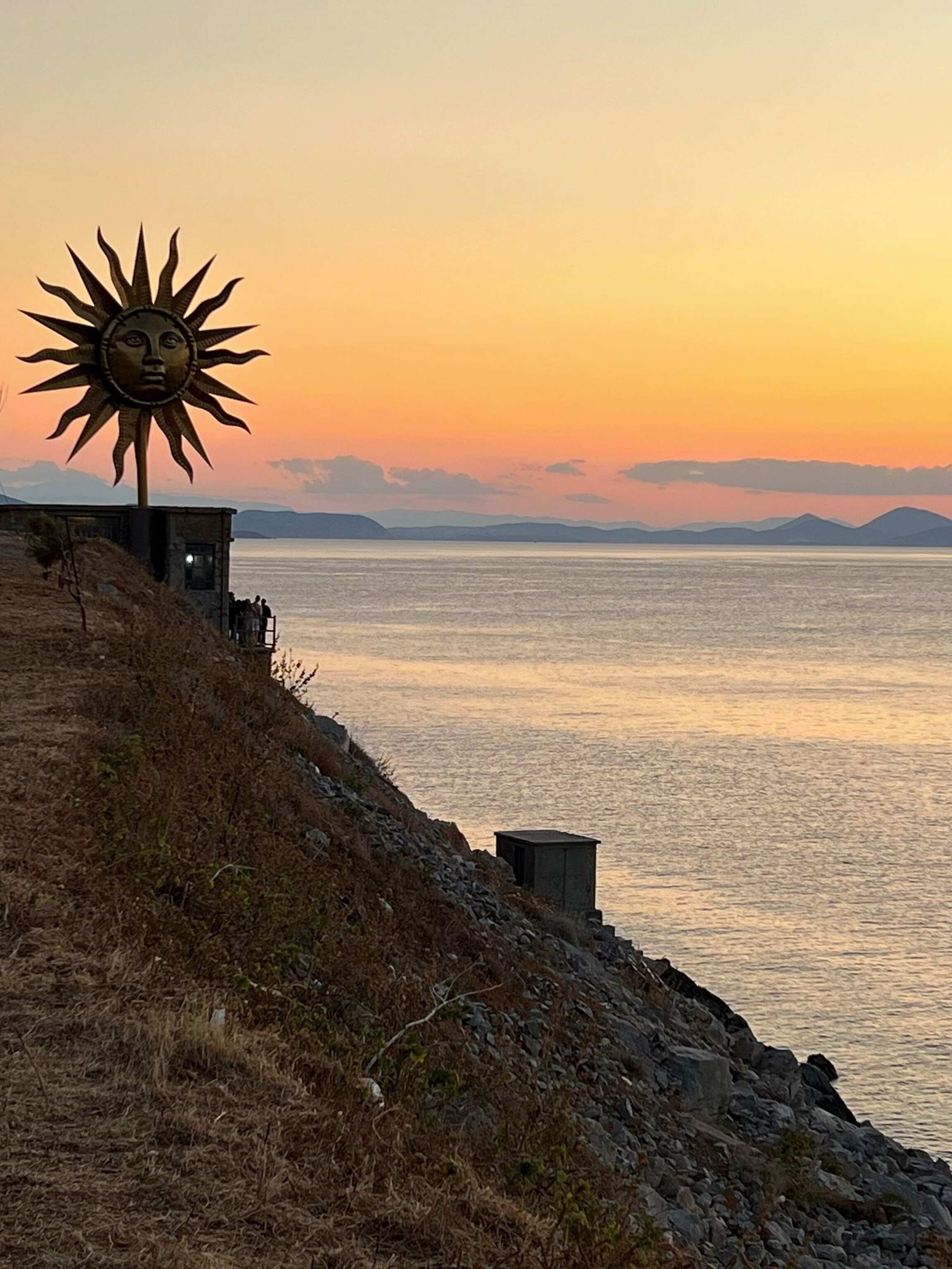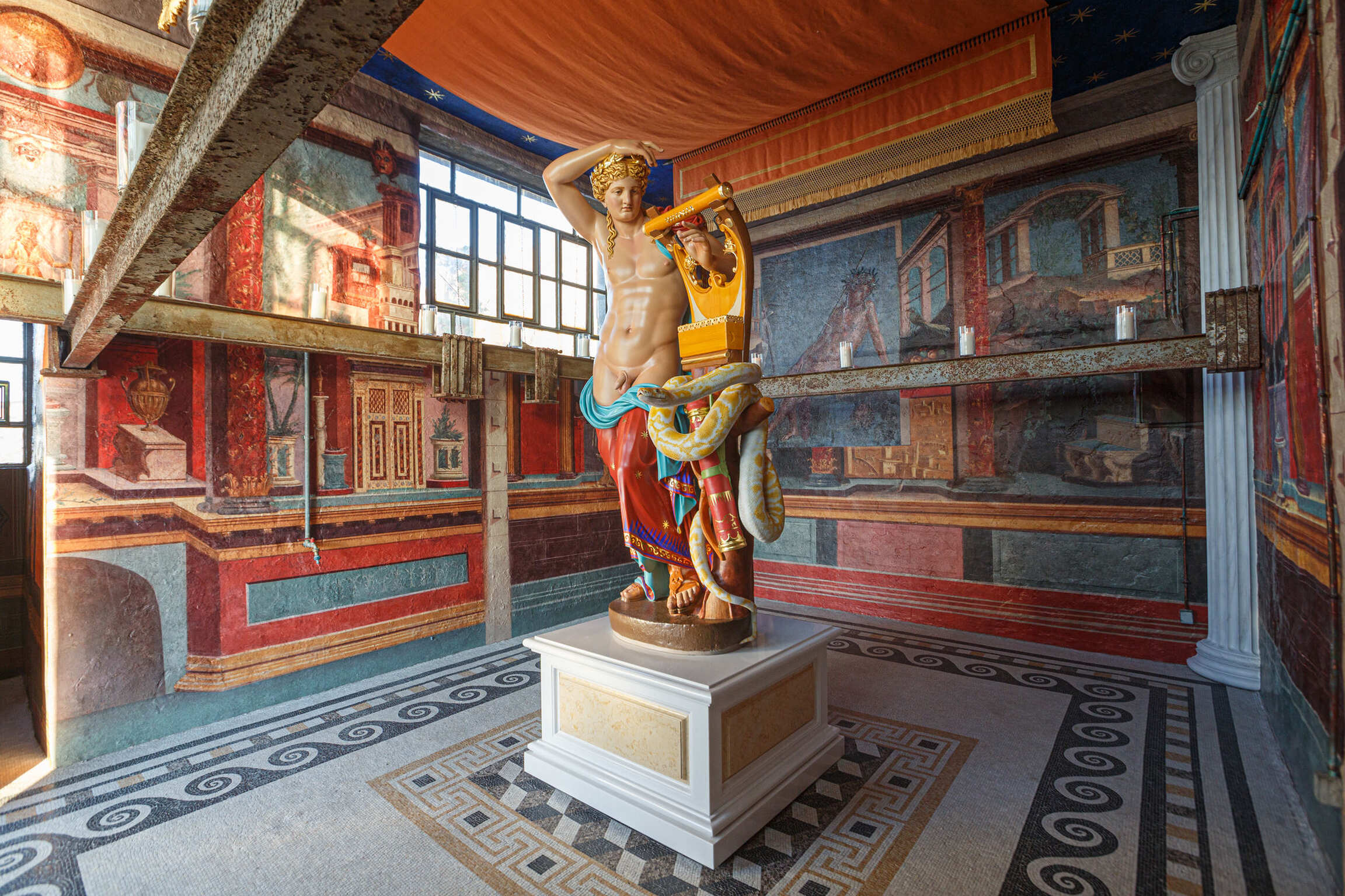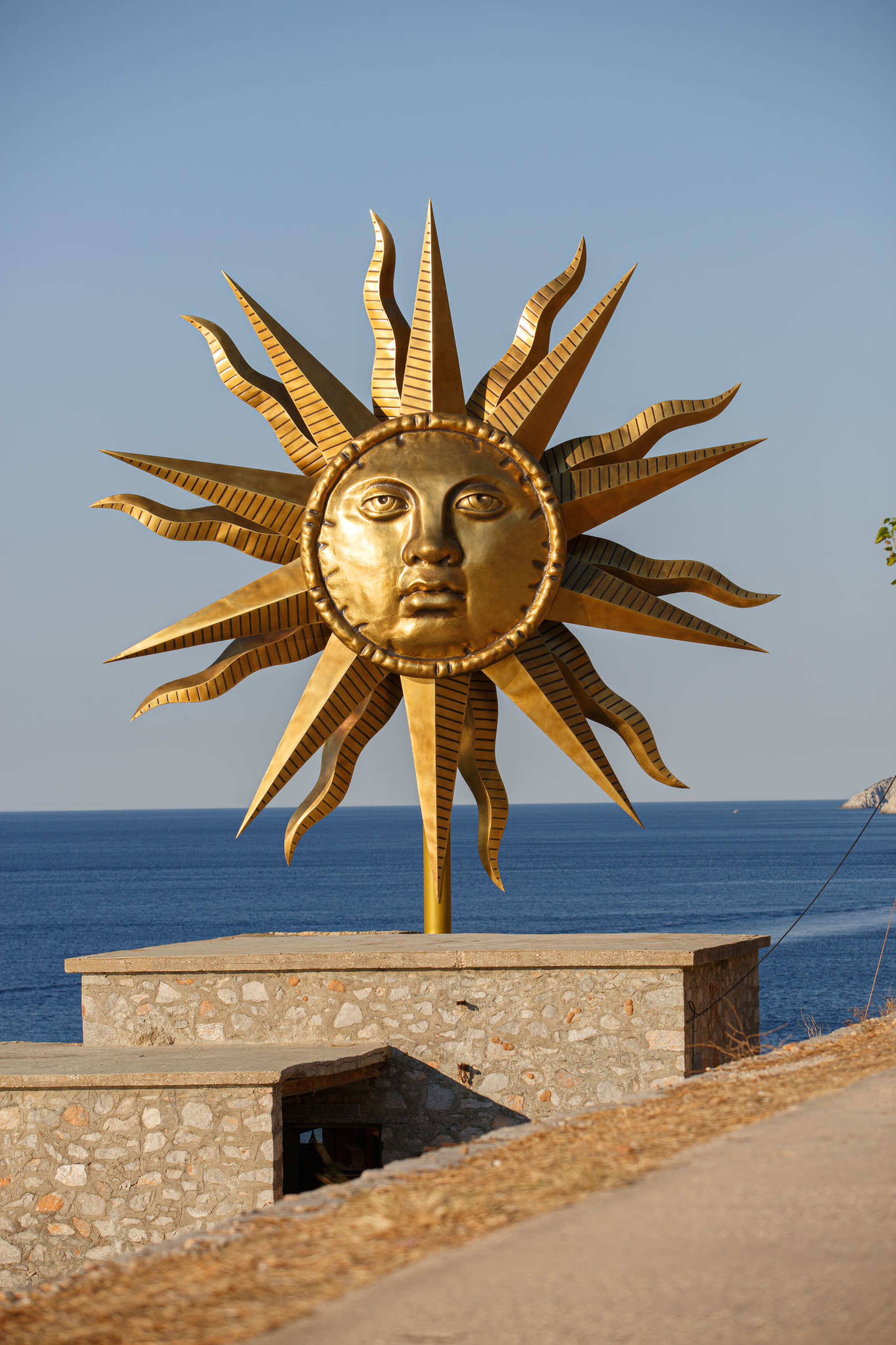 At the center of the installation, within the Slaughterhouse, is the sculpture Apollo Kithara (2019–2022). The Apollo is playing a kithara, which is considered the origin of today’s guitar. The polychromed animatronic sculpture stands over 2.3 meters tall. The walls within the Slaughterhouse have been transformed by using as the base the ancient frescoes from Boscoreale, near Pompeii. The exhibition includes several other new works including a pair of bronze Nike sneakers, Gazing Ball Tripod (2020–2022), and Plato’s Solid Forms Wind Spinners (2020–2022). There are other elements that are corresponding to this installation, ranging from burning candles to a Duchampian reference of a urinal. Above the Slaughterhouse is Apollo Wind Spinner (2020–2022), a 9.1 meter (30-foot) wide reflective wind spinner that greets people entering the port of Hydra on one side and, on the other, welcomes people walking to the building housing the installation. The face of the wind spinner is that of Apollo.