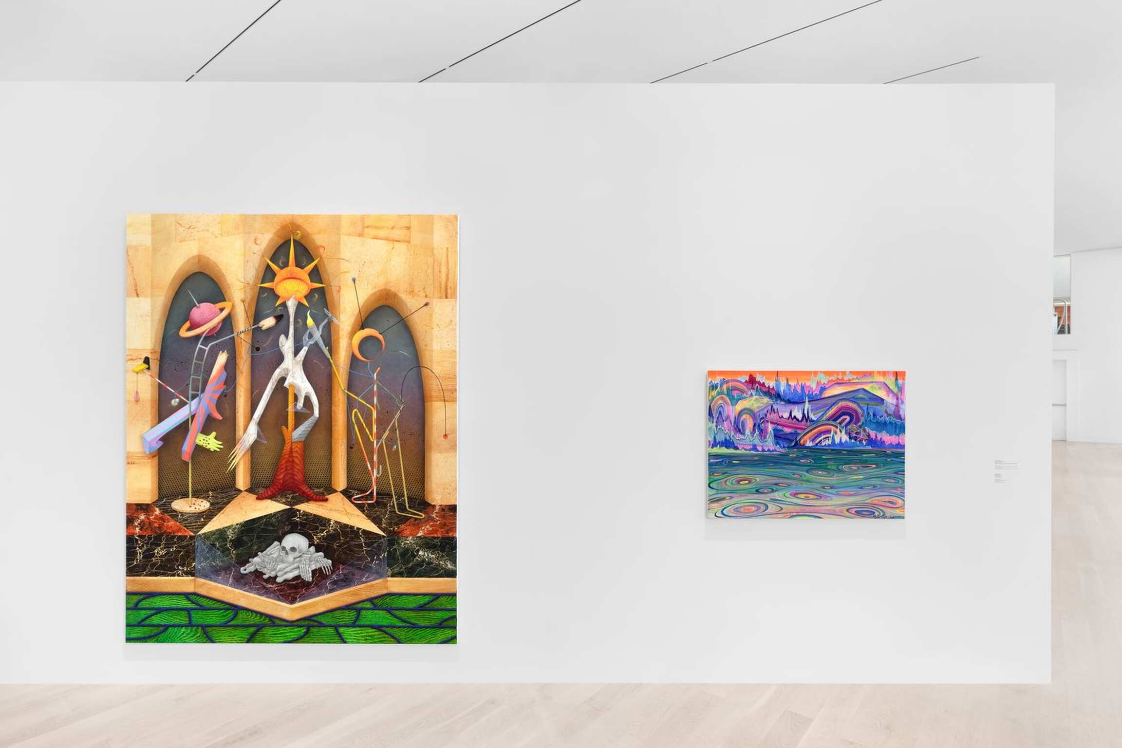 Spanning nearly the entirety of the museum’s exhibition space, “Fire Figure Fantasy” revolves around important focal points of ICA Miami’s collection: social justice, newly emerging technologies, and recent global crises that challenge and reconfigure museum institutions themselves. The exhibition opens with this last theme, bringing together a group of artists interested in engaging, interpreting, and rewriting institutional histories by shifting and diversifying entrenched art historical precedents. An entry point is Henry Taylor’s large-scale painting The Last Supper (2018), which examines race and labor, employing the conventions of history painting, while in Label QualiParis (2020), Esteban Jefferson considers the flawed and fictitious foundation of the Western canon. Throughout the exhibition, artists working in a wide range of mediums, including McArthur Binion, Lauren Halsey, Rashid Johnson, Cameron Rowland, and Sable Elyse Smith, draw on the strategies of conceptual art to critically explore structures that perpetuate injustice on a systemic level.