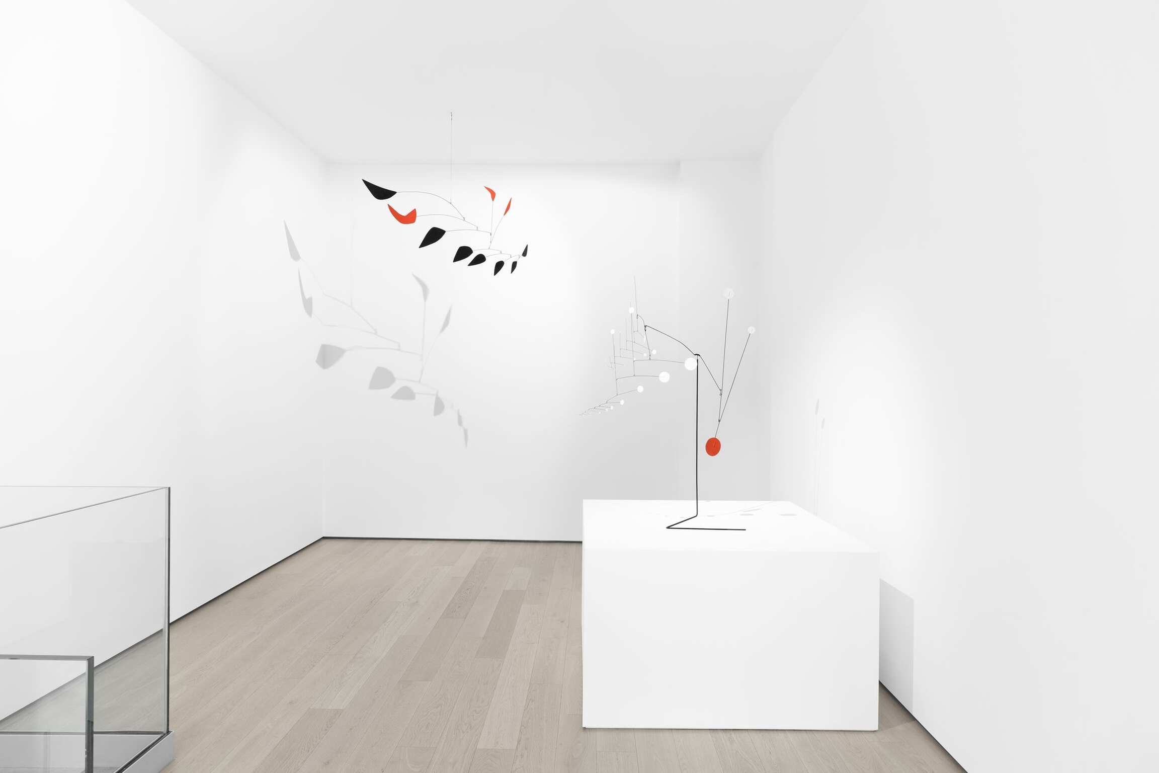 Also included is Puntos Blancos (1955), a standing mobile where the moving elements sit atop a graceful wire base. In 1955, Calder paid an extended visit to Venezuela, where he had been commissioned to create an acoustic ceiling for the auditorium at the Universidad Central de Venezuela in Caracas, designed by his friend, the architect Carlos Raúl Villanueva. The exquisite curvature of the filament base hearkens back to Calder’s wire sculptures made in the 1920s and early 1930s, the nascent years of his career. The discs balancing upon it bob with the musicality of a corps de ballet, recalling the euphonic project that brought Calder to South America.