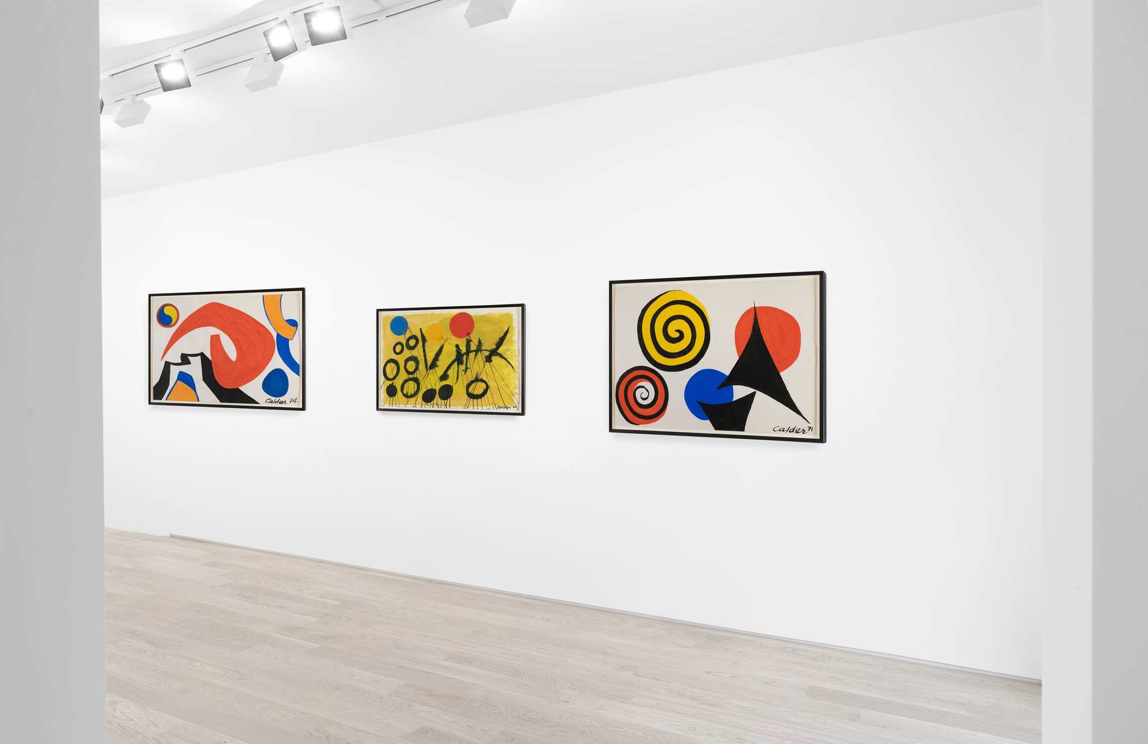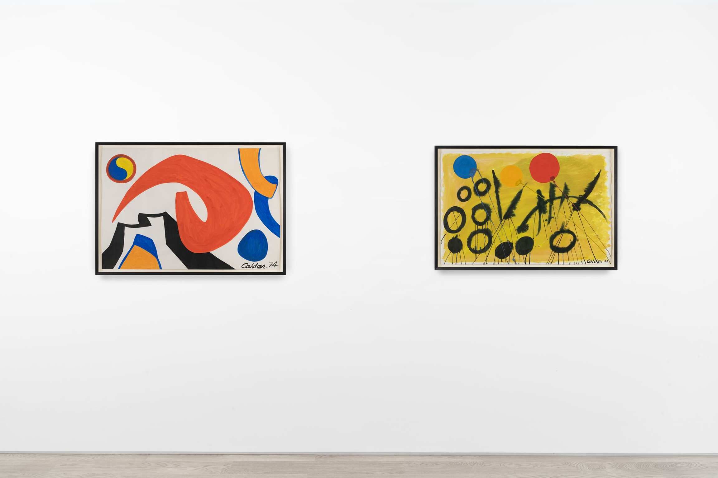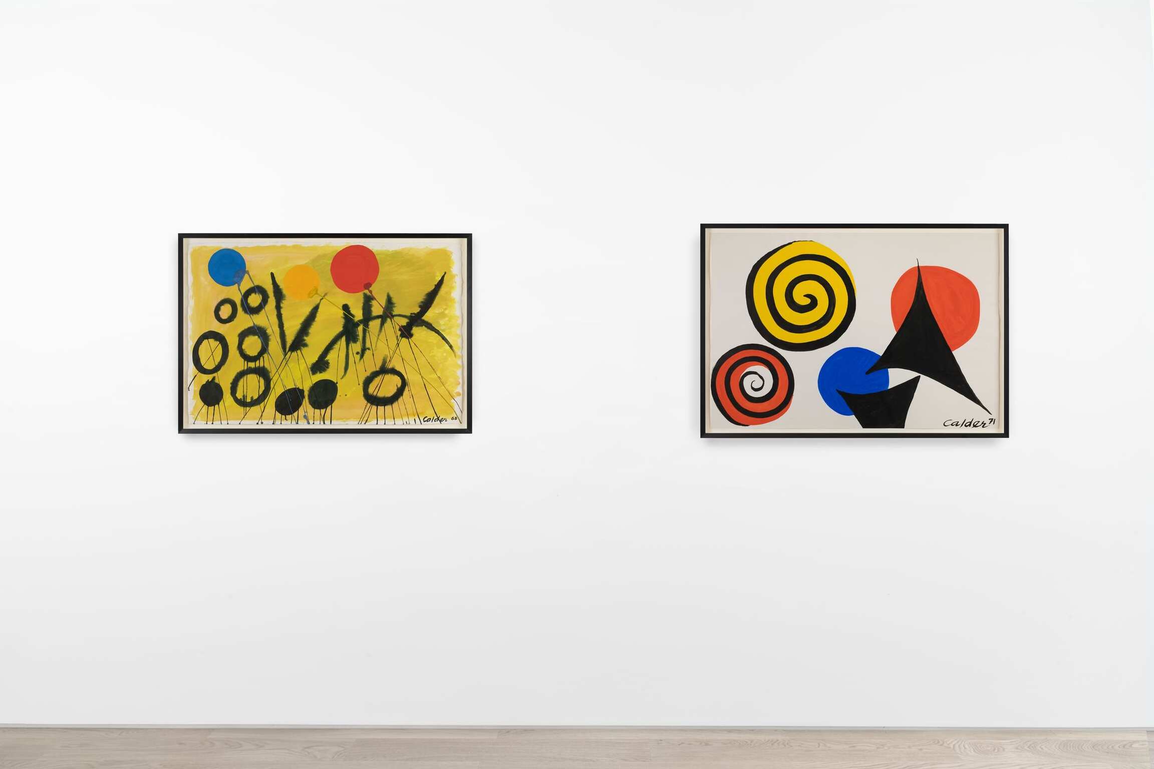A collection of Calder’s gouache works round out the exhibition. As masterful working in two dimensions as he was in three, the artist had a penchant for muscular color and strong forms. Many of them underscore Calder’s commitment to abstraction, such as Untitled (1963), a painting bisected by glorious swaths of citrine- and tomato-hued pigment, and overlaid by washy, black orbs that seem to float in space much as the elements of a mobile do. Once again, the spiral figures prominently, this time in a gouache dating from 1970. It takes the shape of a snake coiling in upon itself, an illusionistic image that also conjures a spinning ratchet wheel the longer one’s eye lingers upon it.