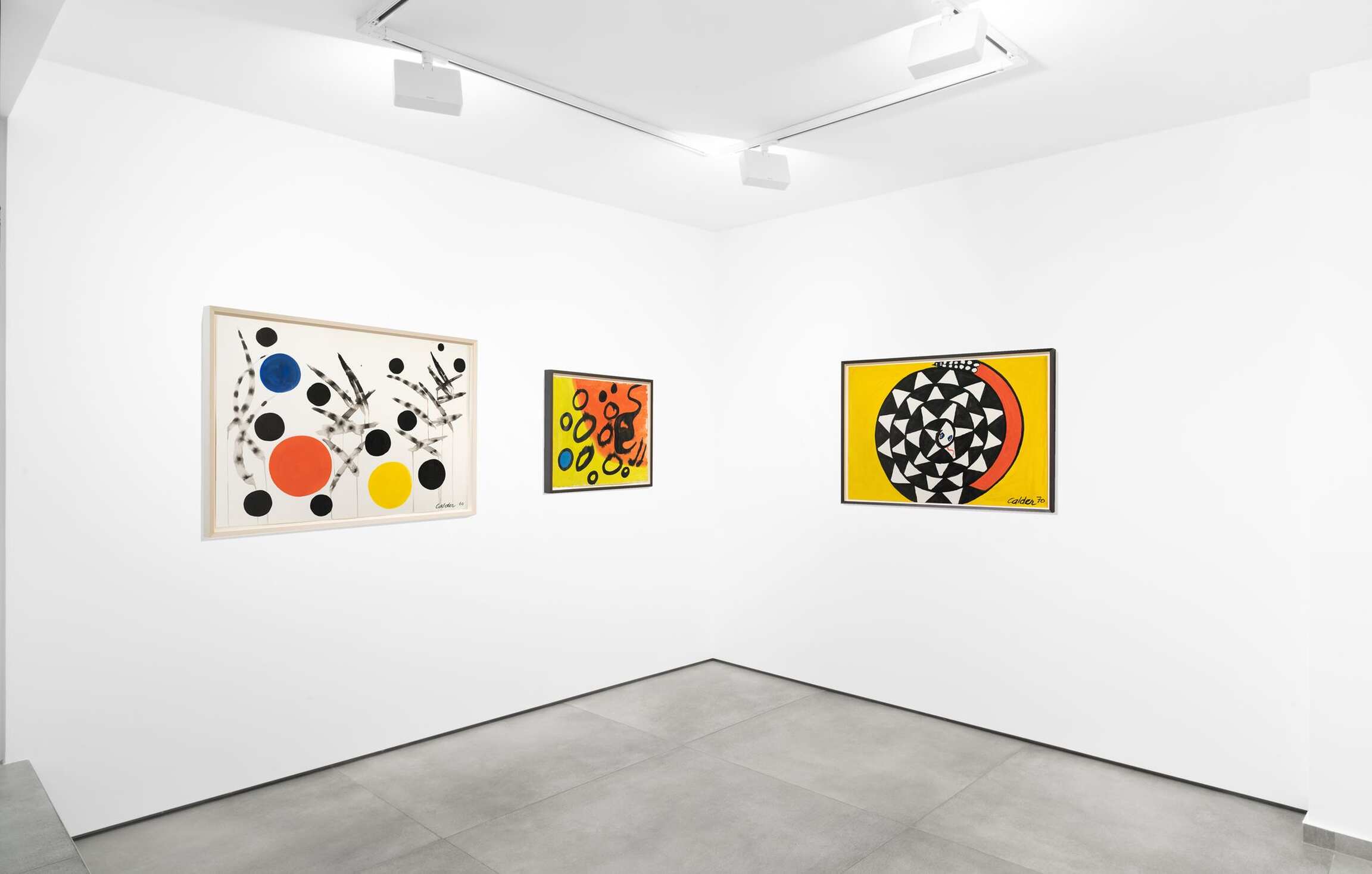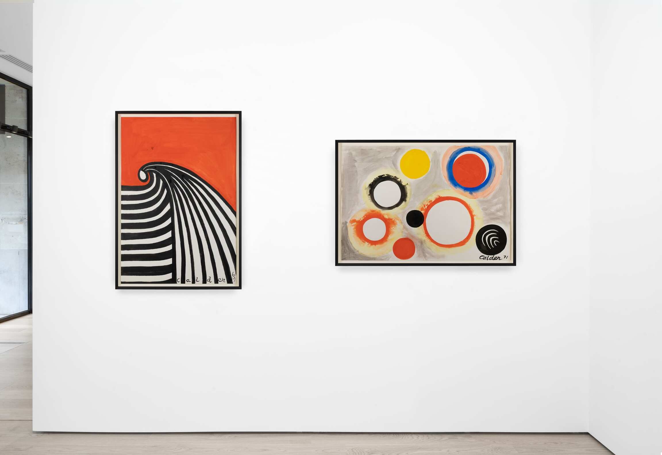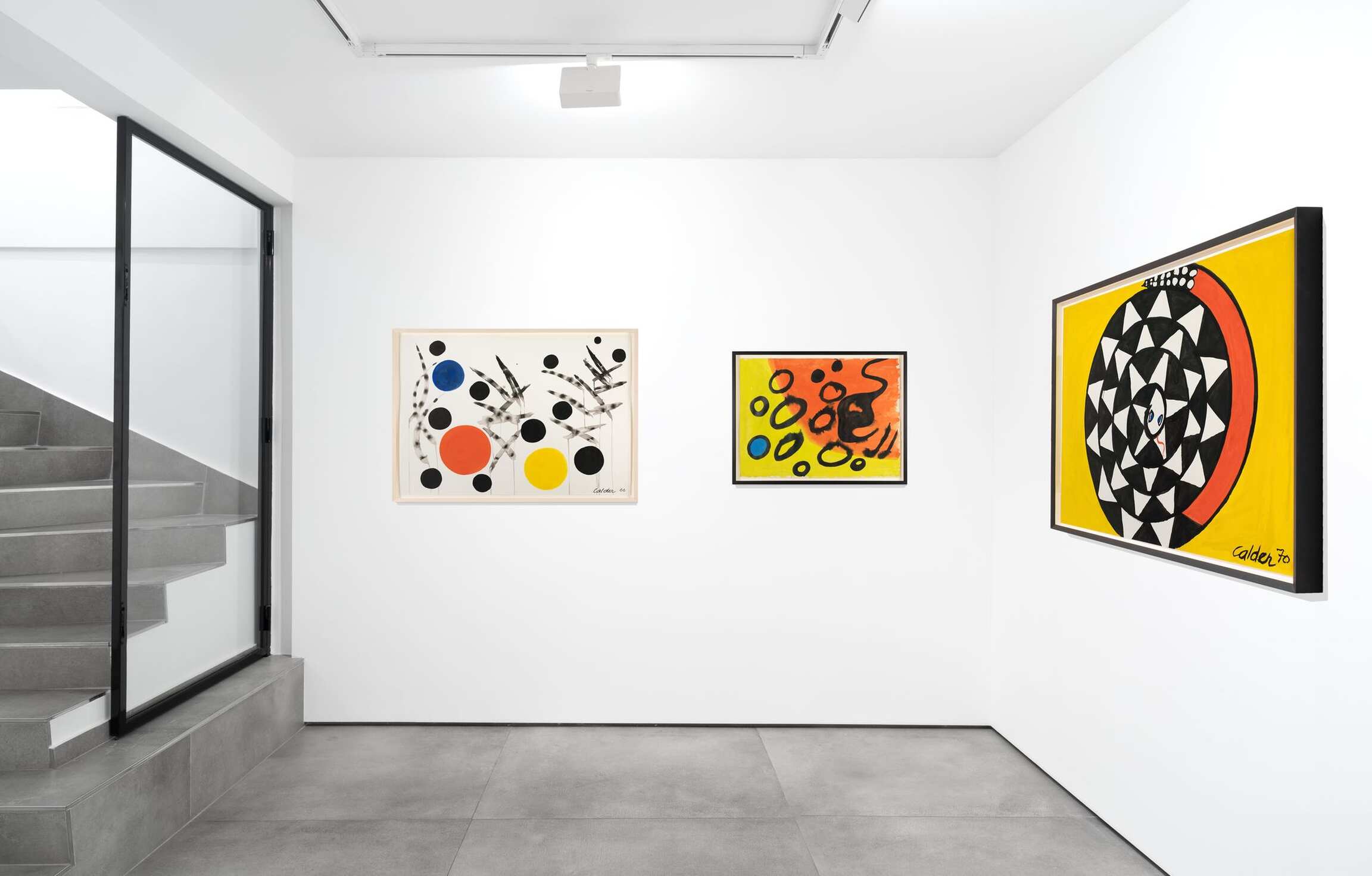 A collection of Calder’s gouache works round out the exhibition. As masterful working in two dimensions as he was in three, the artist had a penchant for muscular color and strong forms. Many of them underscore Calder’s commitment to abstraction, such as Untitled (1963), a painting bisected by glorious swaths of citrine- and tomato-hued pigment, and overlaid by washy, black orbs that seem to float in space much as the elements of a mobile do. Once again, the spiral figures prominently, this time in a gouache dating from 1970. It takes the shape of a snake coiling in upon itself, an illusionistic image that also conjures a spinning ratchet wheel the longer one’s eye lingers upon it.