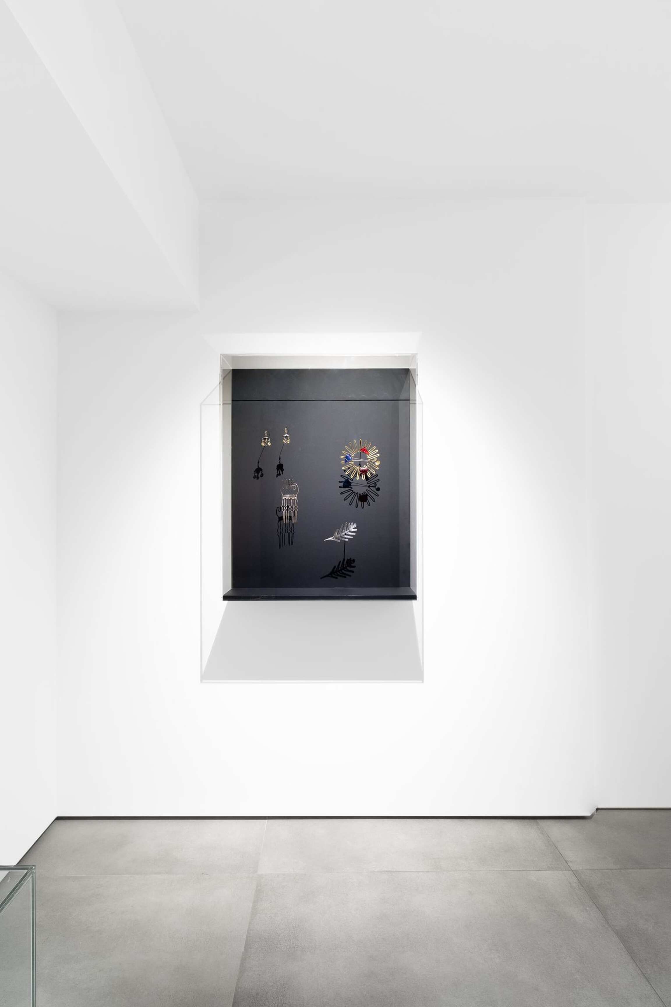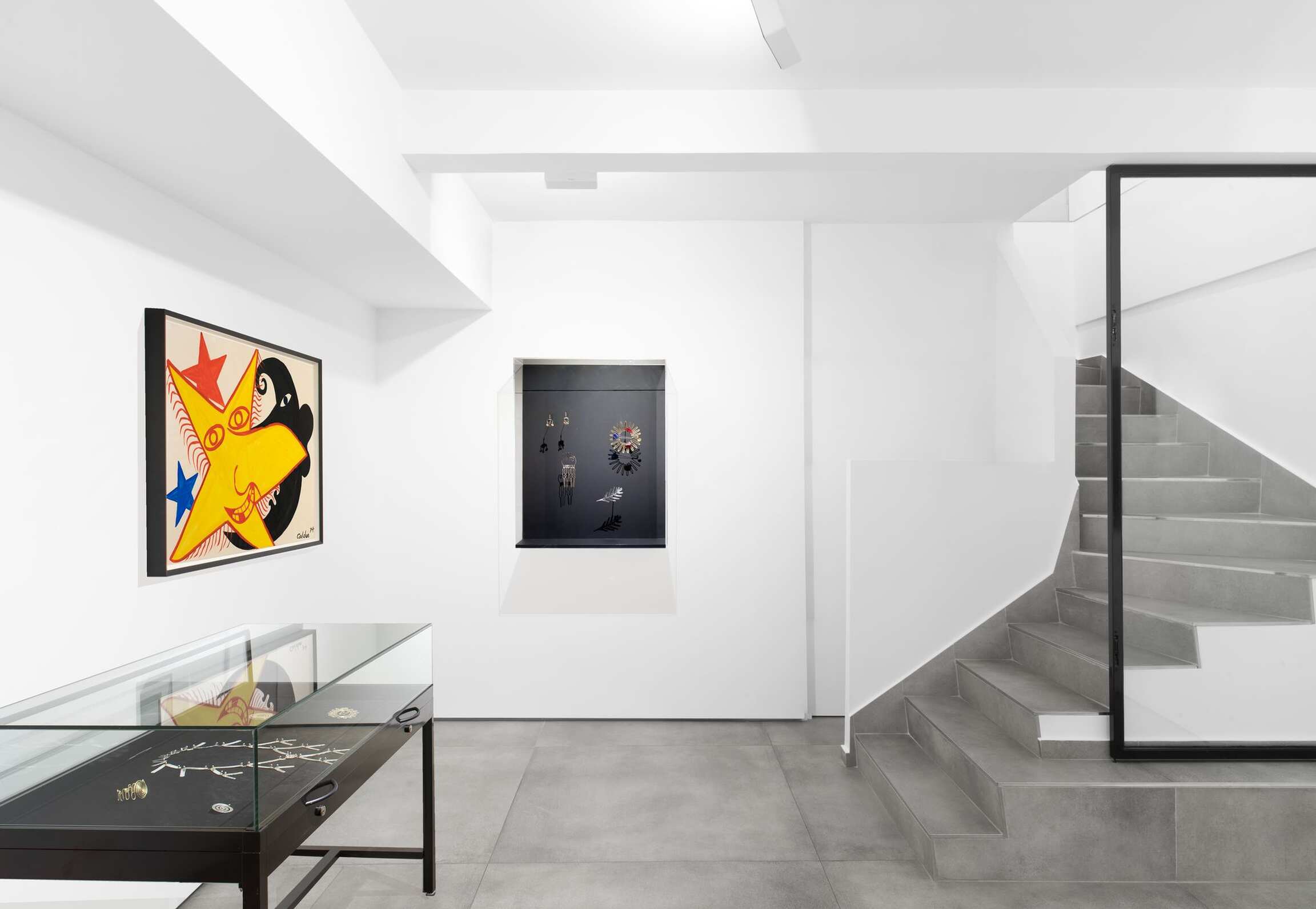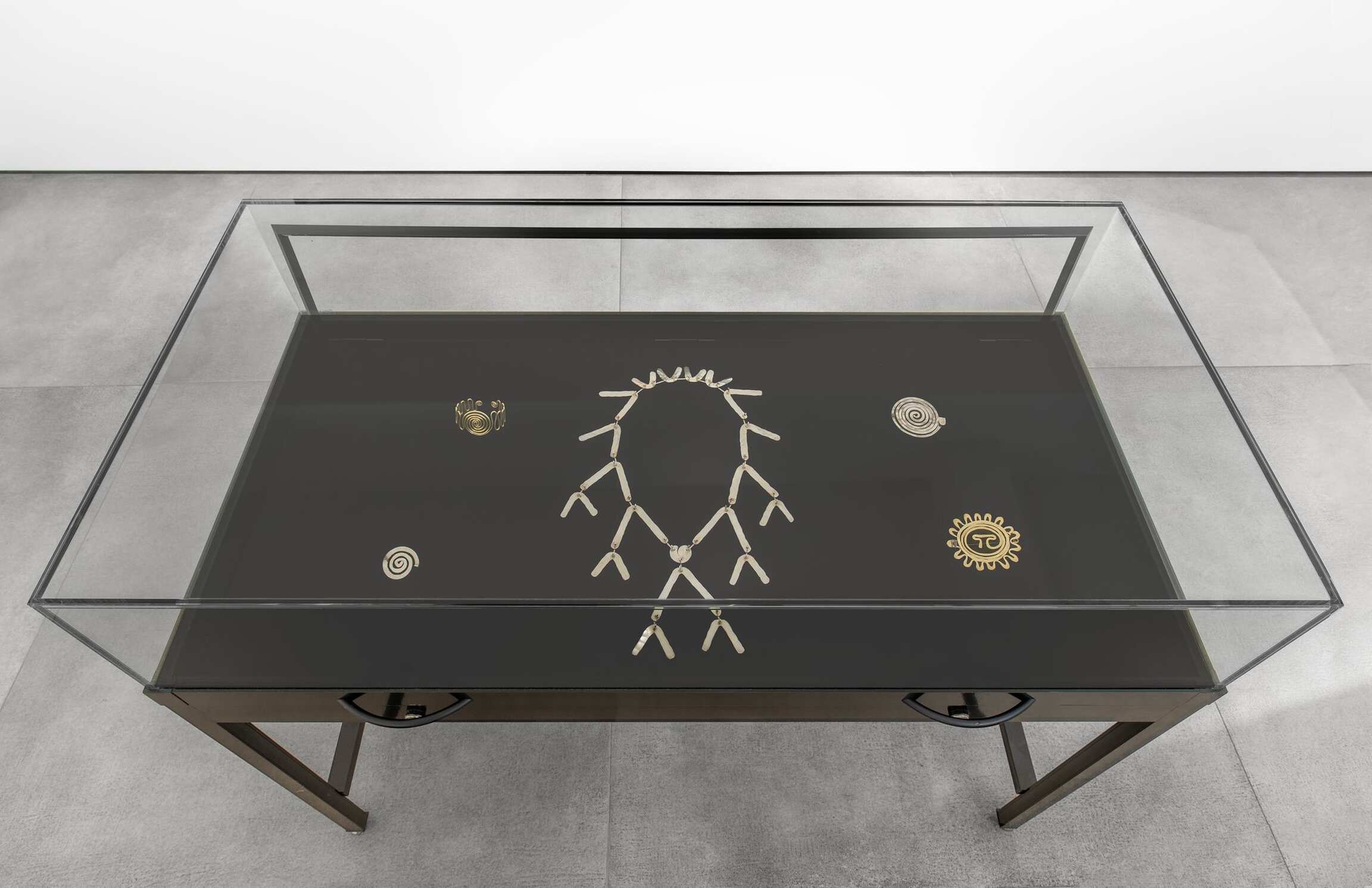 Similarly of note is a figa hair comb. The figa, a clenched fist with the thumb tucked into the forefingers, is a potent symbol of fertility in Brazil. This comb from around 1948 was likely made during the first of Calder's several, extended pilgrimages to the country, when his work was the subject of solo exhibitions in both São Paulo and Rio de Janeiro. The ancient spiral, another important symbol in Calder’s iconography, appears frequently in his jewelry, and can be seen in a number of the brooches, bracelet, and earrings on view.