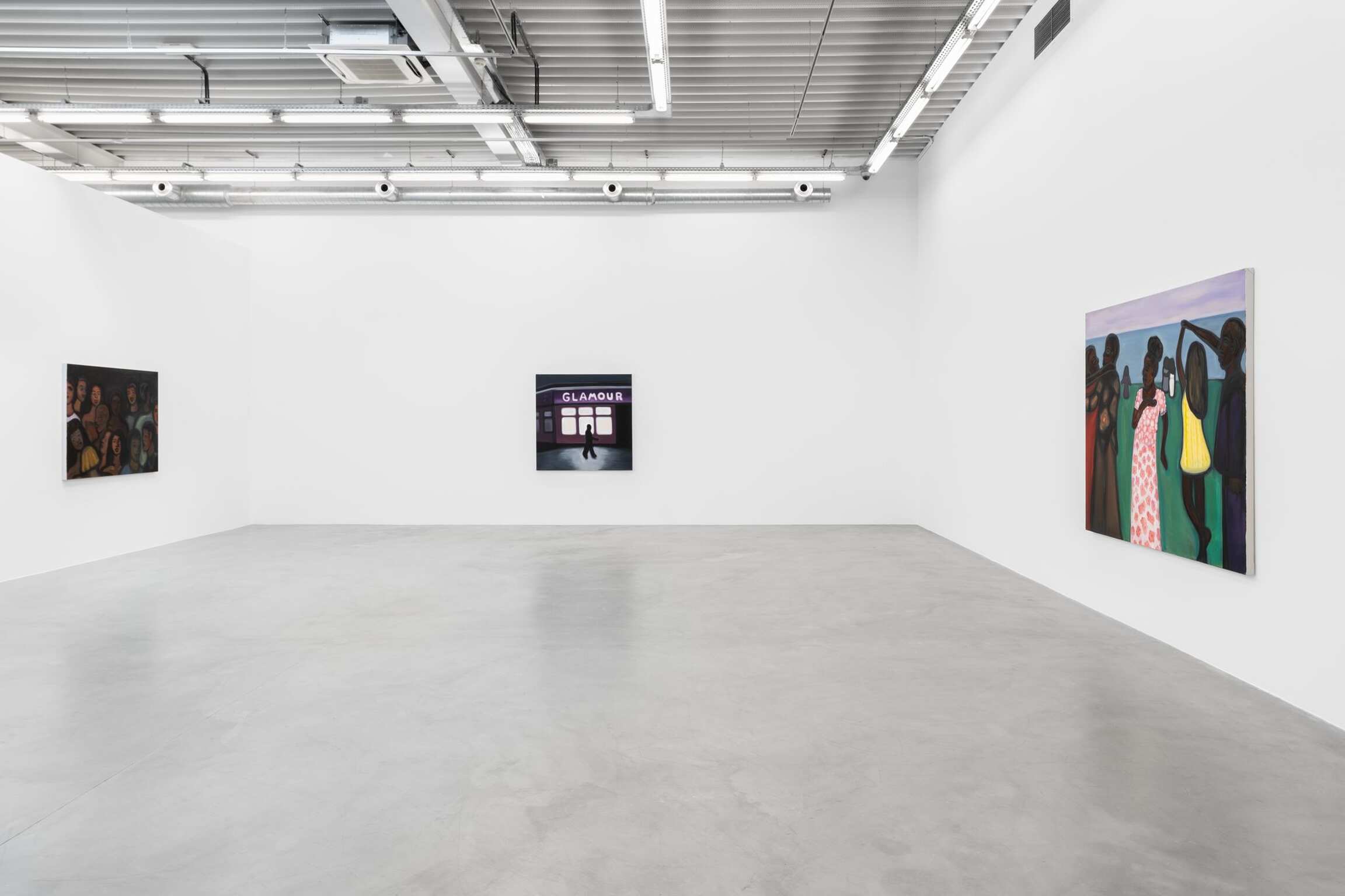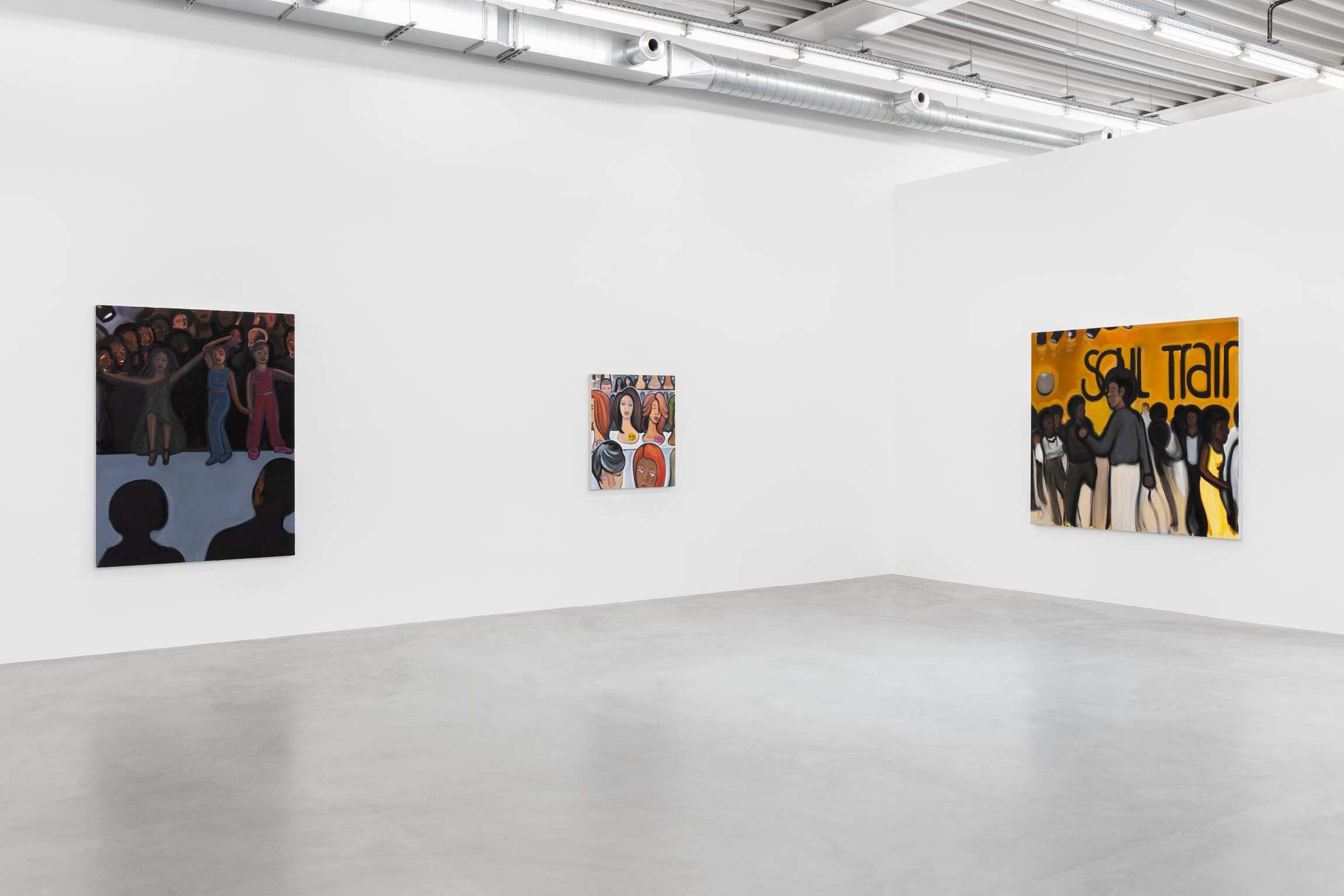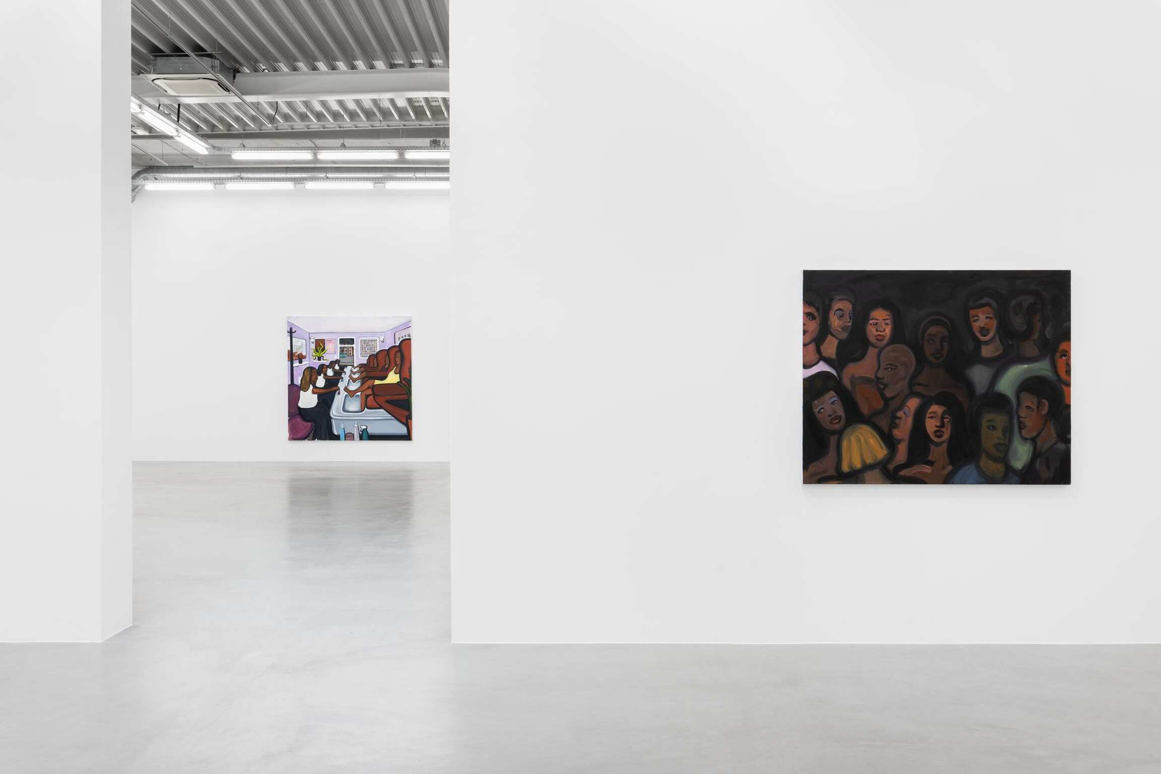 De schilderijen reizen verder, van pruiken en schoonheidsproducten naar het aanbrengen van make-up, en daarna naar drukke nachtclubs en dansvloeren. De dynamiek van menigten is een thema dat steeds terugkeert in de werkwijze van Madelynn Green. Haar schilderijen verkennen de transformatie die optreedt wanneer iemand een sociale ruimte betreedt. De menigten in Dolls onderzoeken de dynamiek tussen openbaar en privé, tezamen met de afrekening van het zelf met het collectief terwijl lichamen ‘zich verliezen in de menigte’. Madelynn Green stelt de vraag: wanneer wordt iemand een lichaam? Schilderijen als Ensemble en Masquerade portretteren compacte lichamen die schoonheid en verlangen uitstralen terwijl ze hun gretige ogen op een podium richten. Het zijn vertoningen op zoek naar een vertoning. Intussen heft Flawless Finish de barrières tussen het performatieve en observationele domein op. In Touch-Up wordt de grens tussen voorbereiding en presentatie verder verdoezeld: een menigte kijkt toe hoe de make-up van een artiest wordt bijgewerkt – nog een barstje in de vernislaag van de pop.