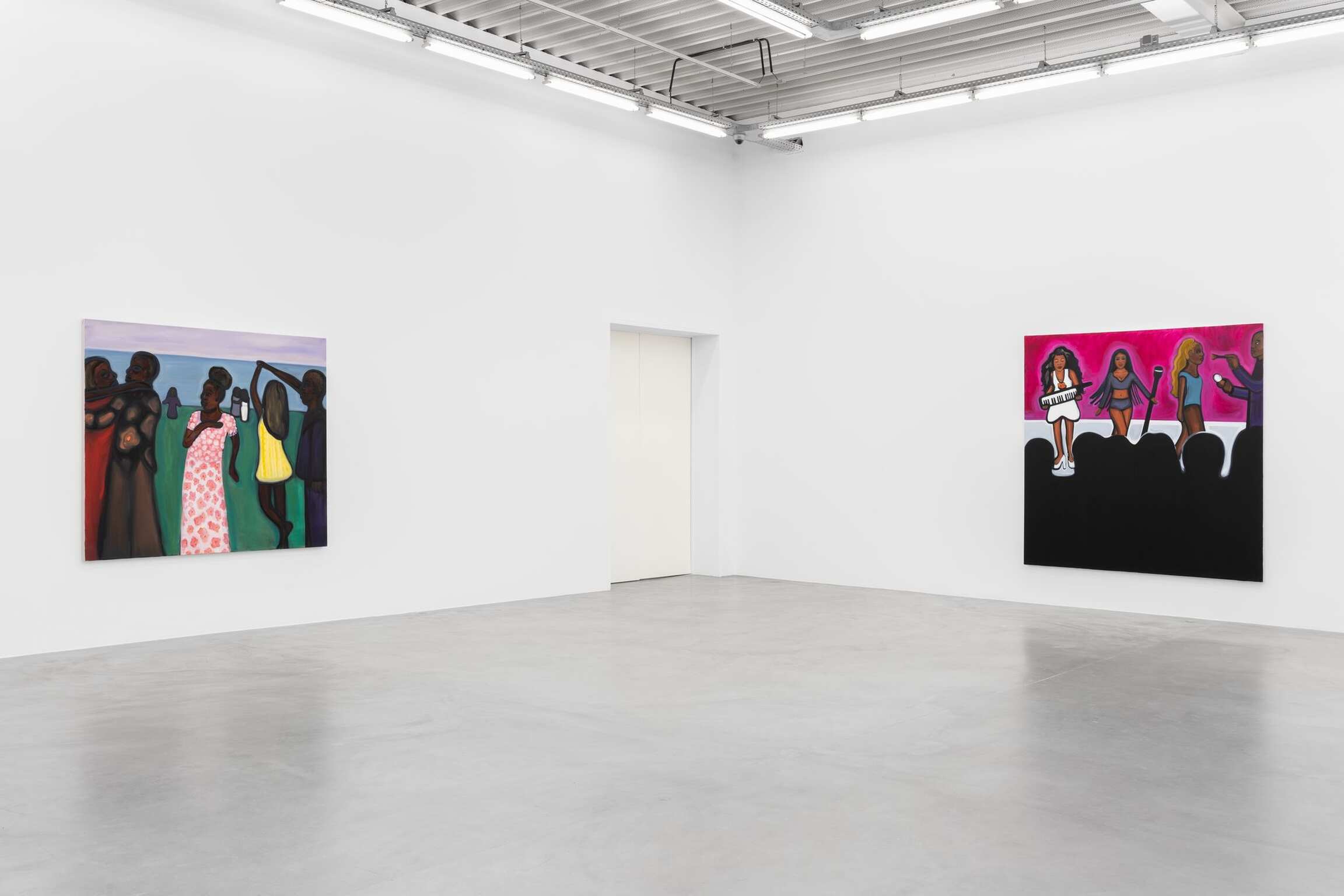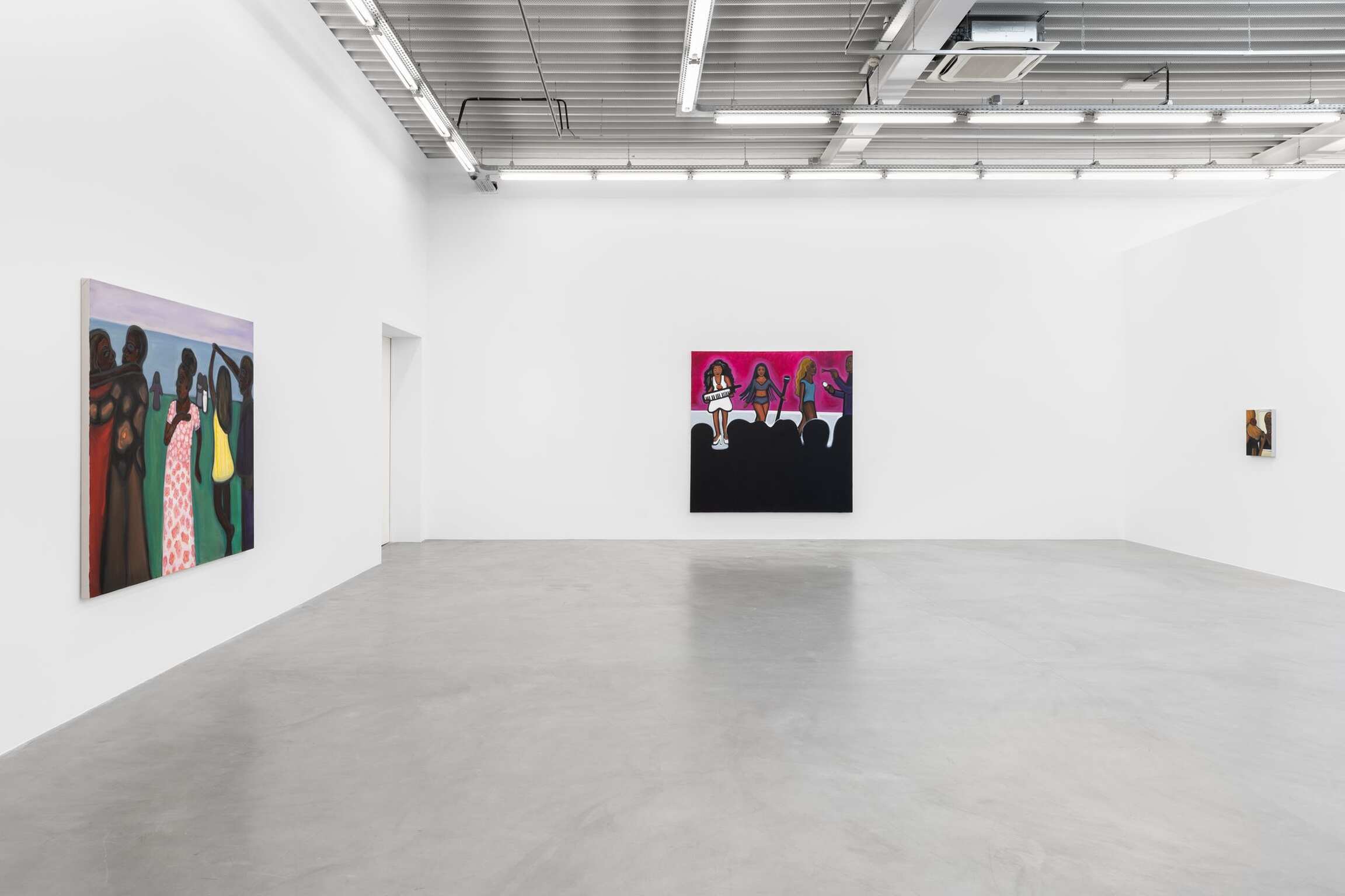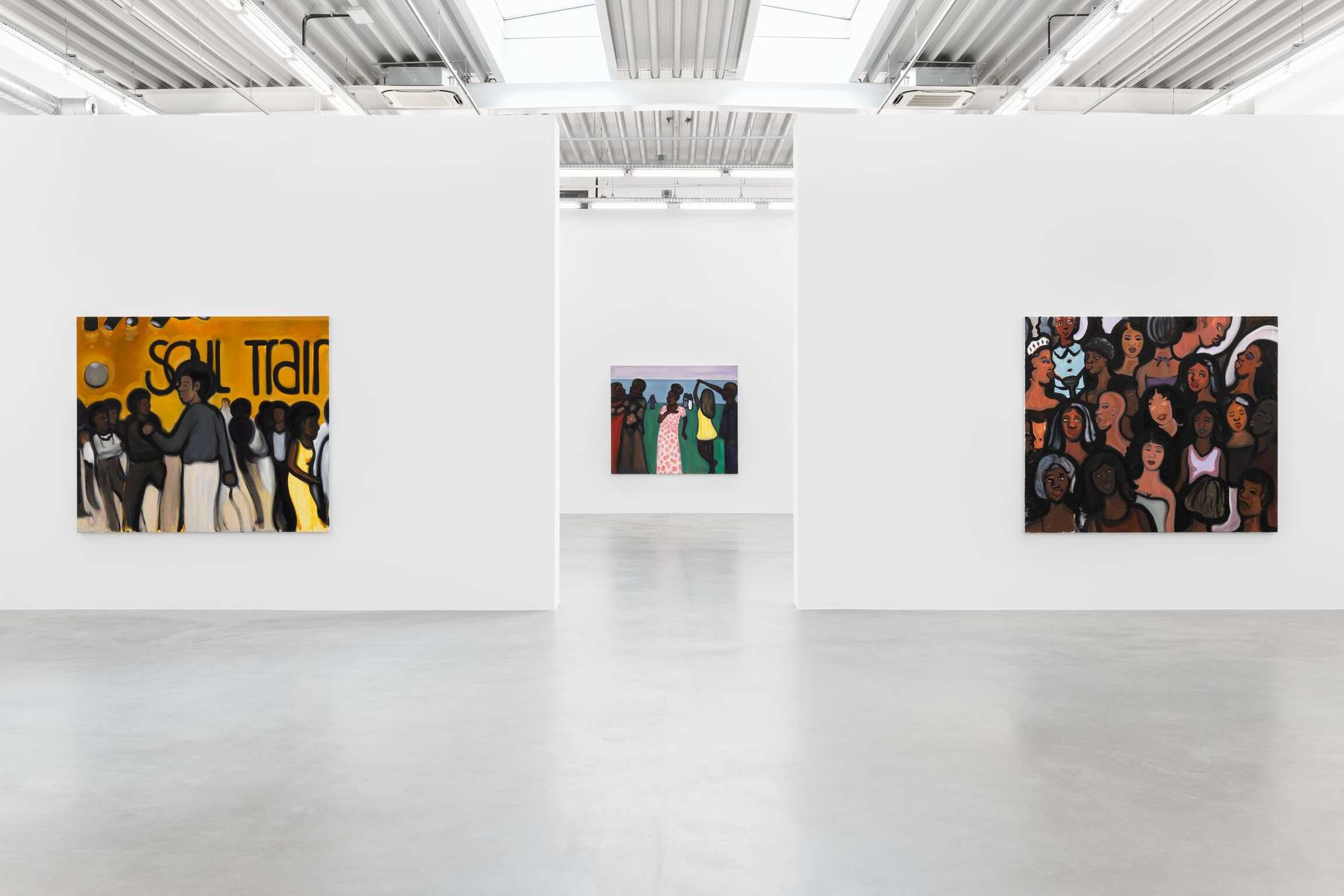 De schilderijen reizen verder, van pruiken en schoonheidsproducten naar het aanbrengen van make-up, en daarna naar drukke nachtclubs en dansvloeren. De dynamiek van menigten is een thema dat steeds terugkeert in de werkwijze van Madelynn Green. Haar schilderijen verkennen de transformatie die optreedt wanneer iemand een sociale ruimte betreedt. De menigten in Dolls onderzoeken de dynamiek tussen openbaar en privé, tezamen met de afrekening van het zelf met het collectief terwijl lichamen ‘zich verliezen in de menigte’. Madelynn Green stelt de vraag: wanneer wordt iemand een lichaam? Schilderijen als Ensemble en Masquerade portretteren compacte lichamen die schoonheid en verlangen uitstralen terwijl ze hun gretige ogen op een podium richten. Het zijn vertoningen op zoek naar een vertoning. Intussen heft Flawless Finish de barrières tussen het performatieve en observationele domein op. In Touch-Up wordt de grens tussen voorbereiding en presentatie verder verdoezeld: een menigte kijkt toe hoe de make-up van een artiest wordt bijgewerkt – nog een barstje in de vernislaag van de pop.