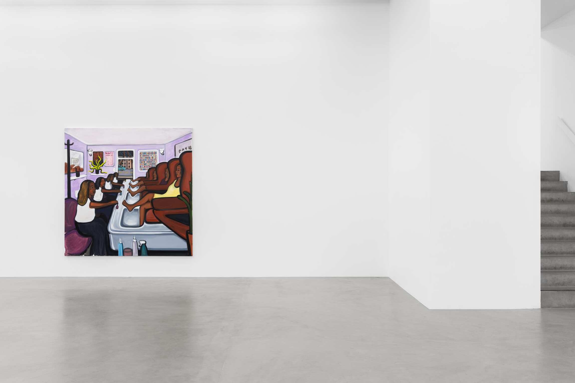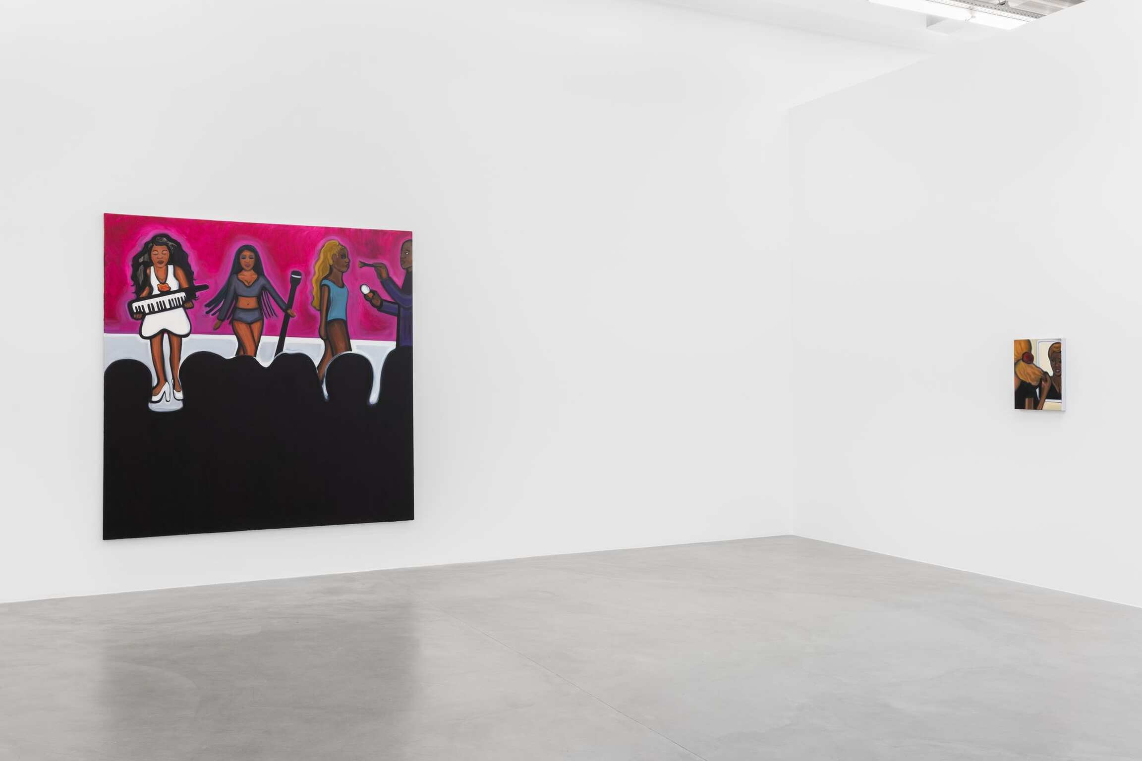 From wigs and beauty tools to applying make-up, the paintings then journey into crowded nightclubs and dance floors. Crowd dynamics have been a consistent theme in Madelynn Green’s practice. Her paintings explore the transformation that occurs when one enters a social space. The crowds in Dolls examine the dynamic between public and private, along with the reckoning of self with the collective as bodies “lose themselves in the crowd.” Madelynn Green asks: when does somebody become a body? Paintings like Ensemble and Masquerade portray compact bodies alight with beauty and longing as they train eager eyes toward a stage. They are spectacles in search of spectacle. Meanwhile, Flawless Finish removes the barriers between the performative and observational realms. In Touch-Up, the line between preparation and presentation blurs further as a crowd sees a performer’s make-up retouch—yet another crack in the doll’s veneer.