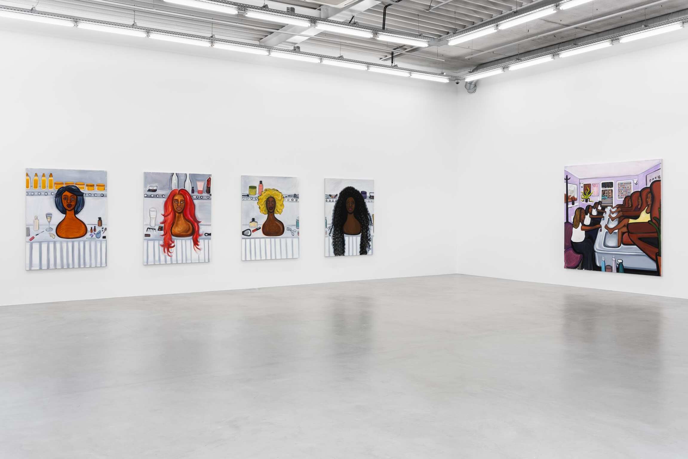 In Female Figures, lifelike mannequins sport flawless wigs and melancholy expressions. They are either offended that they are on clearance, or their pouts hint at something deeper, and perhaps darker. These unsettling plastic "dolls"; are mere canvases of women. Despite the fraudulence of their humanity, they are considered archetypes of beauty. The titular work, a multi-part painting installation called Dolls, is peppered with Black hair products and beauty tools like hair gel, moisturising lotion, eyelash curlers, and tweezers. The metal tools have a clinical look despite performing “surgeries” far more aesthetic than medical, pointing to the clinical precision with which women are expected to style themselves for public consumption.