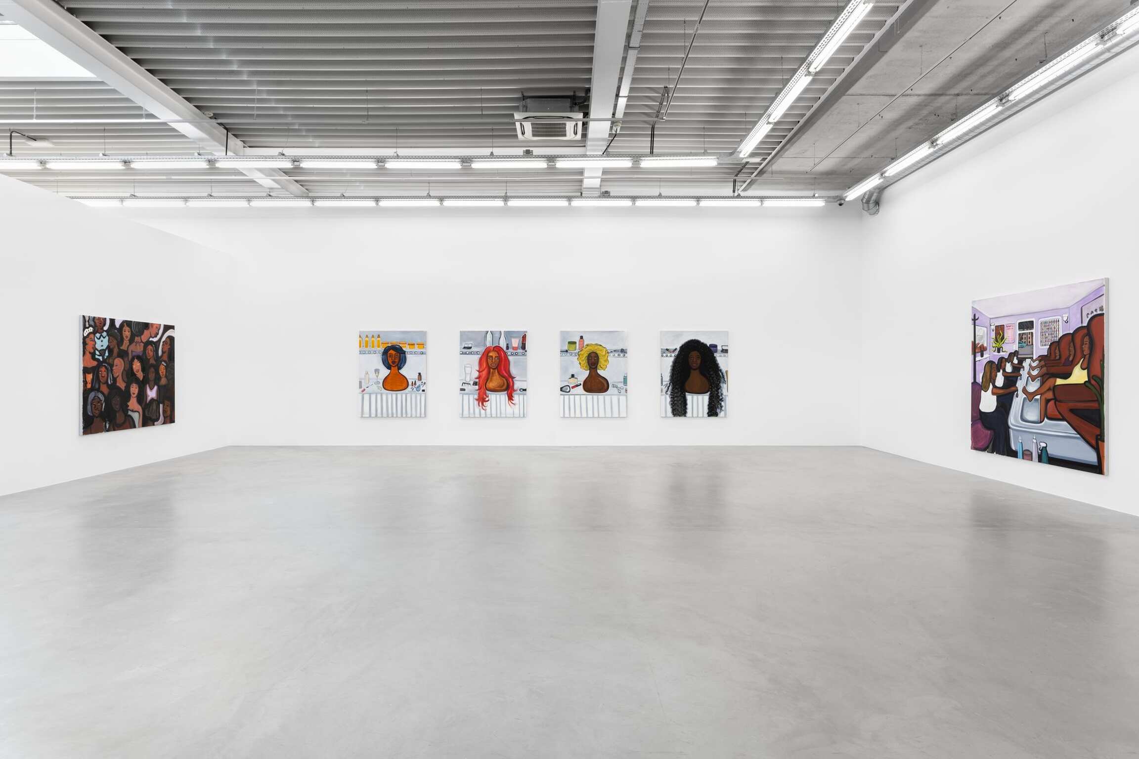 Dans Female Figures, des mannequins réalistes, à l'expression mélancolique, portent des perruques impeccables. Elles sont soit vexées qu'on se débarrasse d'elles, soit leur moue émane de quelque chose de plus profond, de plus sombre peut-être. Ces « poupées » plastique troublantes ne sont que des toiles de femmes. Malgré le caractère frauduleux de leur humanité, elles sont vues comme des archétypes de beauté. L'œuvre titre, une installation multiple de peintures intitulée Dolls, est truffée de produits pour cheveux afro et d’ustensiles cosmétiques tels que gel coiffant, lotion hydratante, recourbes cils et pinces à épiler. Les outils métalliques ont une apparence clinique bien que les « chirurgies » qu'ils opèrent soient bien plus esthétiques que médicales, soulignant la précision clinique avec laquelle les femmes sont sensées se préparer pour la consommation publique. Spectacles fait allusion à l'extravagance des possibilités que nous avons à notre disposition pour nous présenter en public. Ces nombreux choix, s'ils sont libérateurs, peuvent aussi être étourdissants.