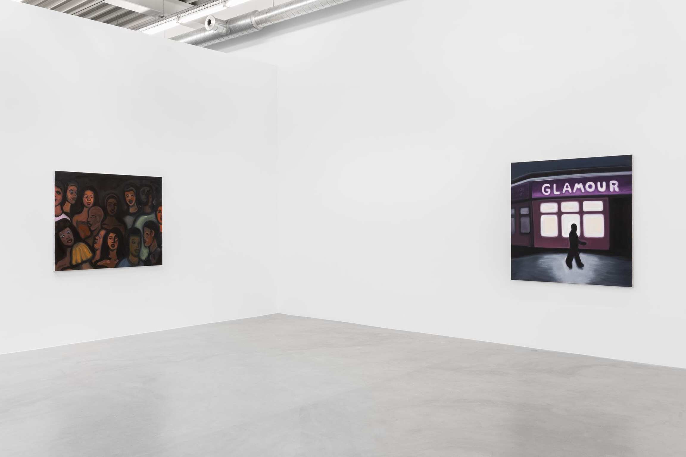 Au premier plan de Glamour, on voit une figure solitaire, sombre, sur un fond de salon flamboyant affichant et affirmant son nom éponyme. Le personnage lugubre de cette peinture est la dernière étape avant sa transformation en poupée. Il n'y a rien de glamour à rentrer seule chez soi, tard dans la nuit, en titubant, l'estomac se plaignant de l'excès d'alcool ou de la faim. Besoin de nourriture ou de quelque chose de moins tangible. C'était peut-être cette faim qui, dès le départ, vous a motivée à vous pomponner comme une poupée devant le miroir quelques heures auparavant, recourbant vos cils et ajustant cette perruque. Cette faim aussi qui vous a amenée à vous serrer dans une foule humide et à vous joindre à son rythme enivrant dans une sorte de bonheur exhibé. Une faim qui vous a pris des heures, à peindre des yeux pour regarder ailleurs. Une faim insatiable enfin qui, même sur le sombre chemin du retour, reste affichée dans les rues à travers ces promesses de glamour – ce concept vague de beauté que peu semblent pouvoir atteindre, peu importe la hauteur des talons.
